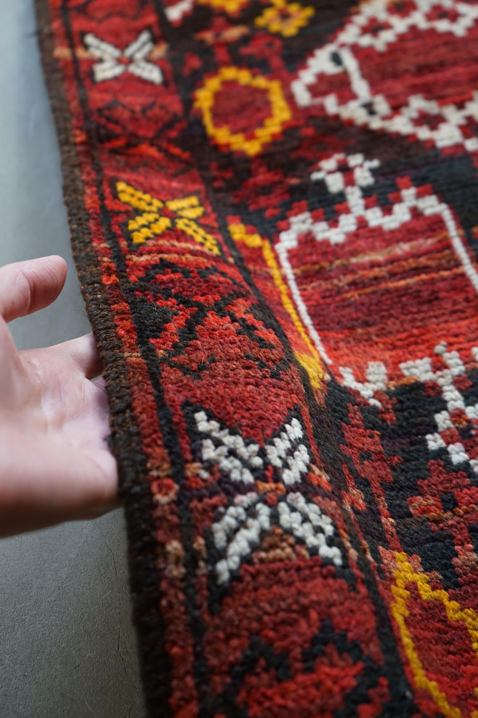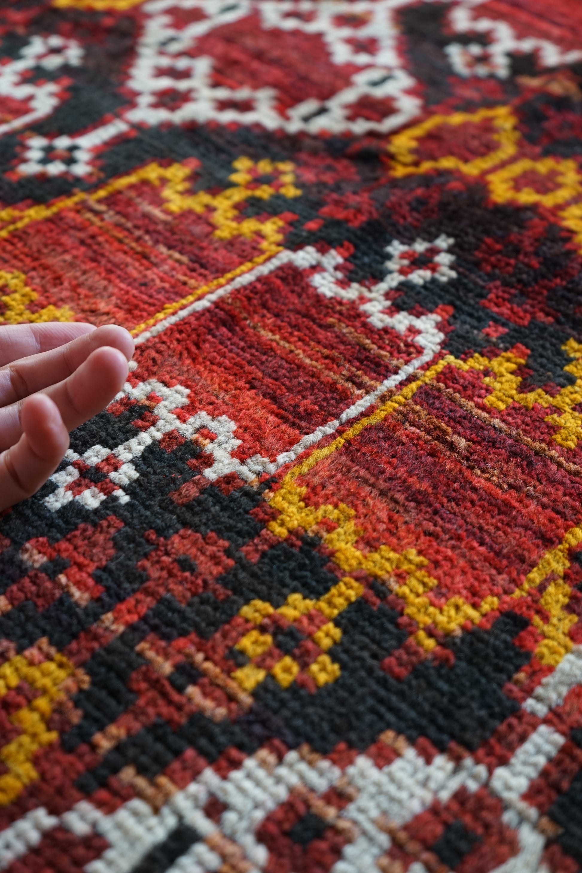 ブラック、レッド、イエローにホワイトとカラーバランスがクリーンで心地好いです。しっかりと染まった濃色とふっくらとした羊毛素材の組み合わせが非常に魅力的です。