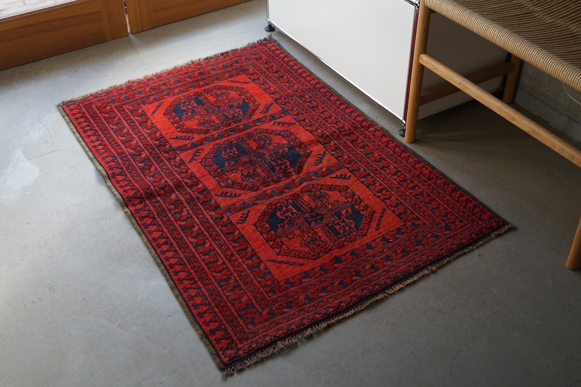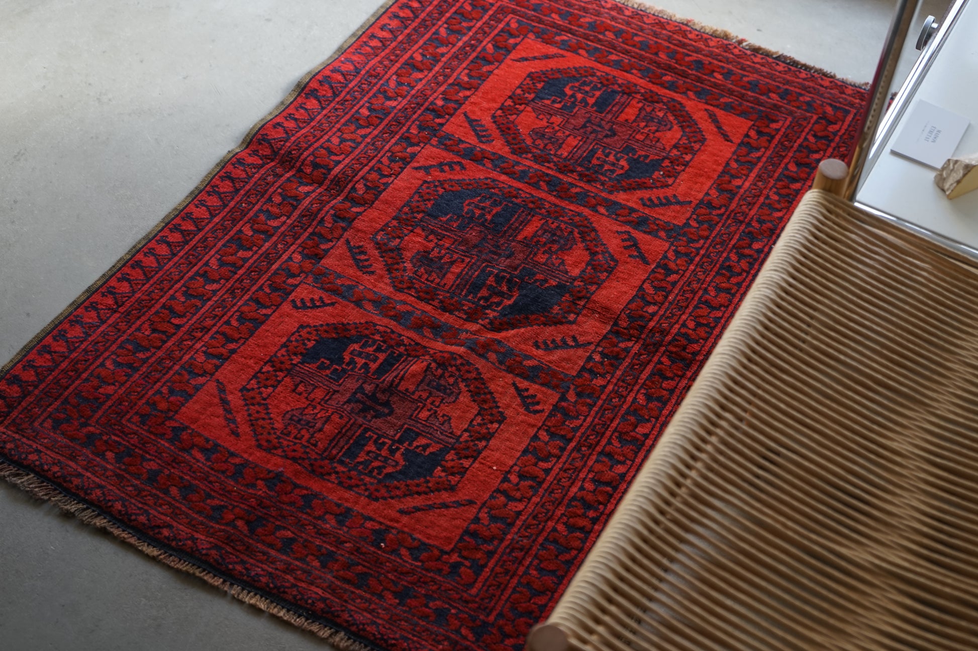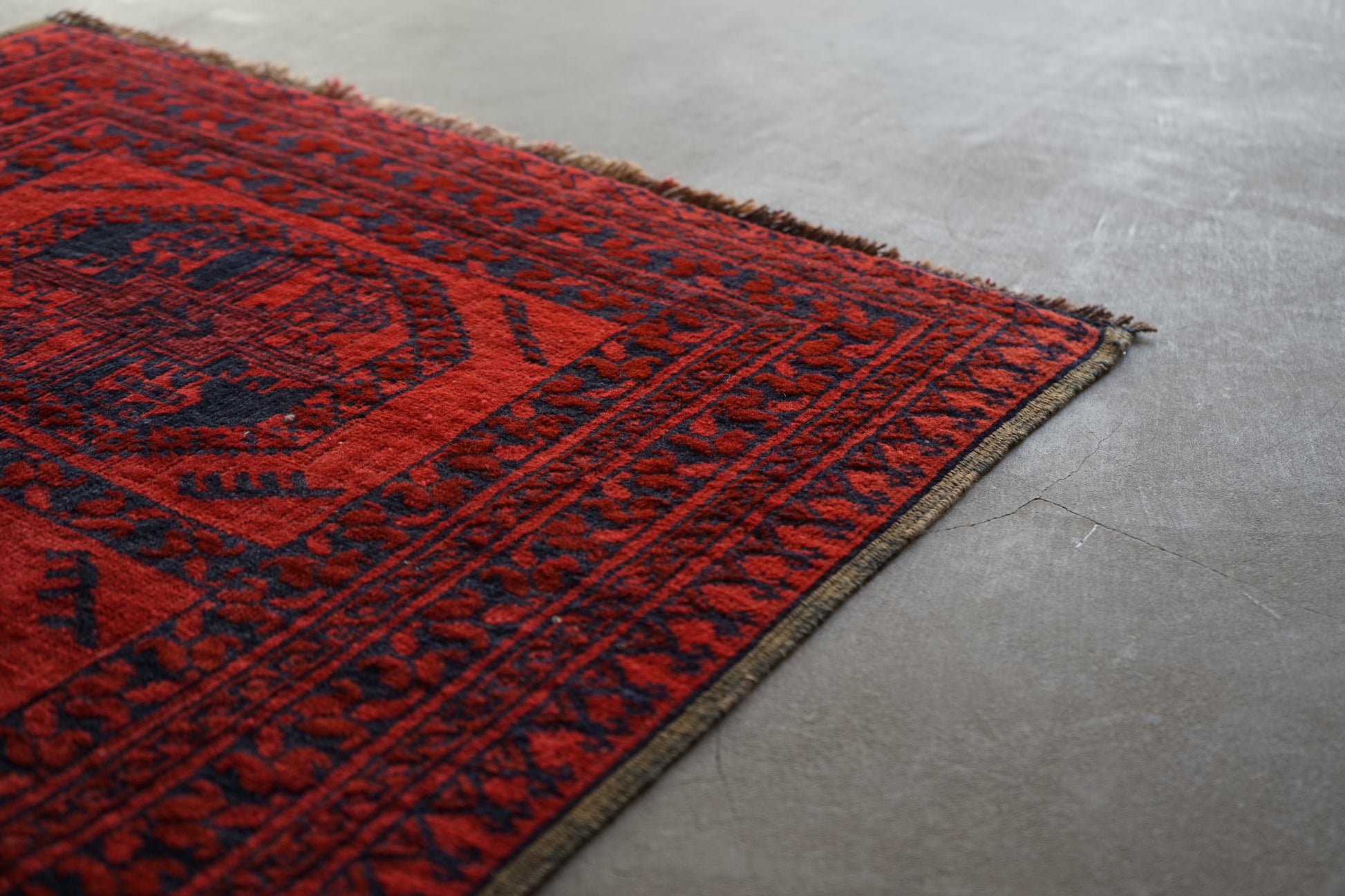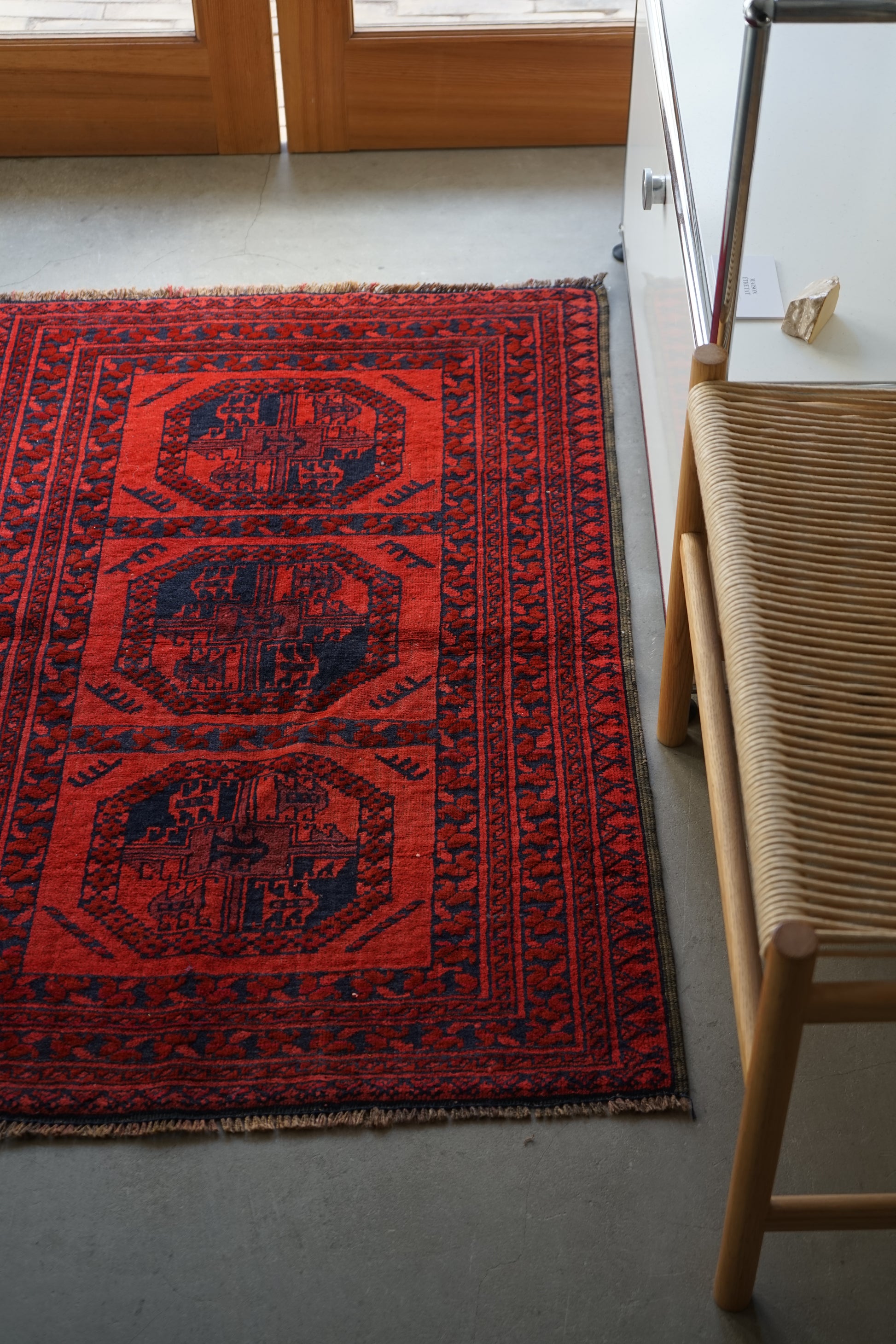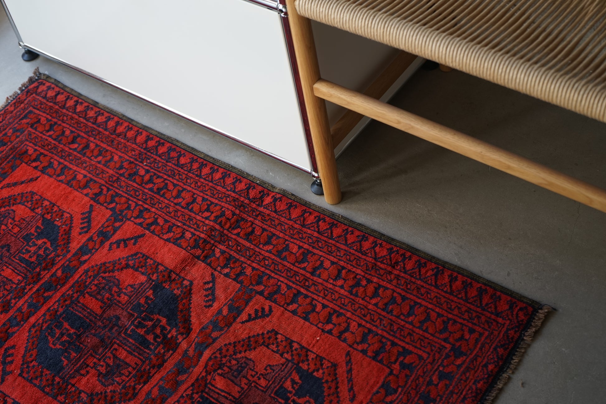 シックなアフガントルクメンです。しっとりとした羊毛、そして薄くてしなやかな佇まいです。