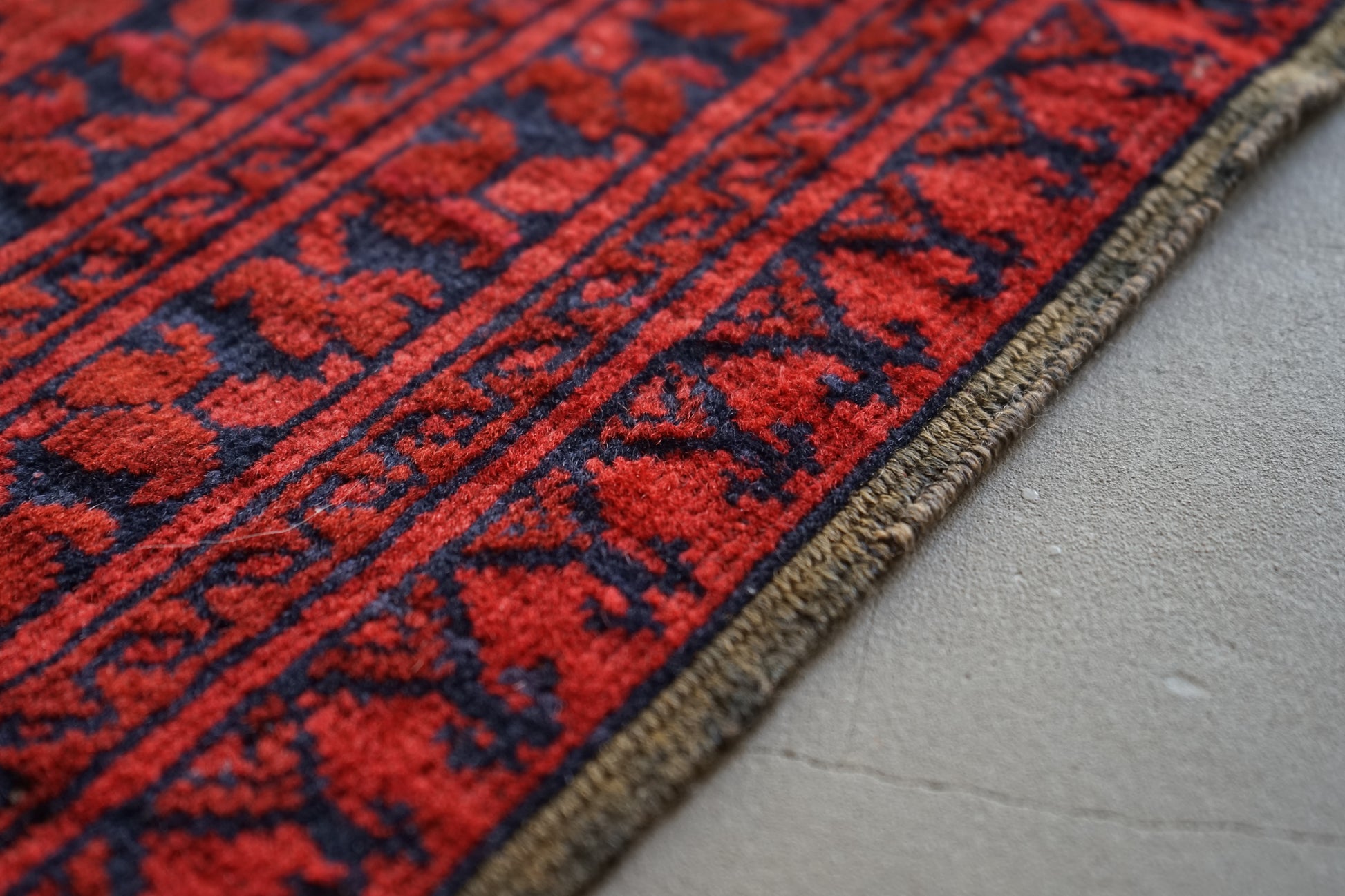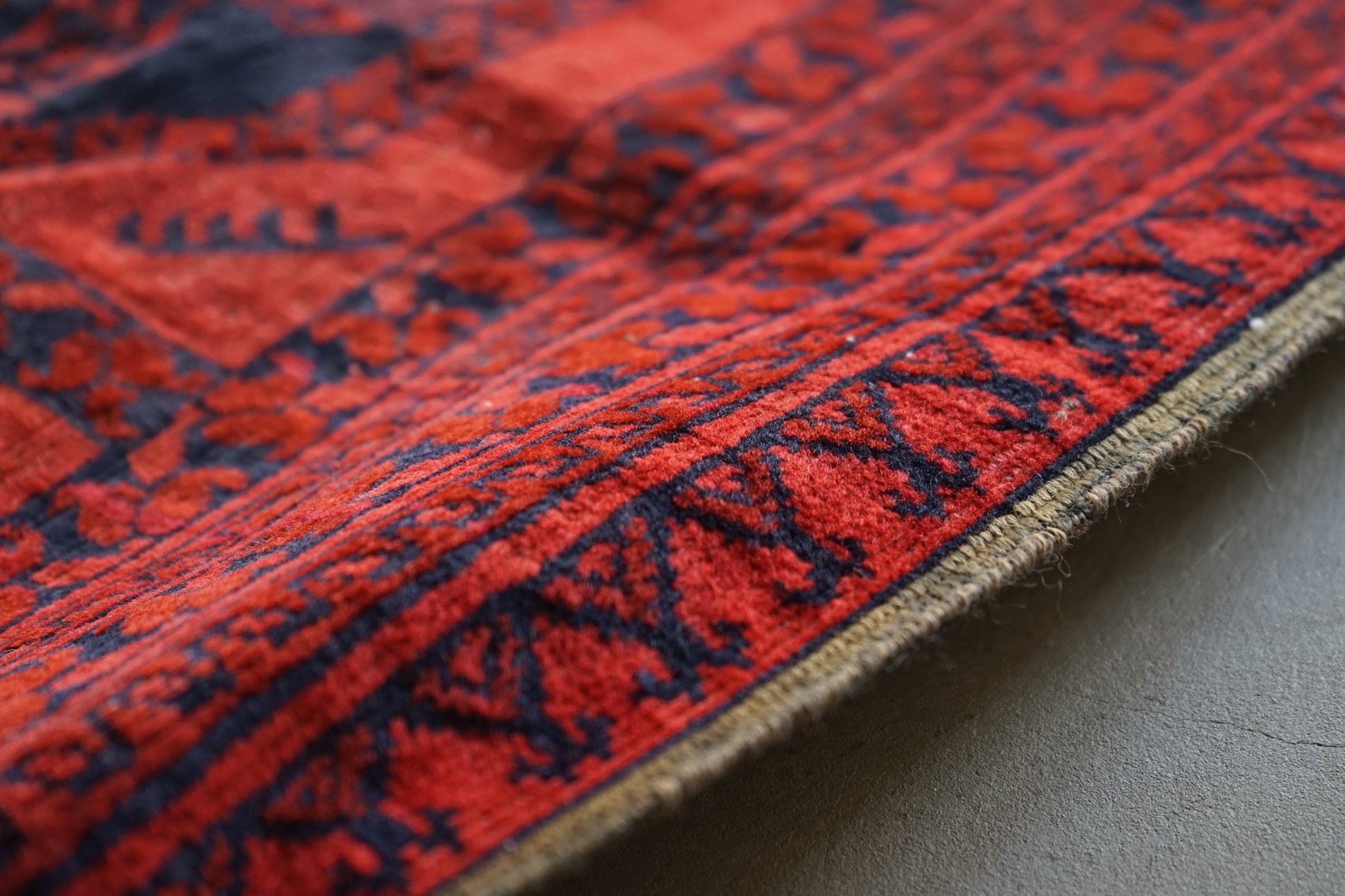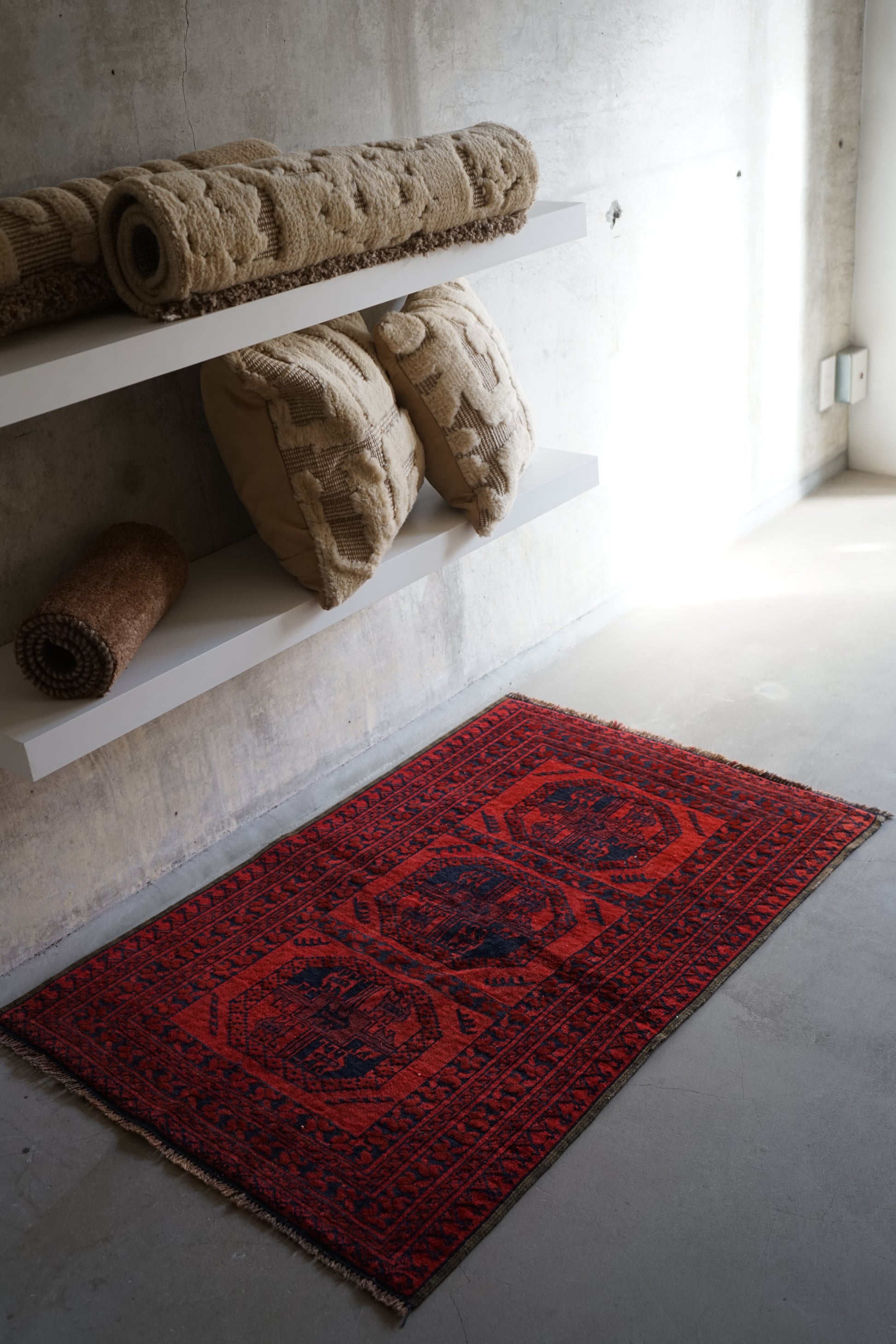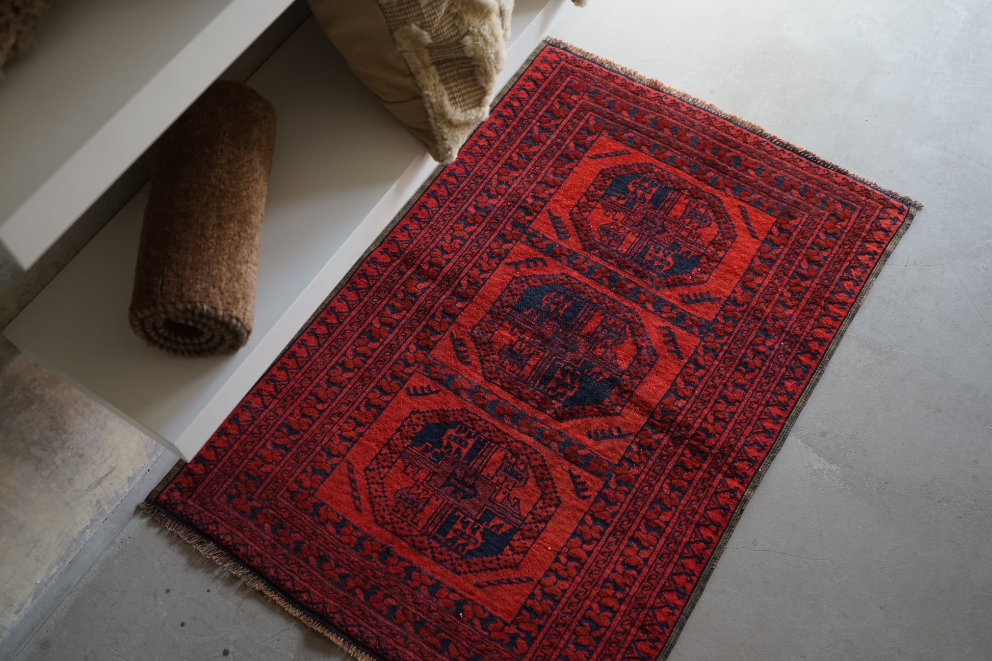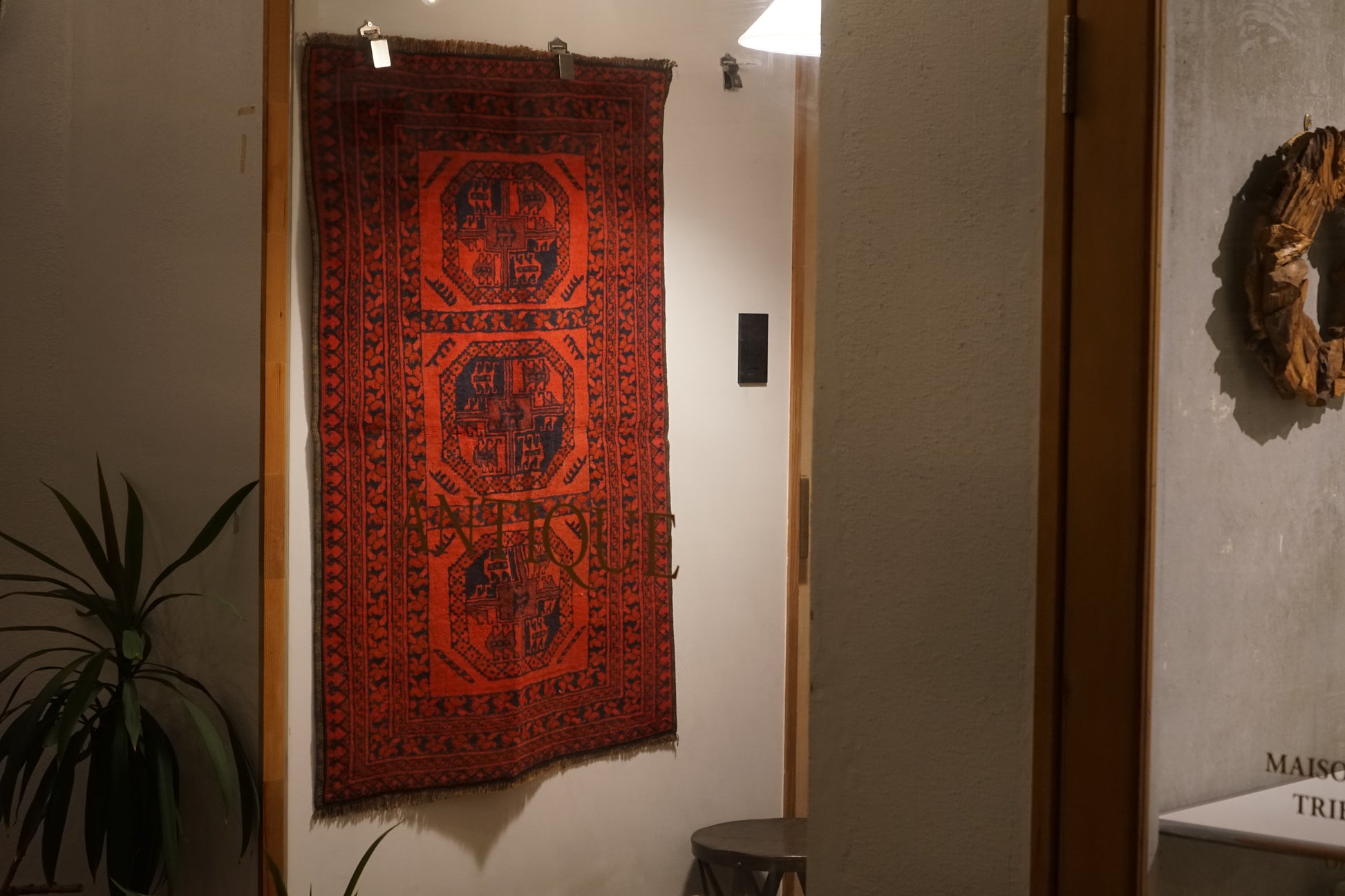 シックなアフガントルクメンです。しっとりとした羊毛、そして薄くてしなやかな佇まいです。