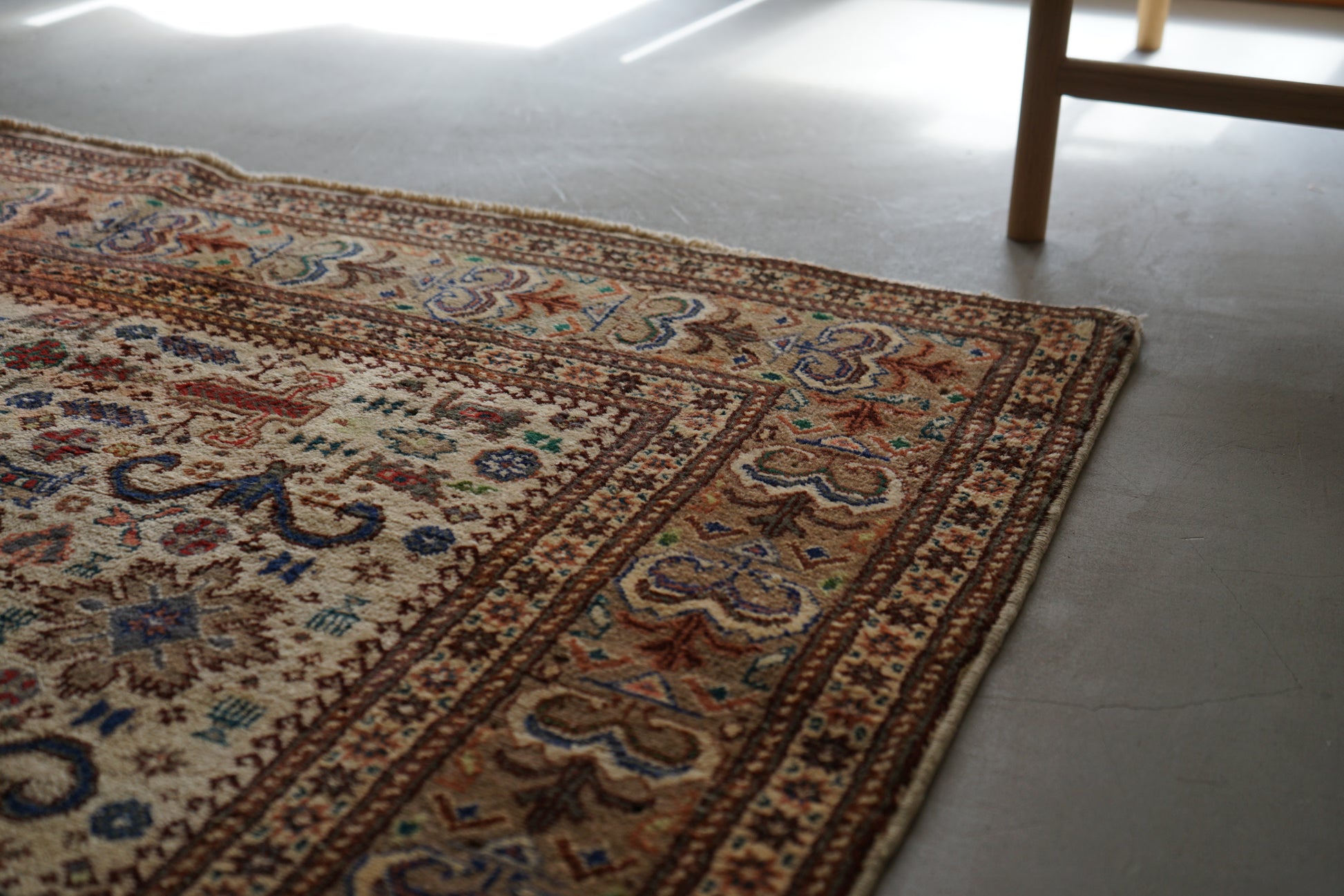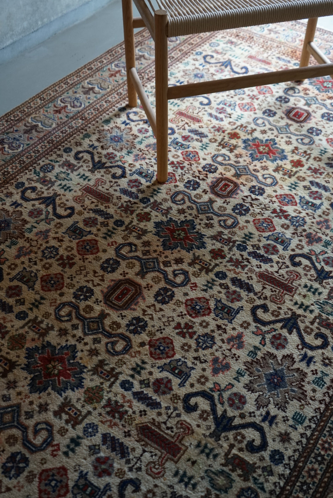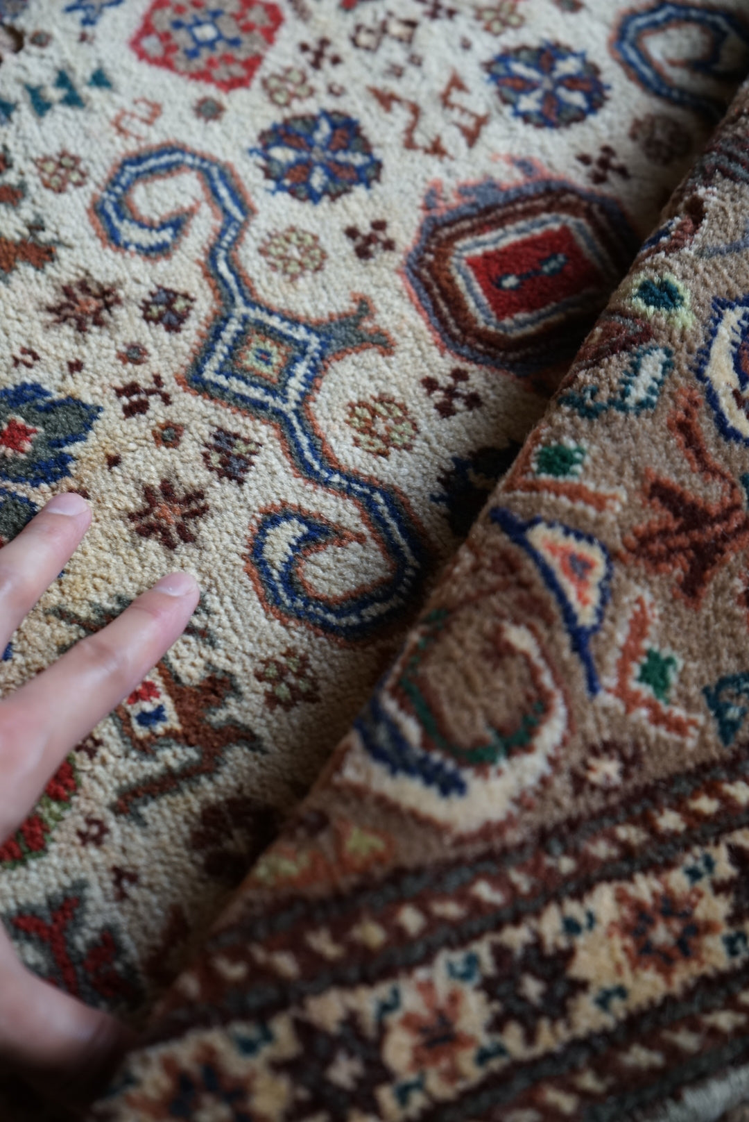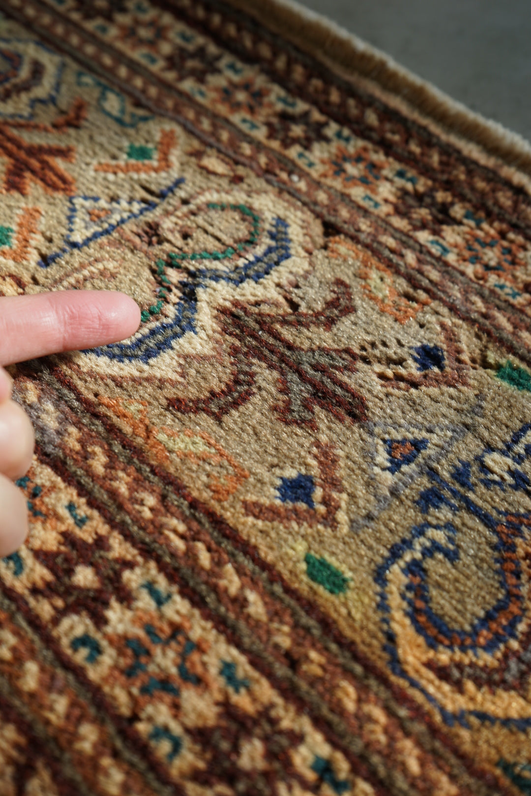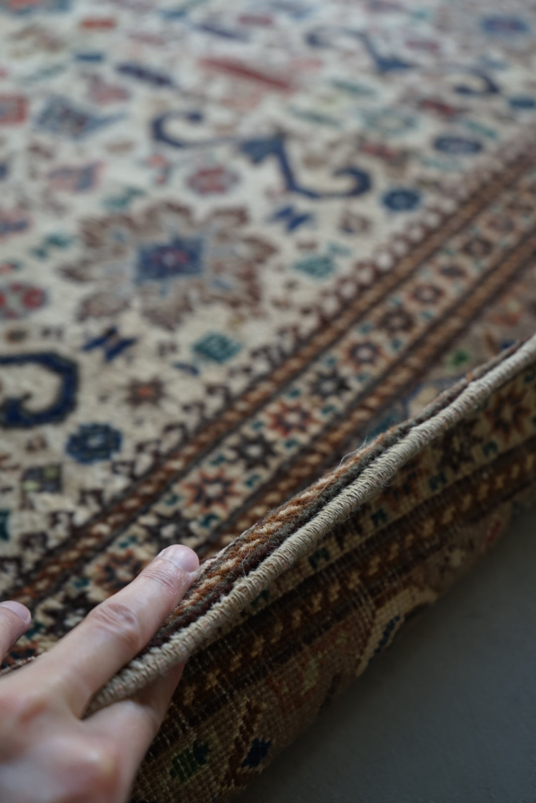 表面の羊毛はソフトタッチ。踏んで使い慣らされて優しい表情をしています。絨毯自体はしっかりとした芯で、折り畳んでも畳みシワがつきにくいです。またコットンと共に織られているのでとても丈夫です。