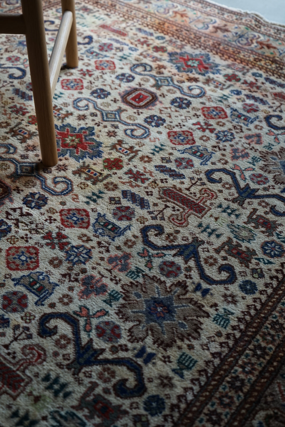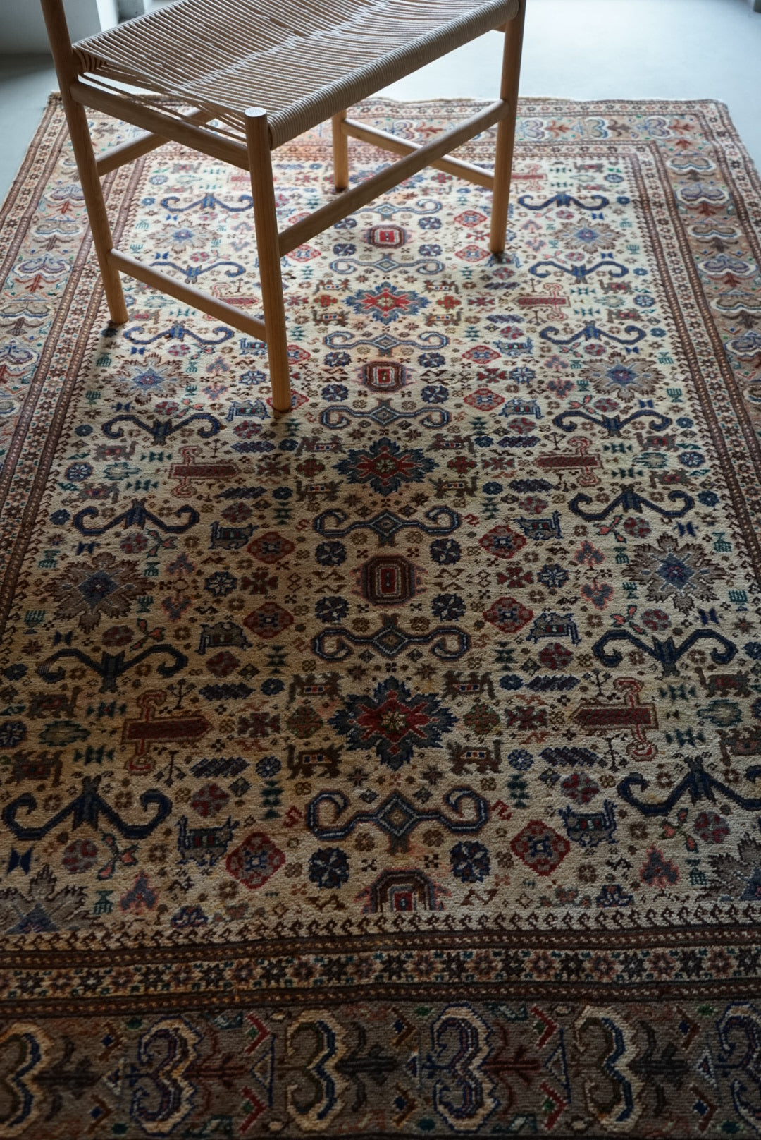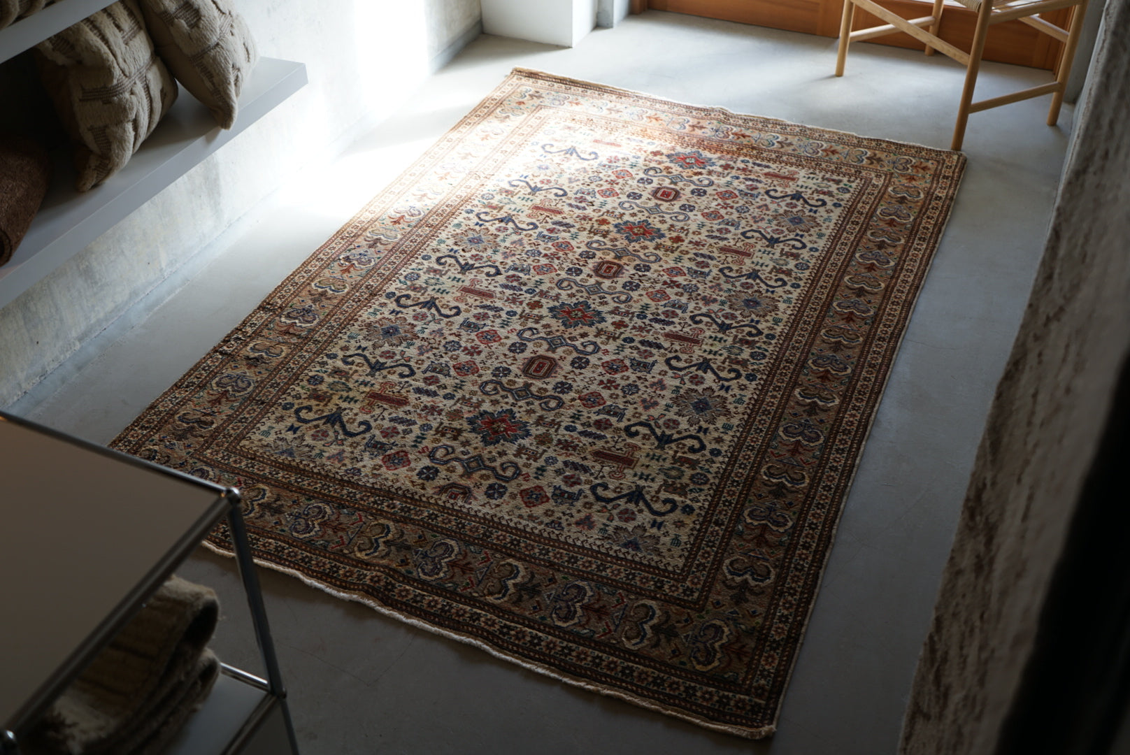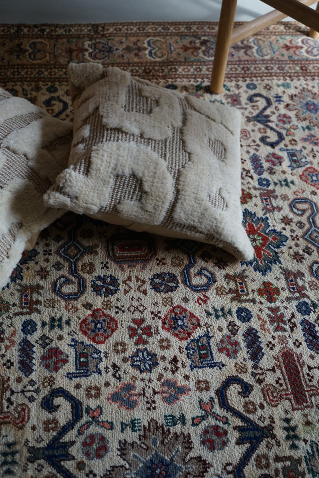 表面の羊毛はソフトタッチ。踏んで使い慣らされて優しい表情をしています。絨毯自体はしっかりとした芯で、折り畳んでも畳みシワがつきにくいです。またコットンと共に織られているのでとても丈夫です。
