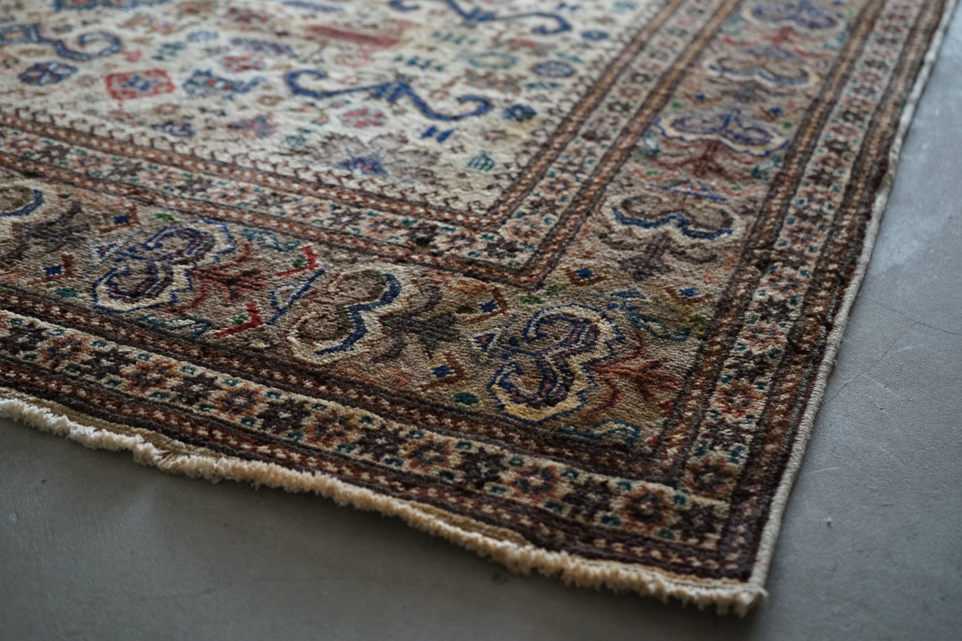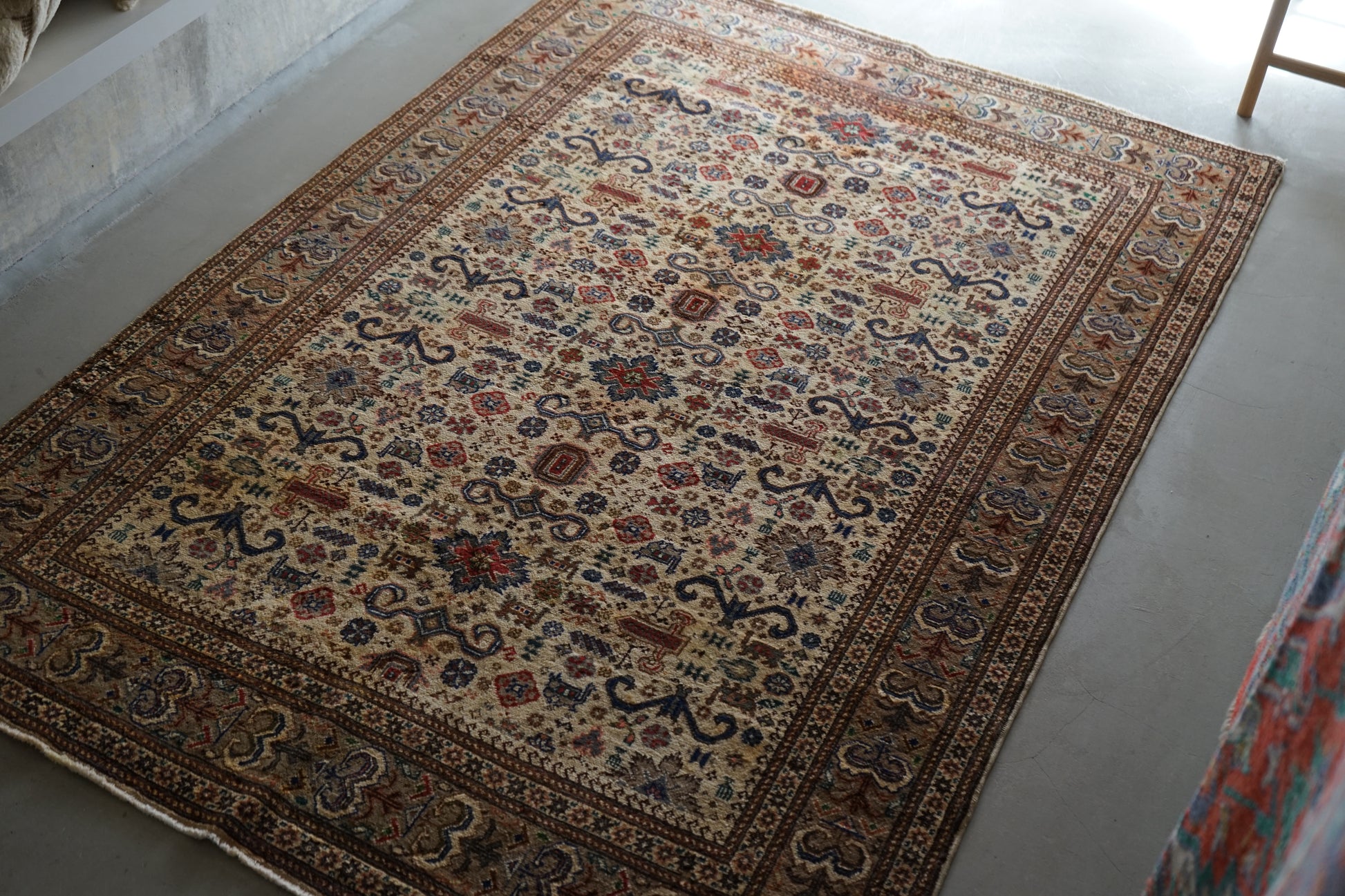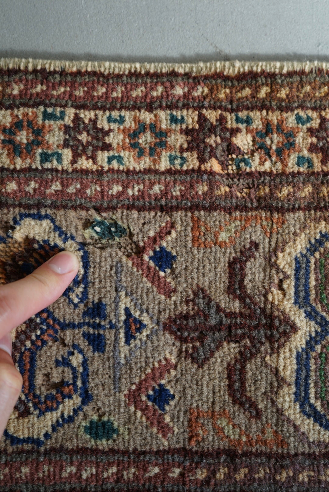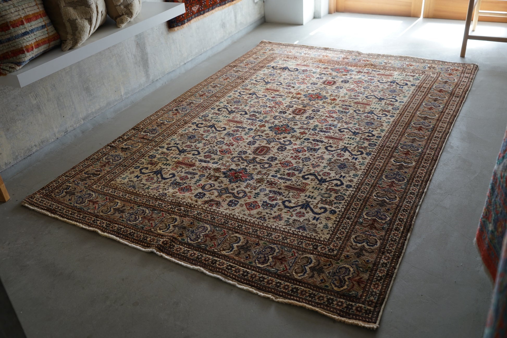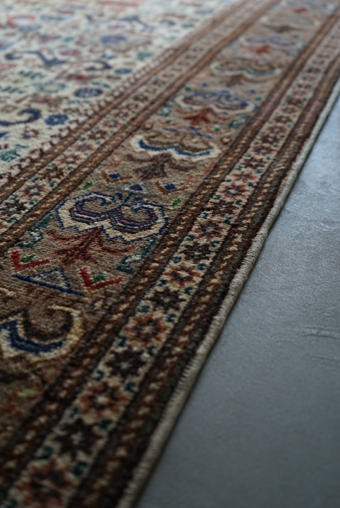 表面の羊毛はソフトタッチ。踏んで使い慣らされて優しい表情をしています。絨毯自体はしっかりとした芯で、折り畳んでも畳みシワがつきにくいです。またコットンと共に織られているのでとても丈夫です。