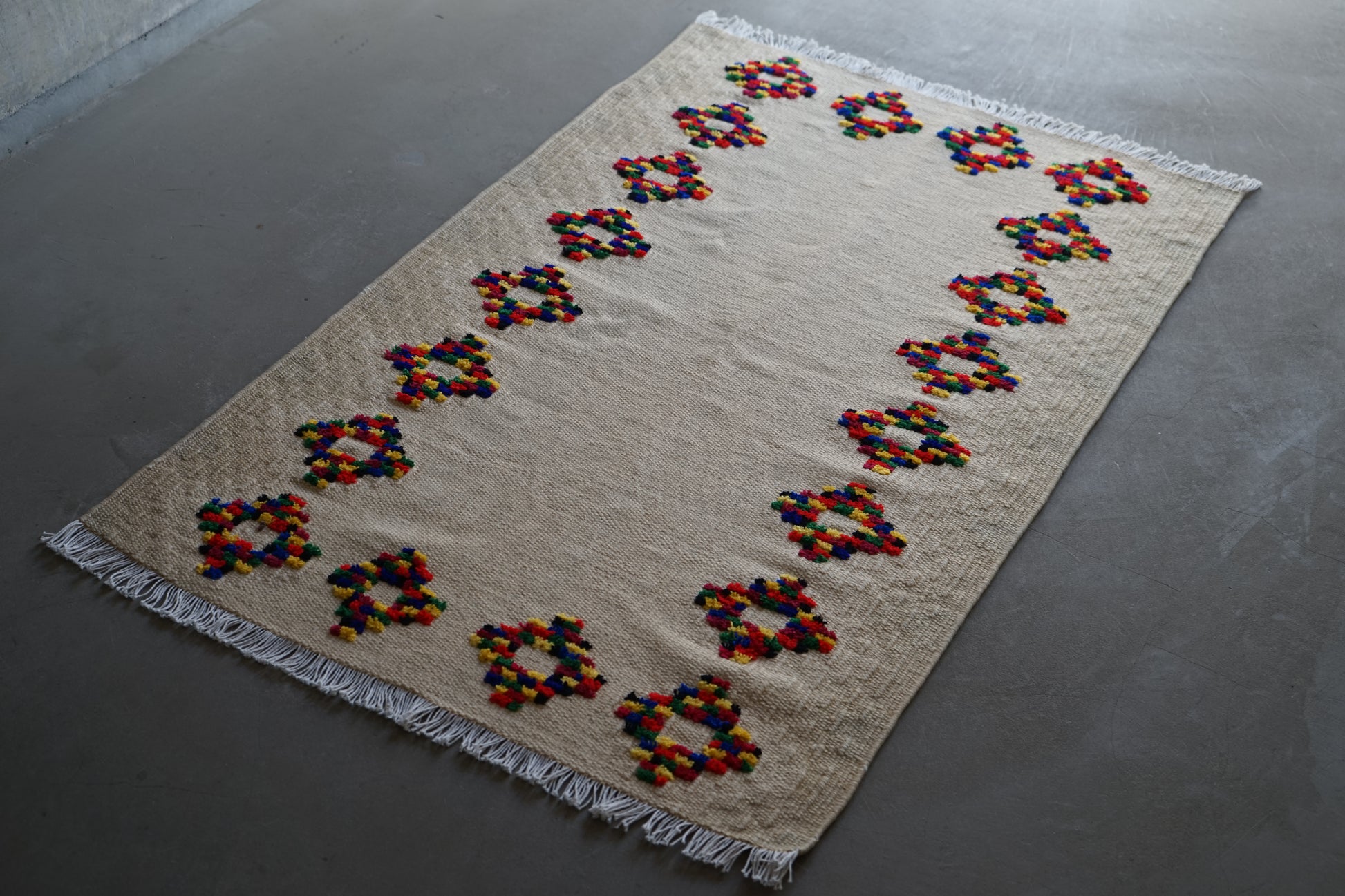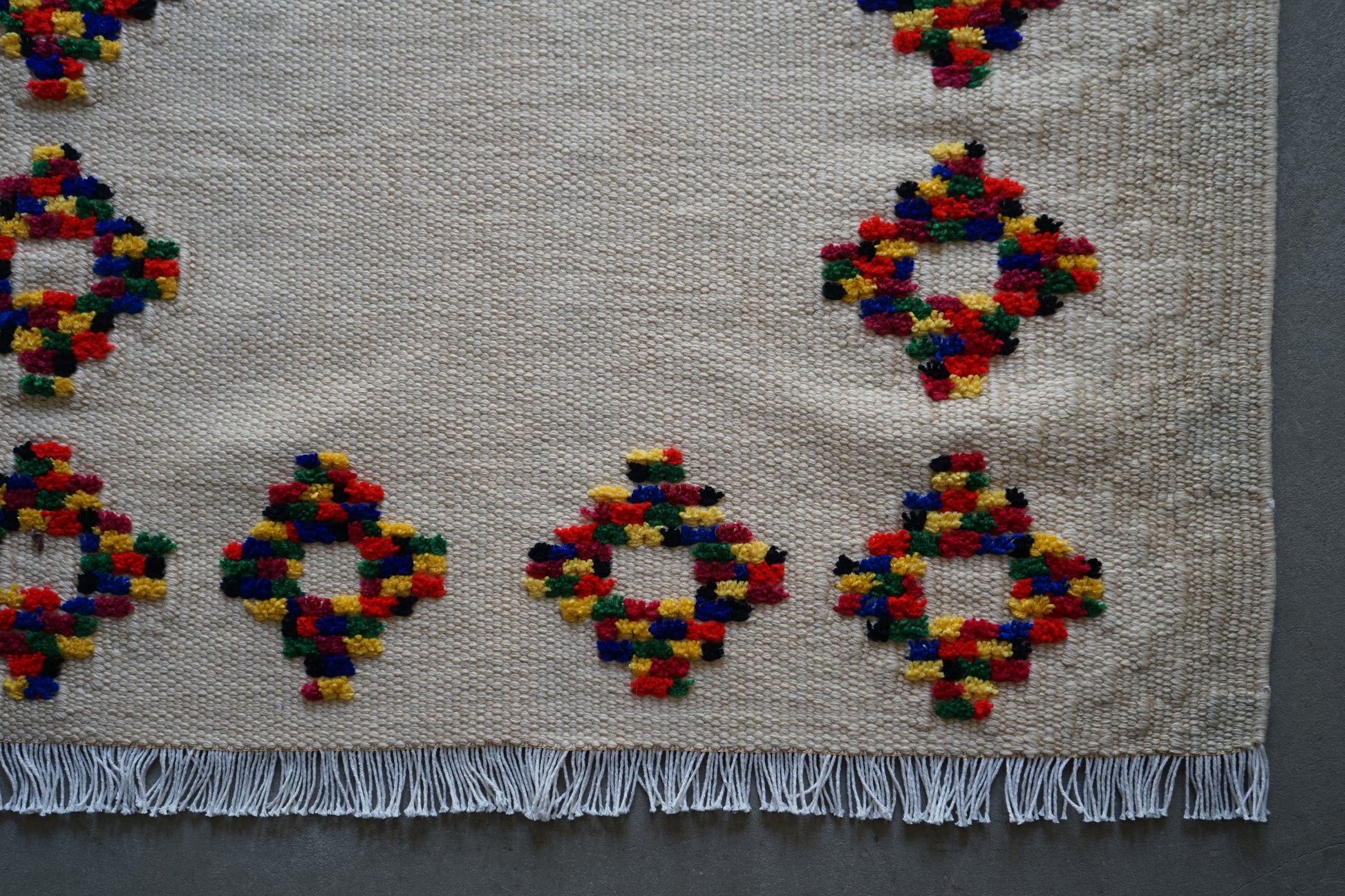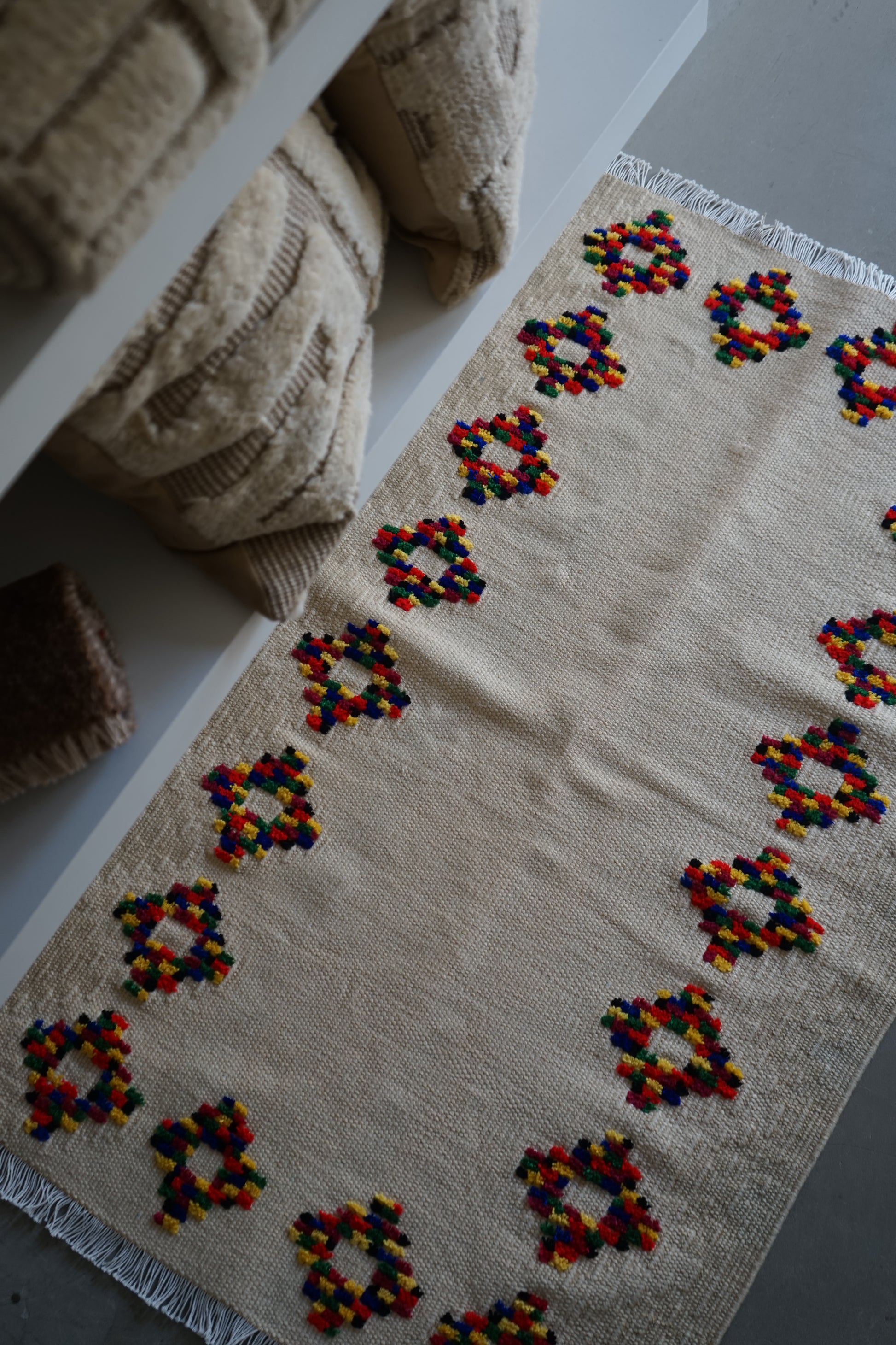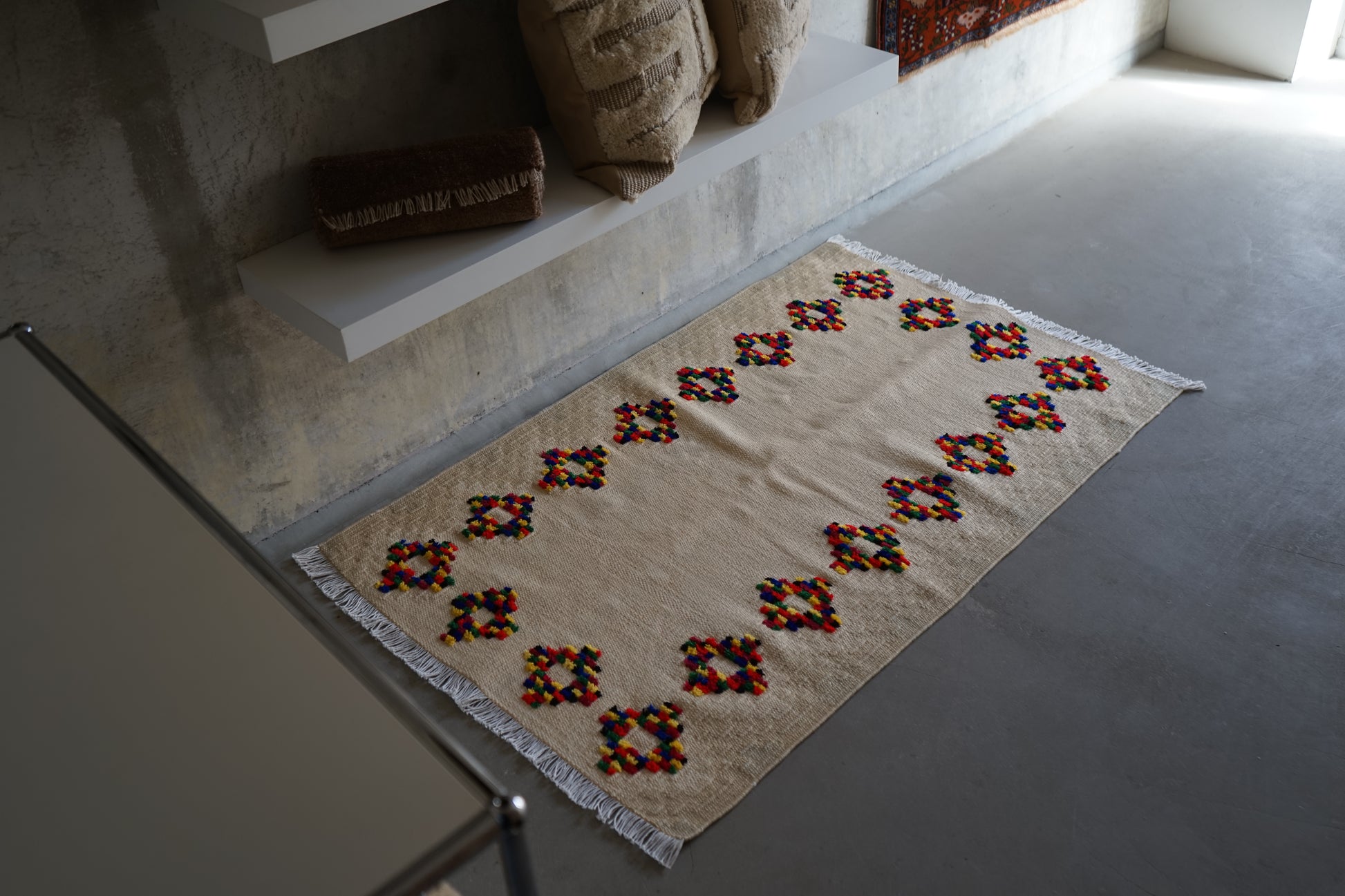 カラフルドットで花がデザインされています。ナチュラルベージュのキリムに映えて可愛いです。