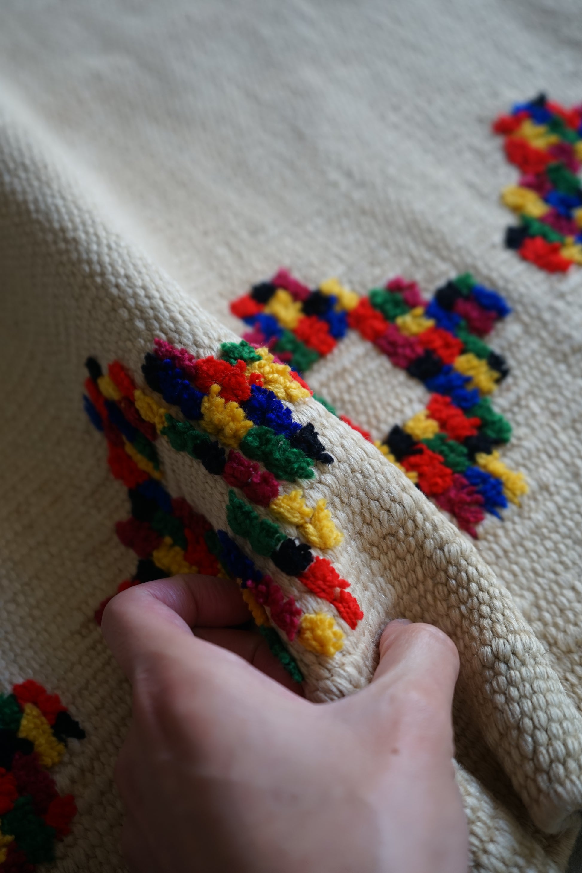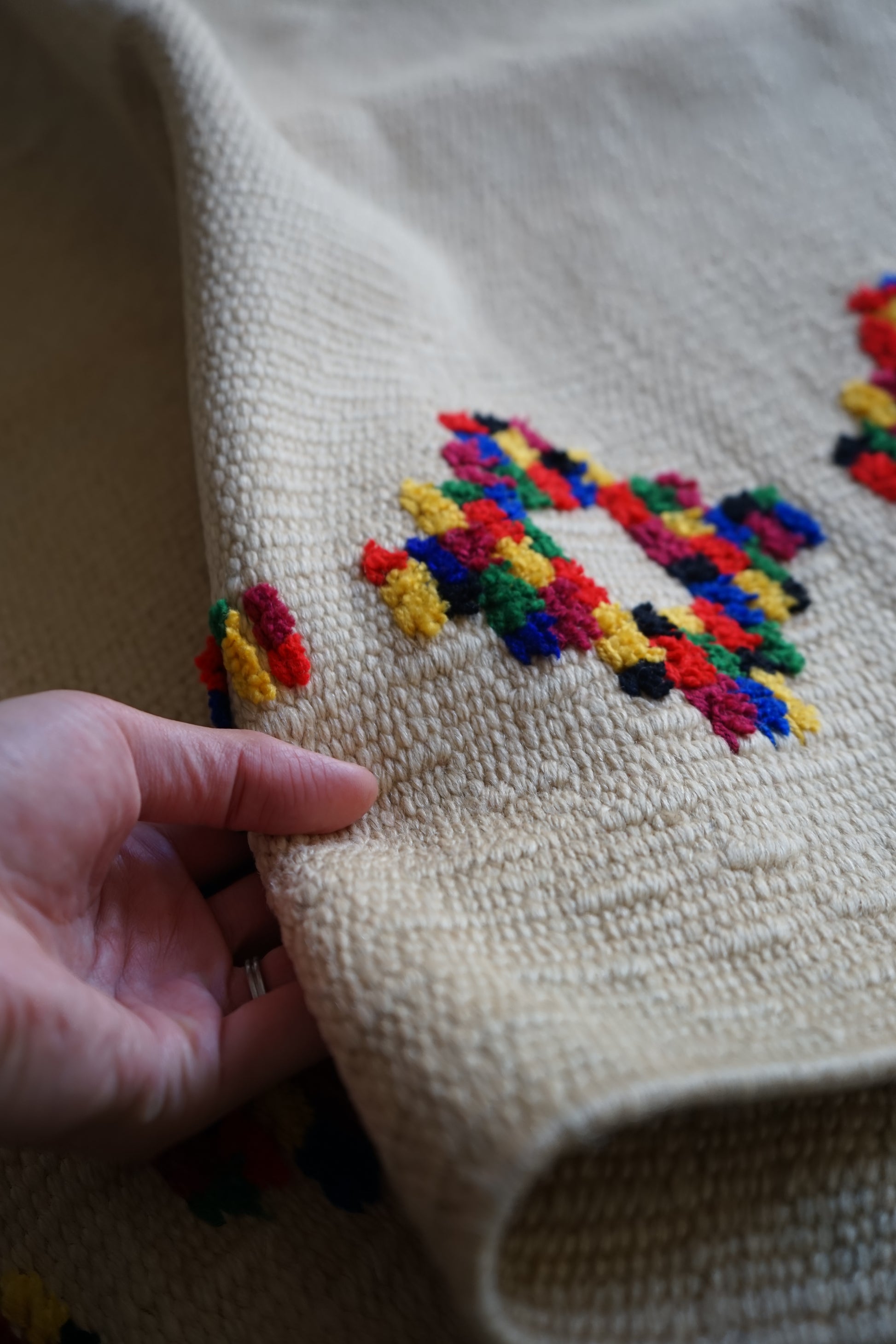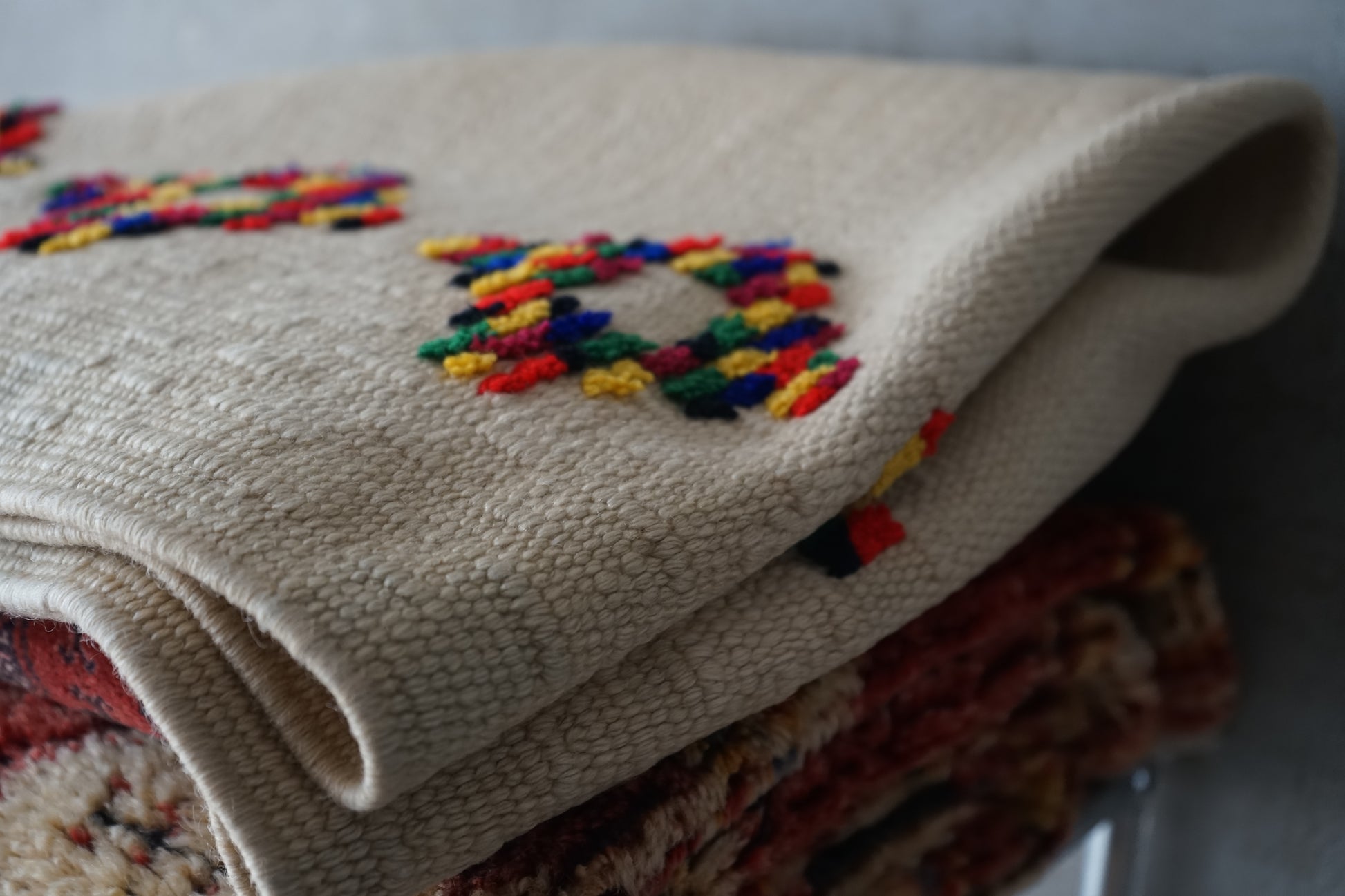 カラフルドットで花がデザインされています。ナチュラルベージュのキリムに映えて可愛いです。