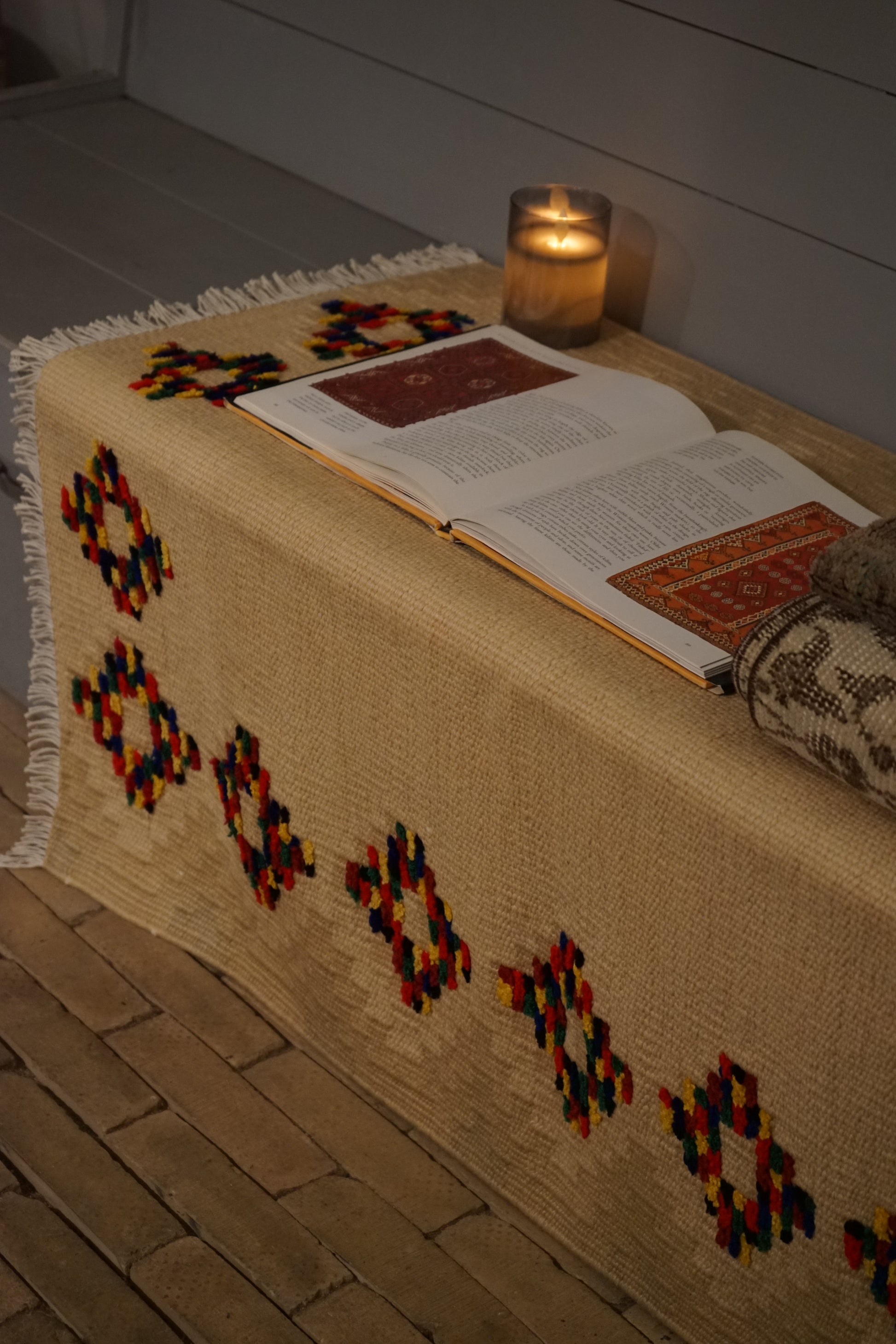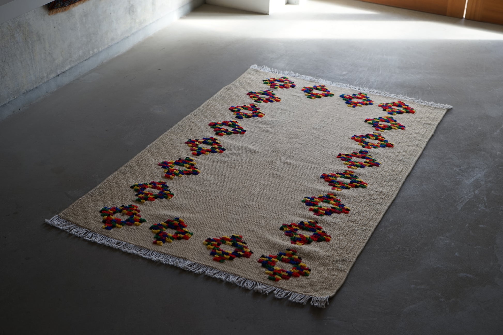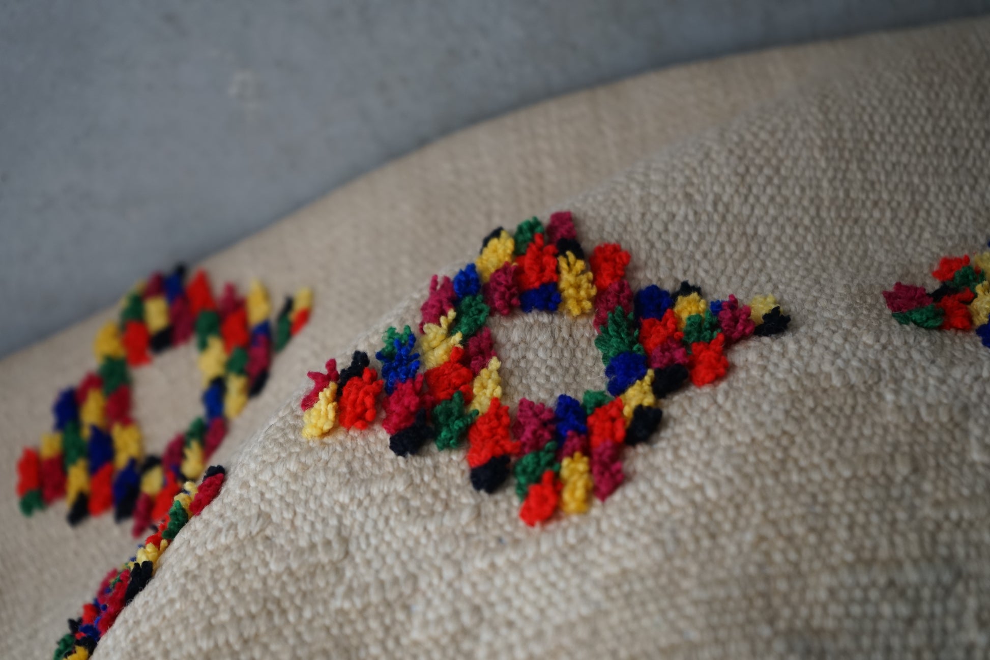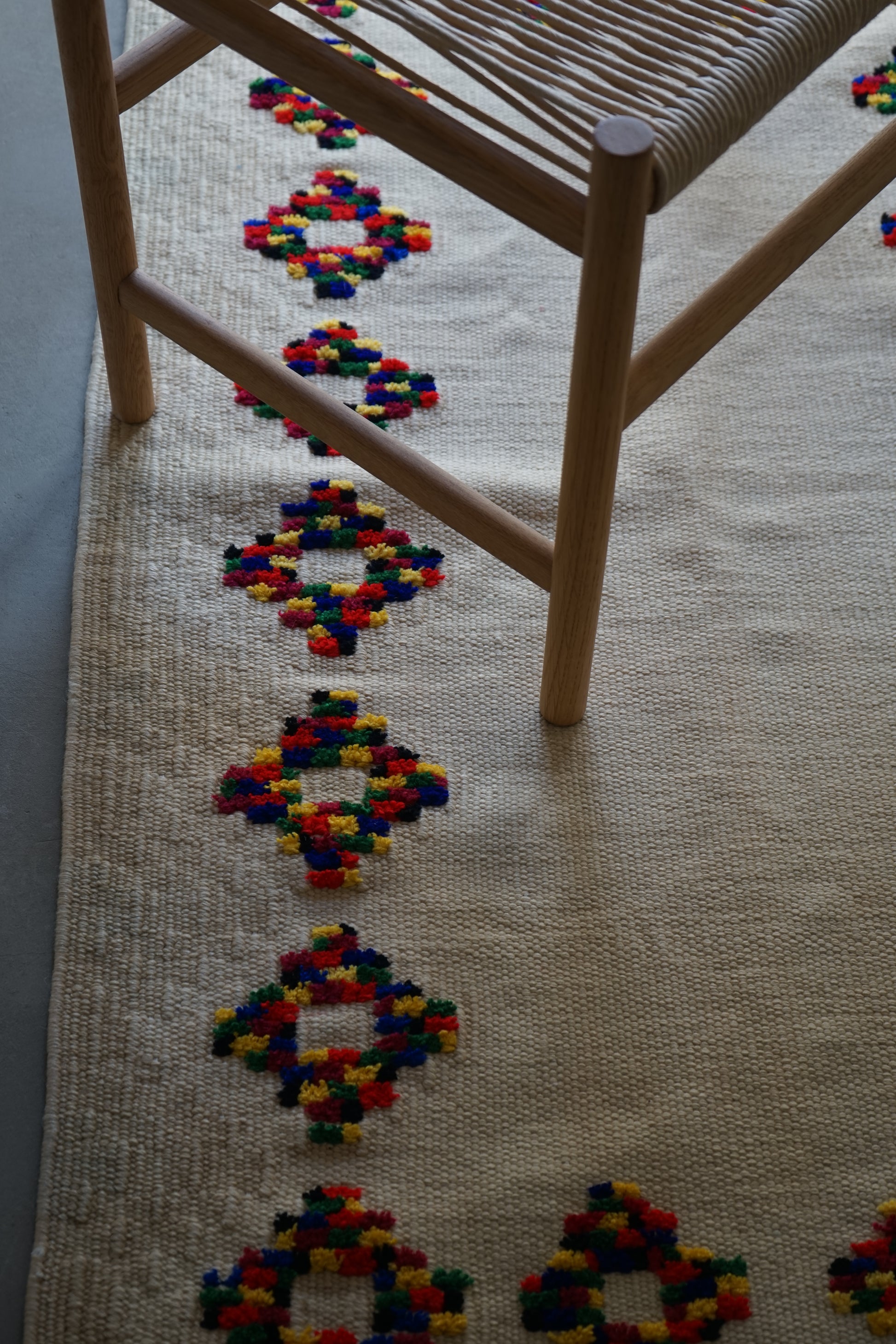 カラフルドットで花がデザインされています。ナチュラルベージュのキリムに映えて可愛いです。