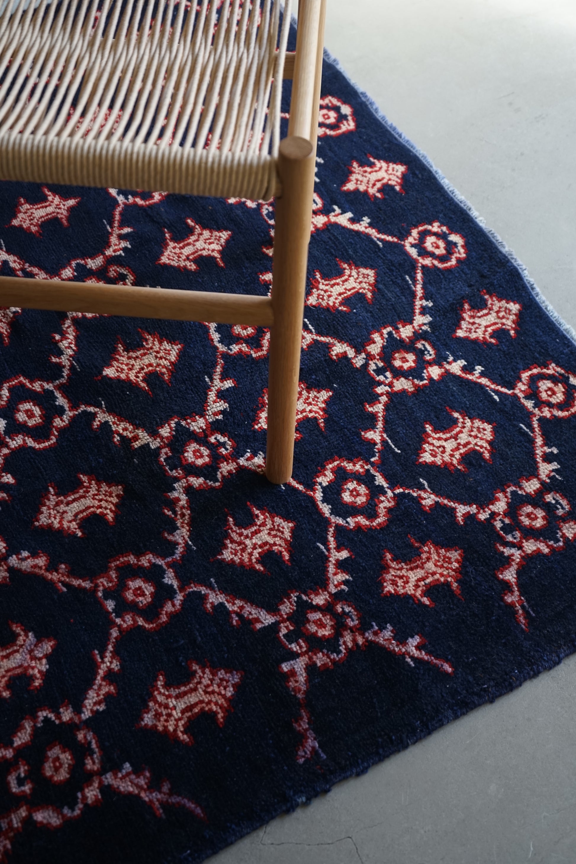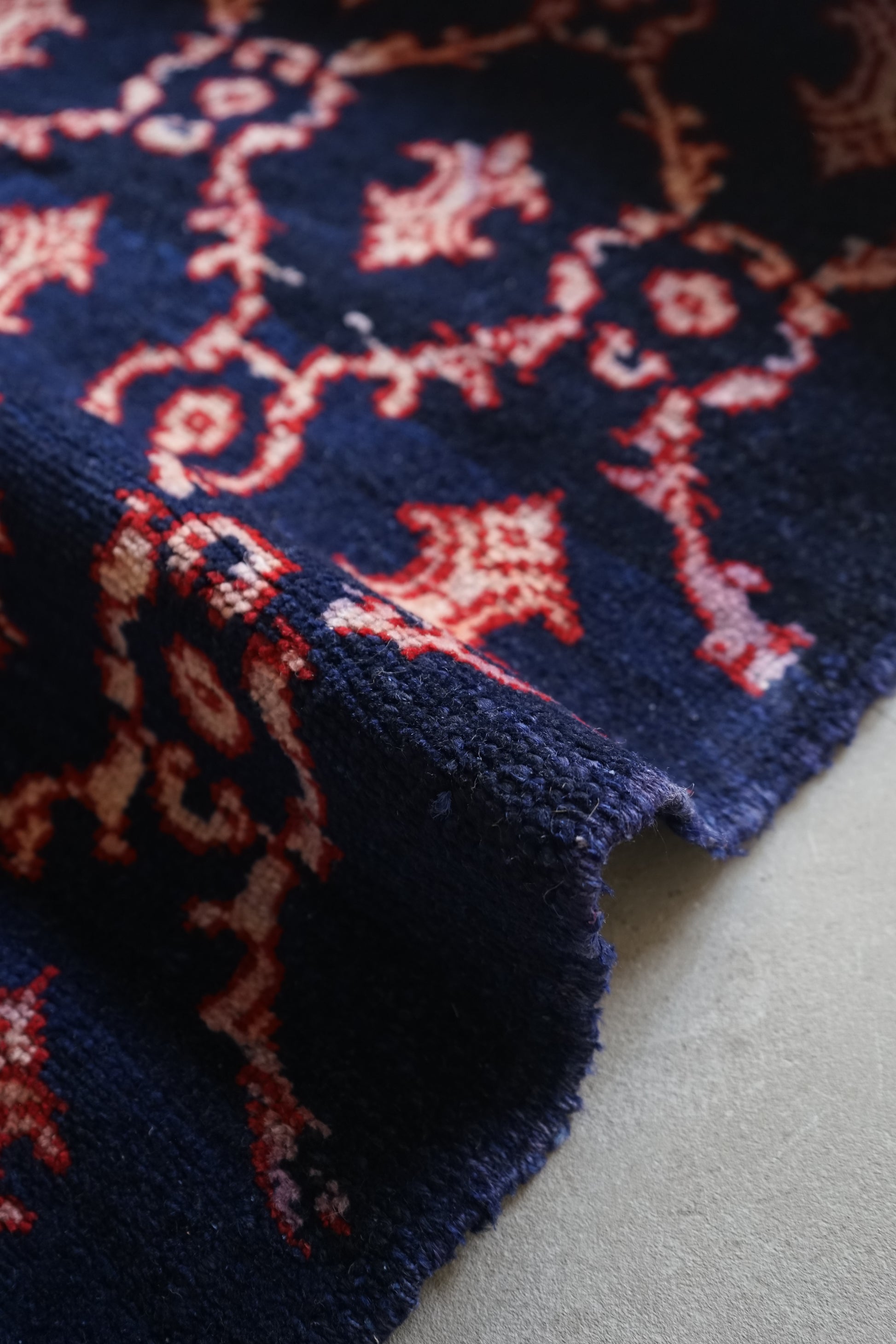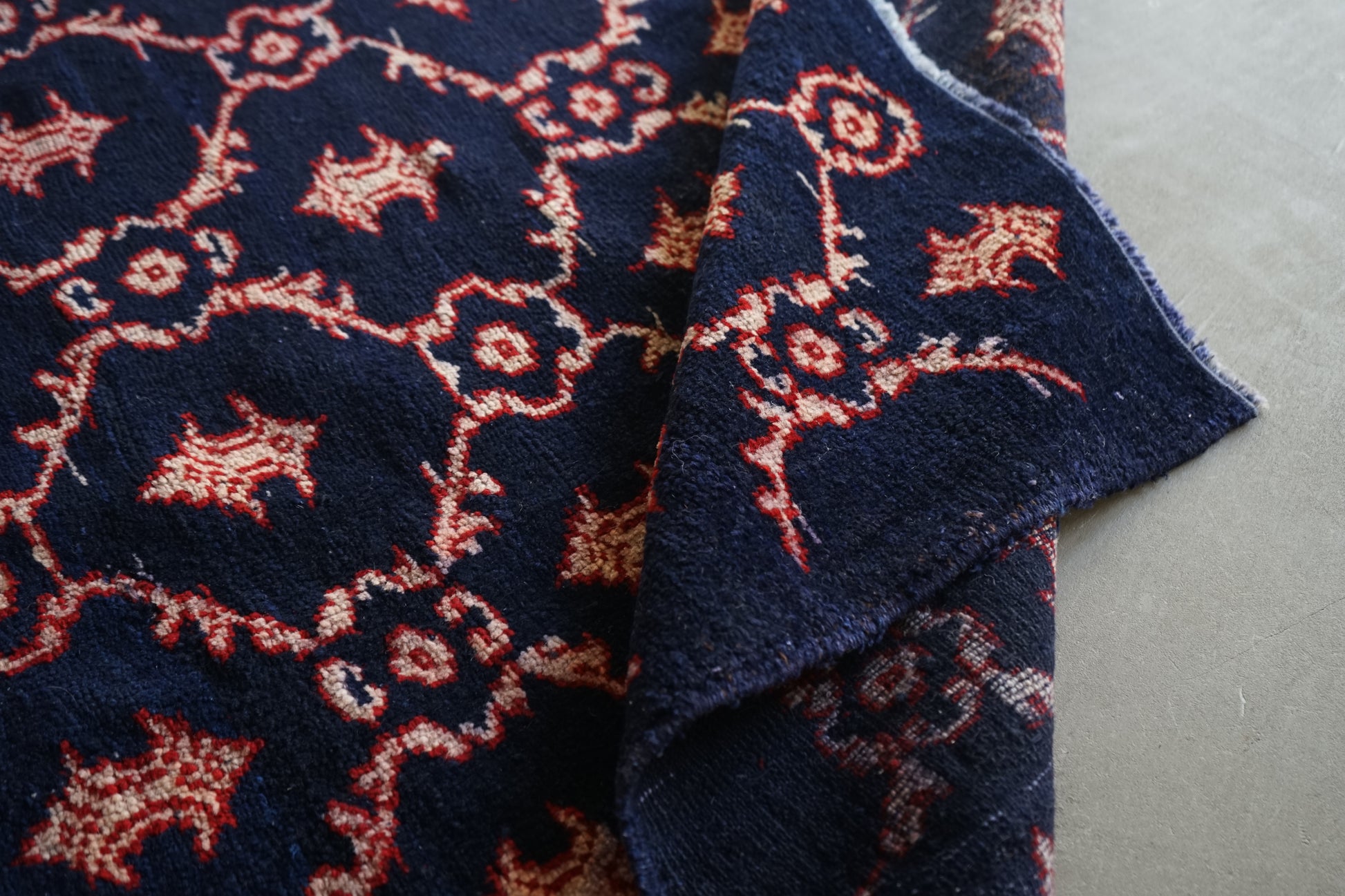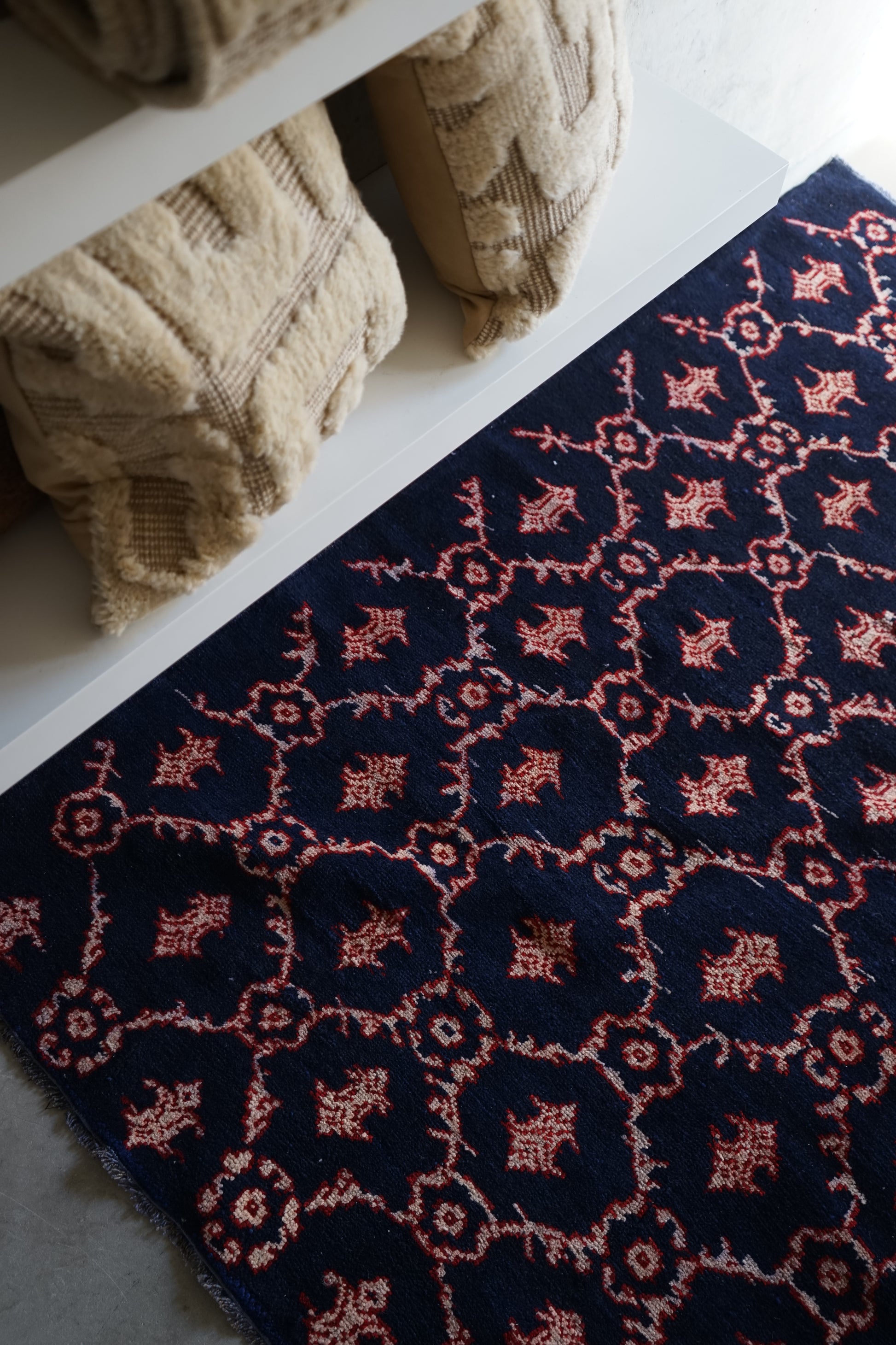 ふっくらとした毛並みに濃紺のイスパルタ絨毯。手織り特有の歪みも味わい深い表情のひとつとなっています。