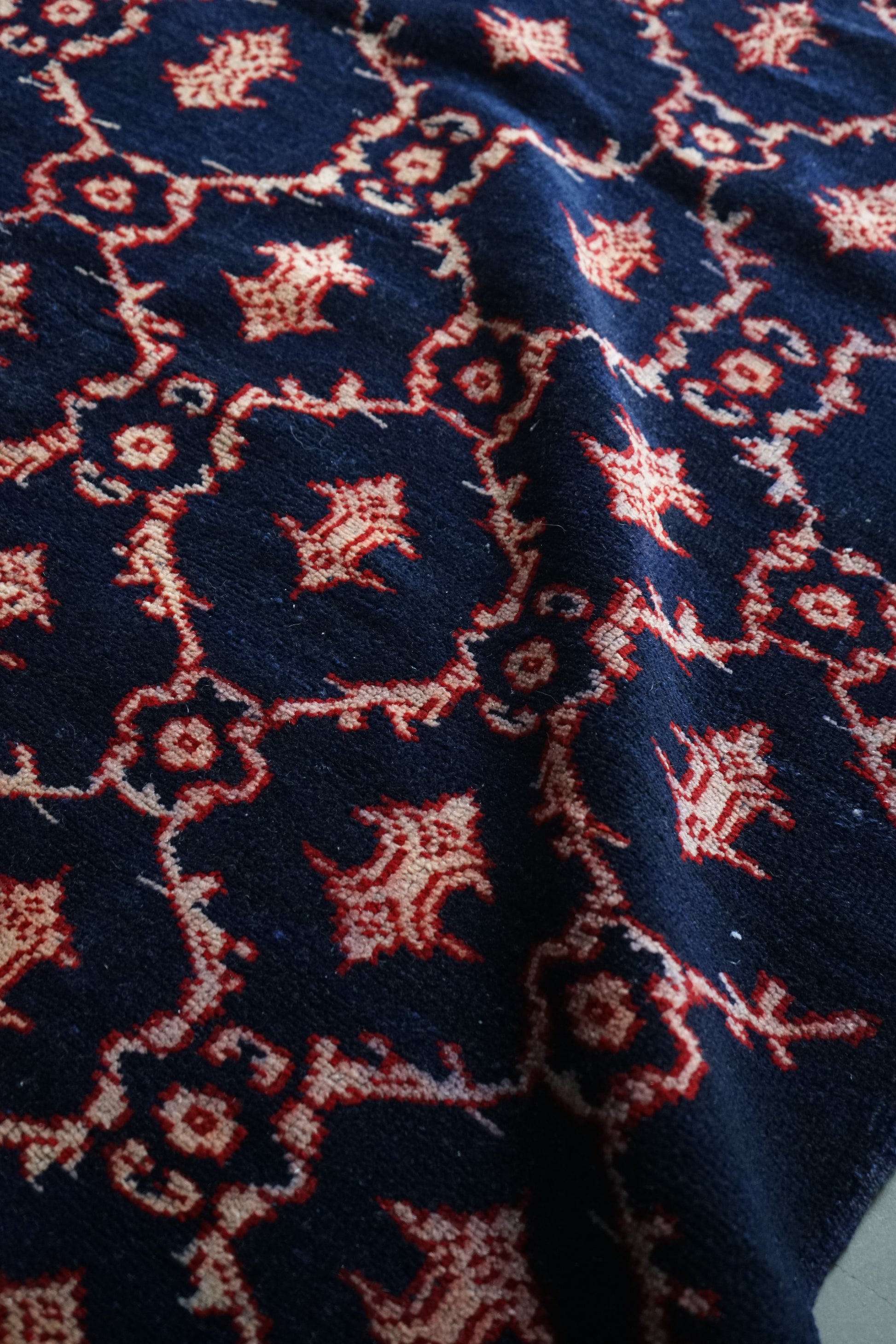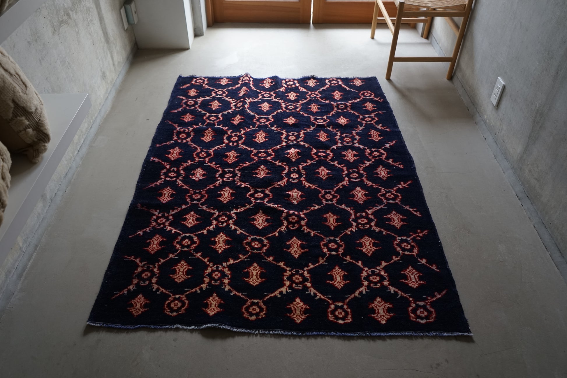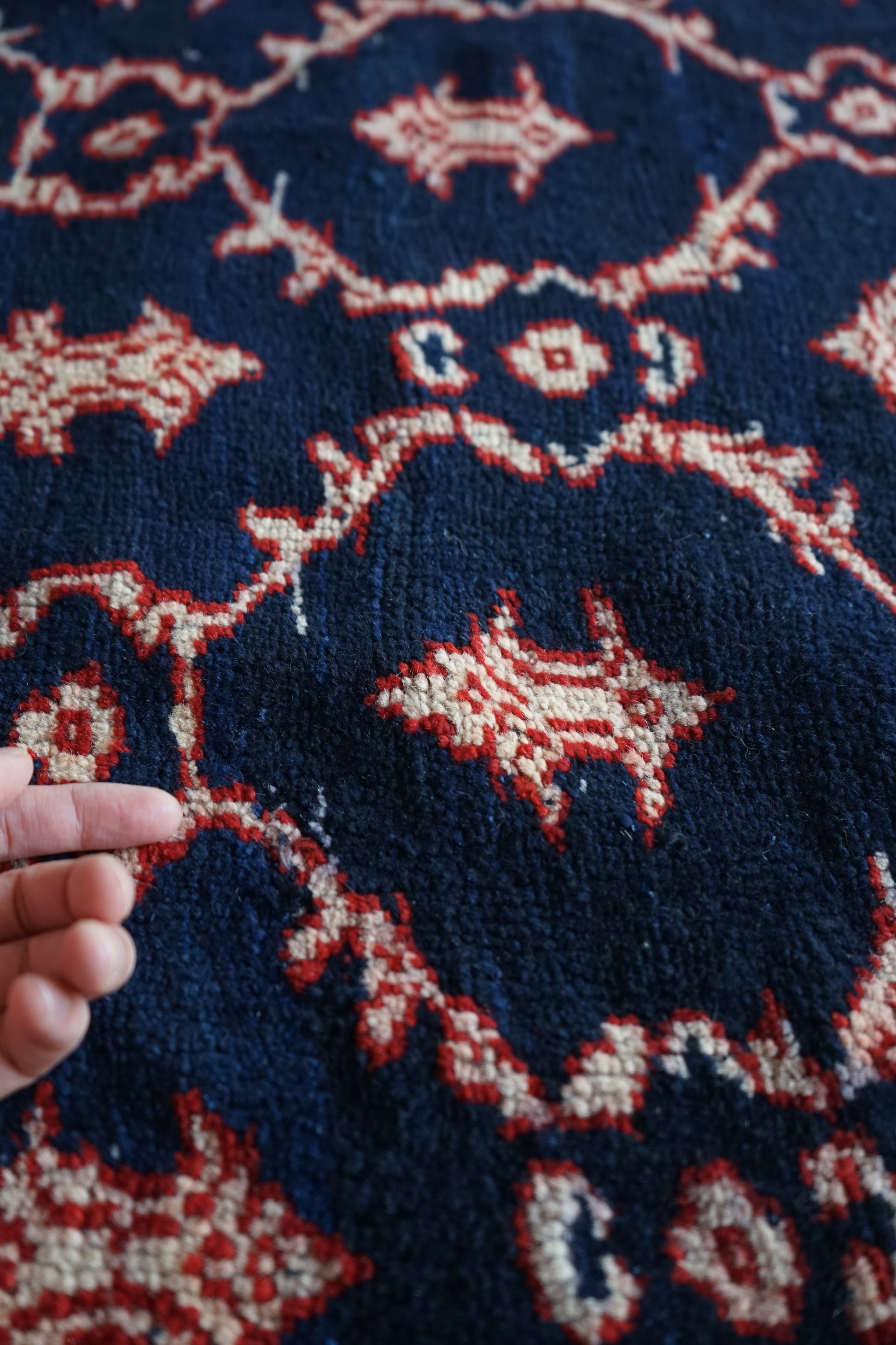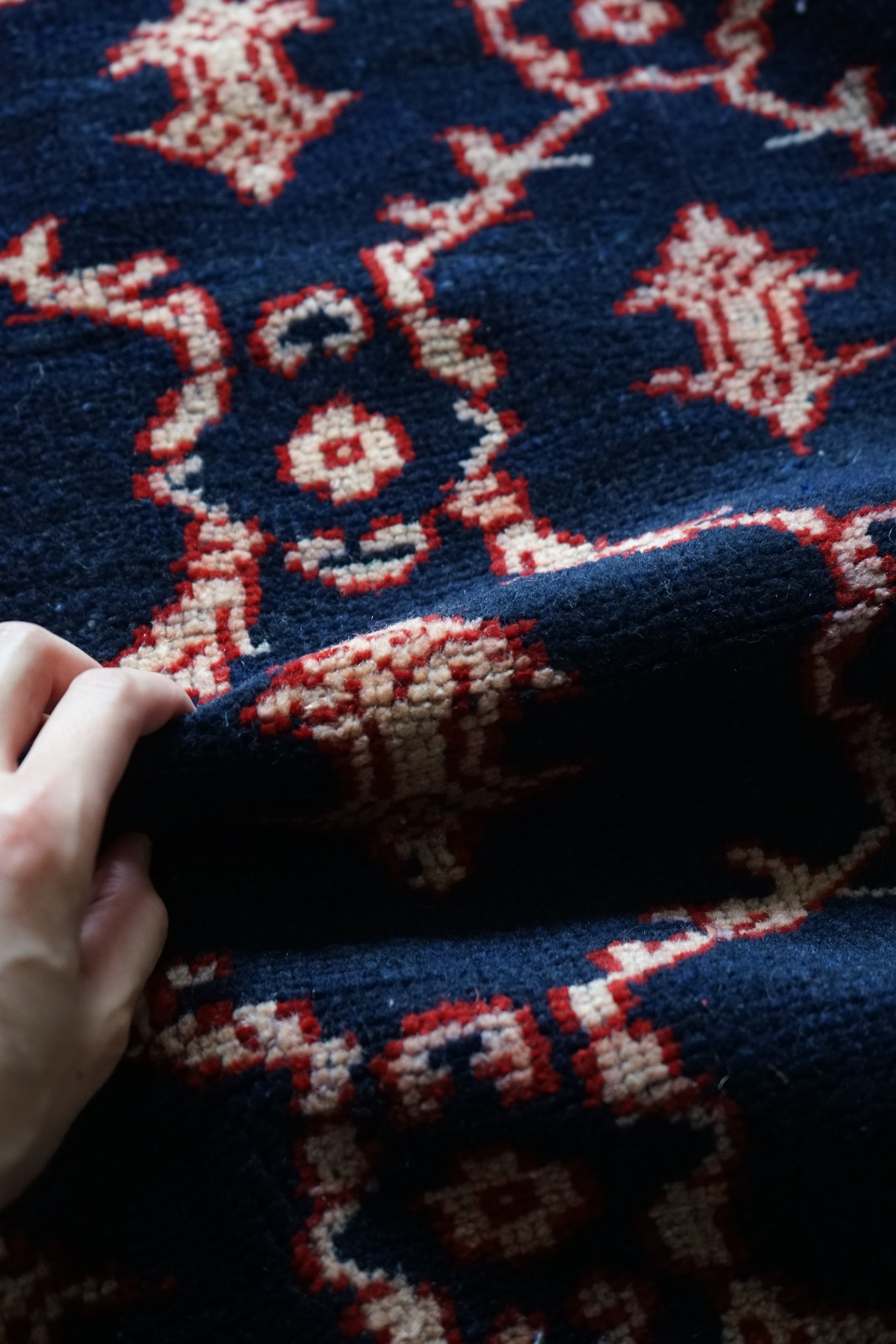 ふっくらとした毛並みに濃紺のイスパルタ絨毯。手織り特有の歪みも味わい深い表情のひとつとなっています。