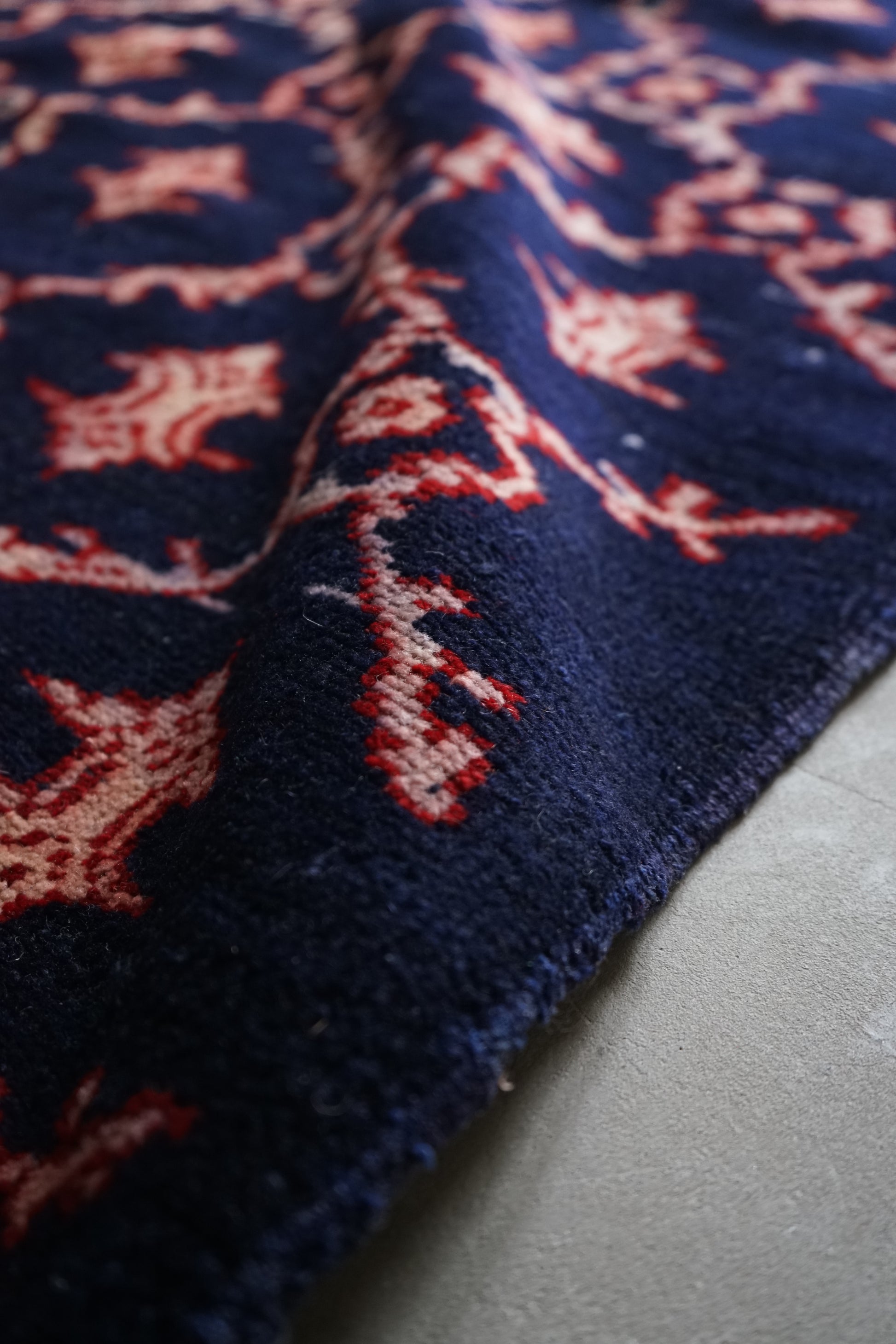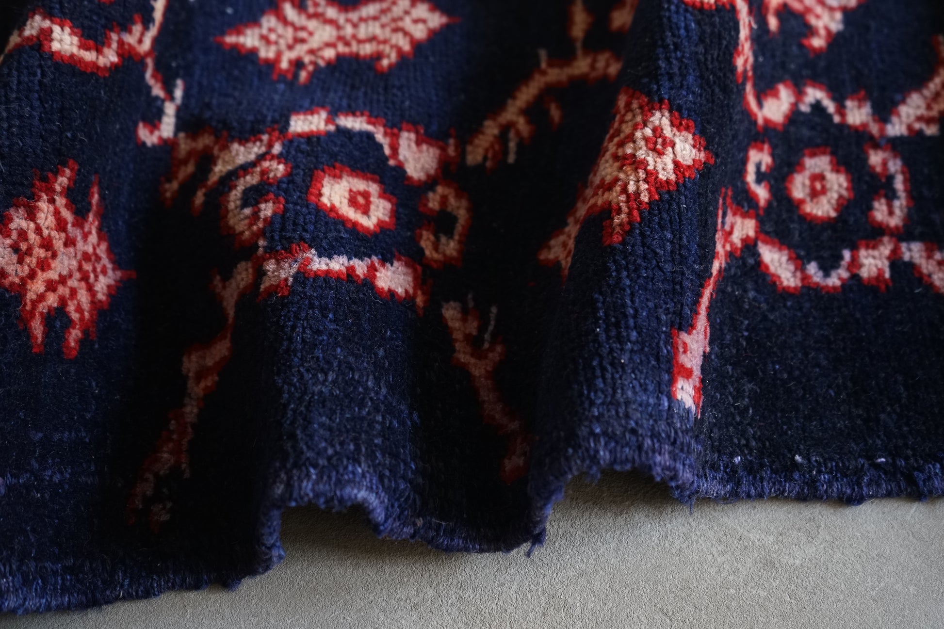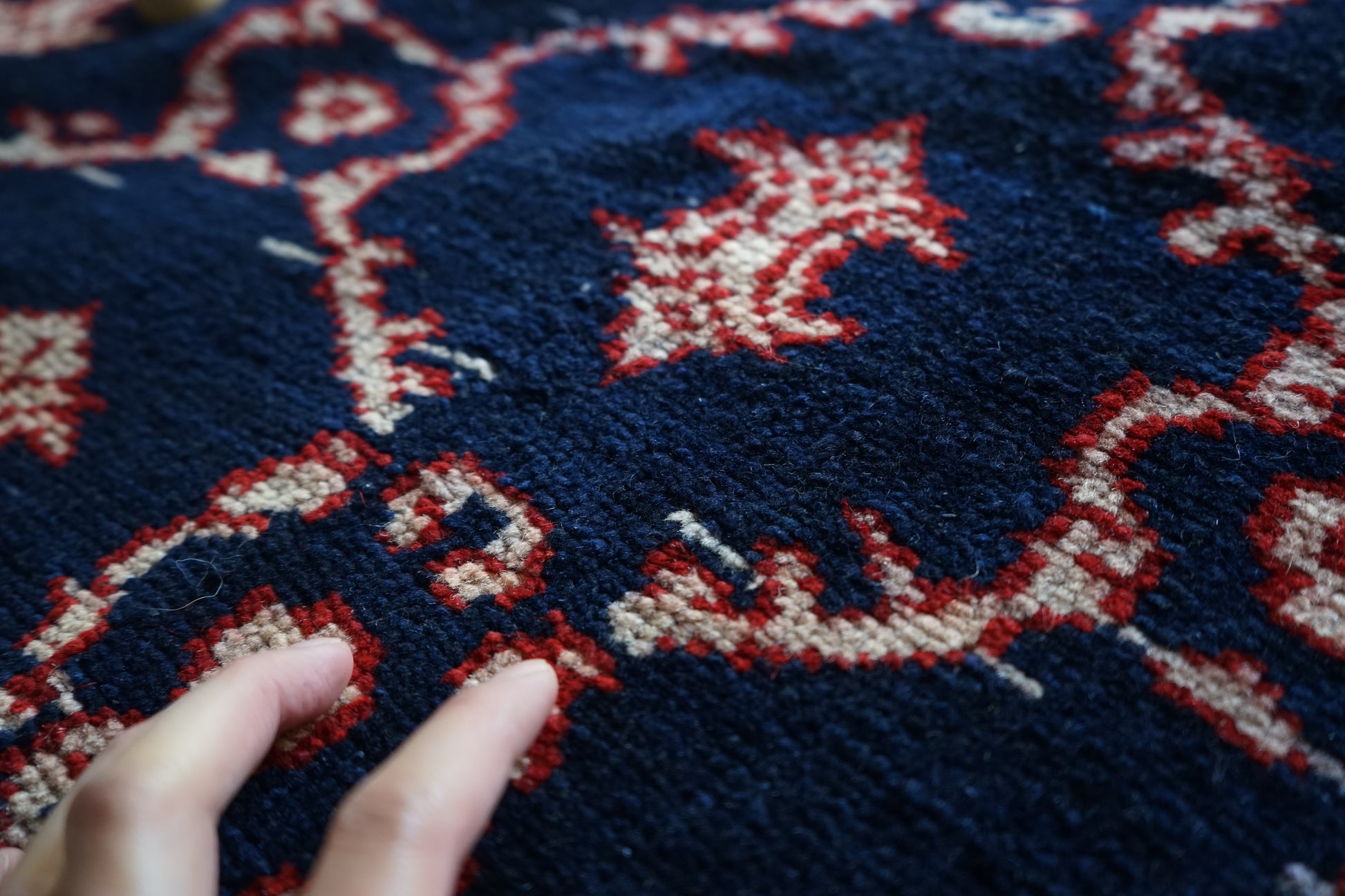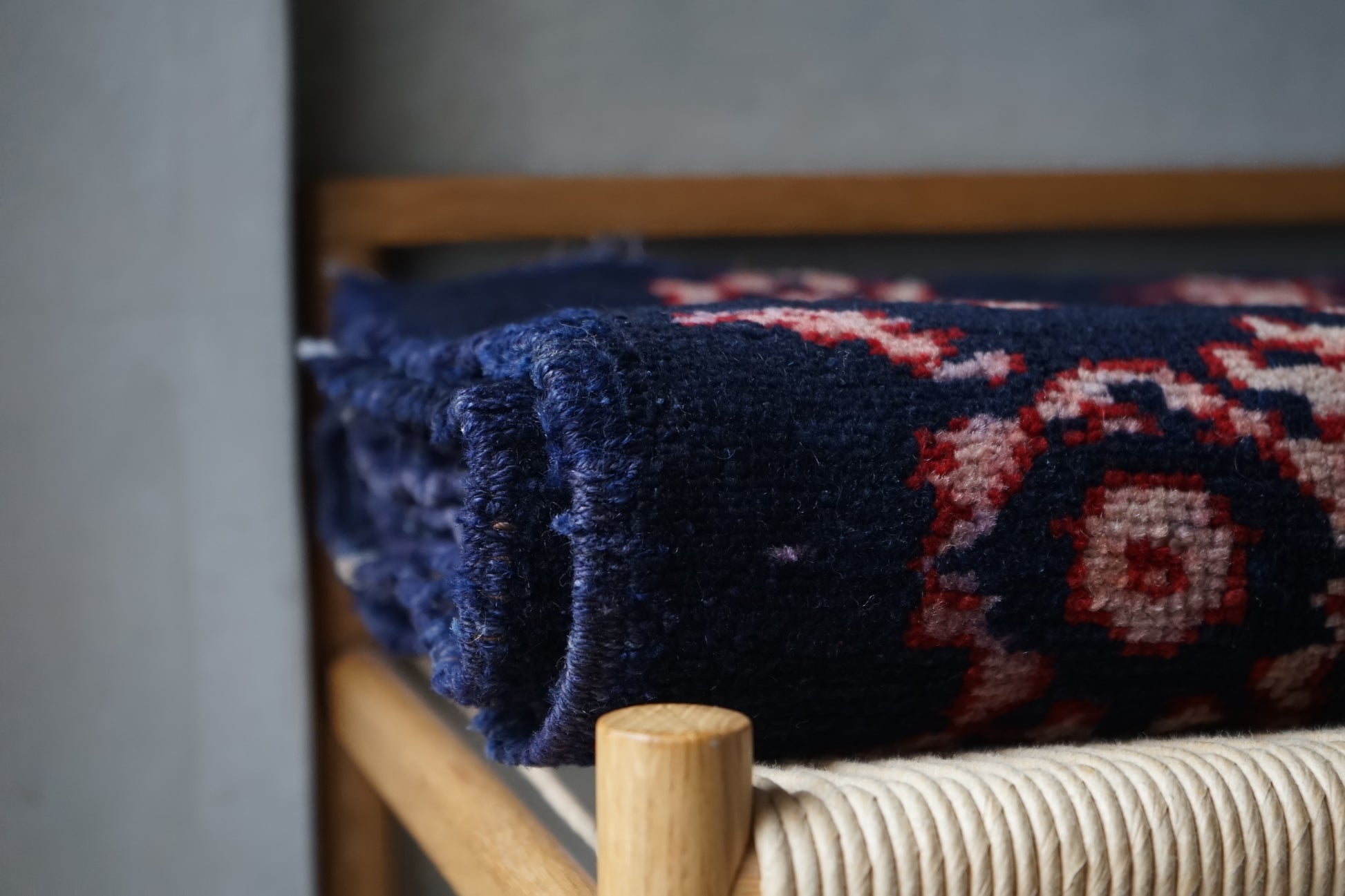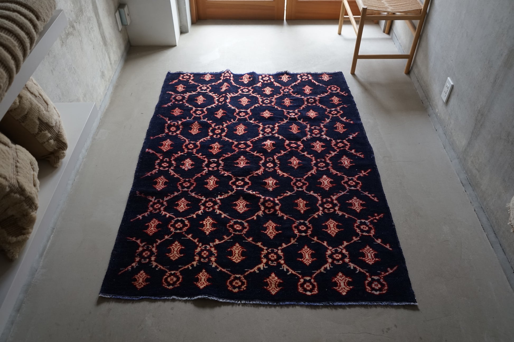 ふっくらとした毛並みに濃紺のイスパルタ絨毯。手織り特有の歪みも味わい深い表情のひとつとなっています。