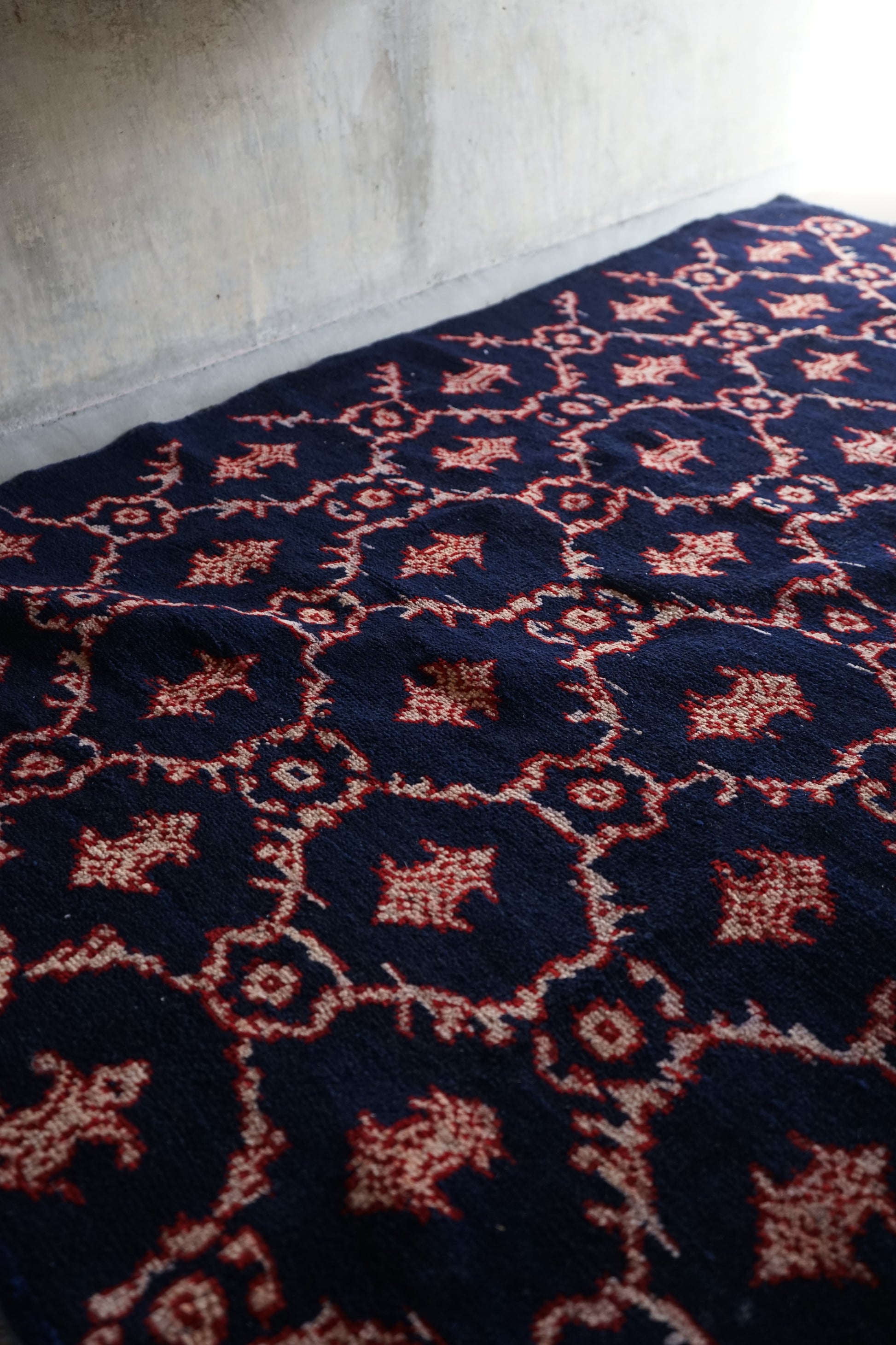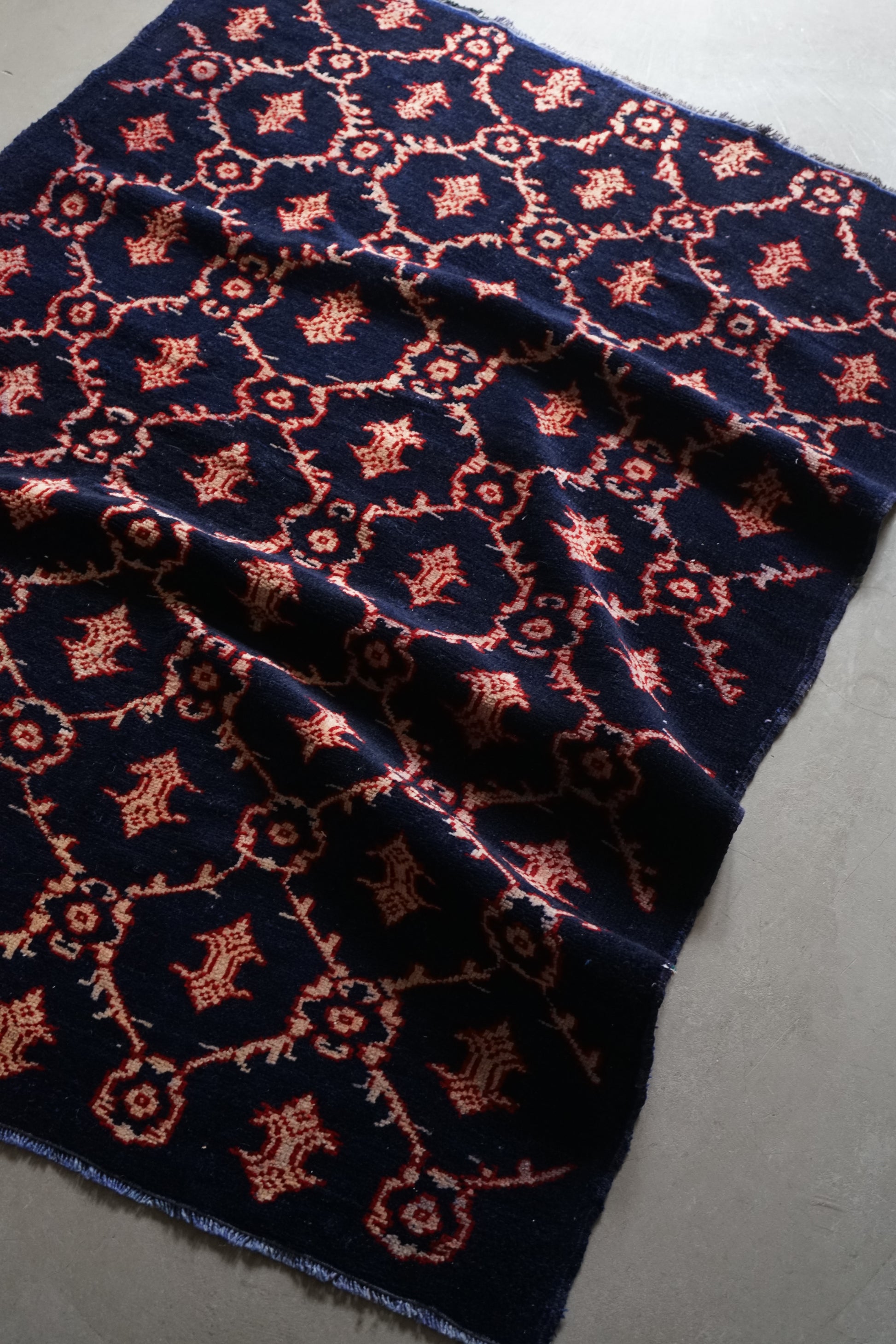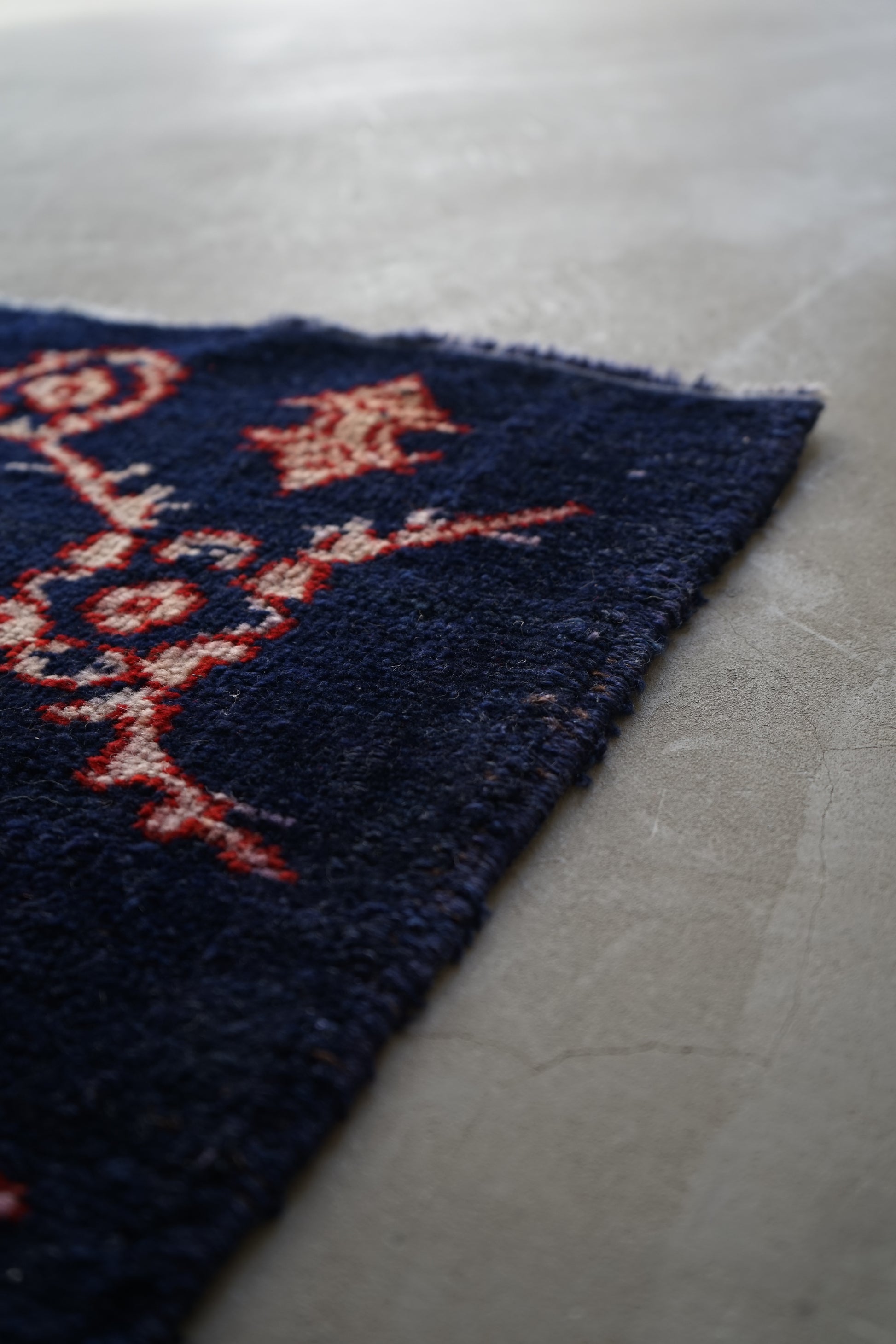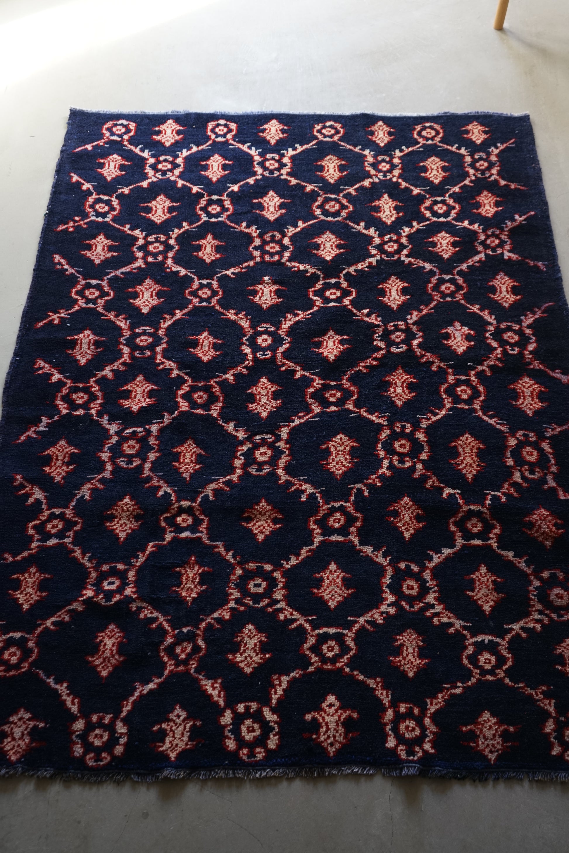 ふっくらとした毛並みに濃紺のイスパルタ絨毯。手織り特有の歪みも味わい深い表情のひとつとなっています。