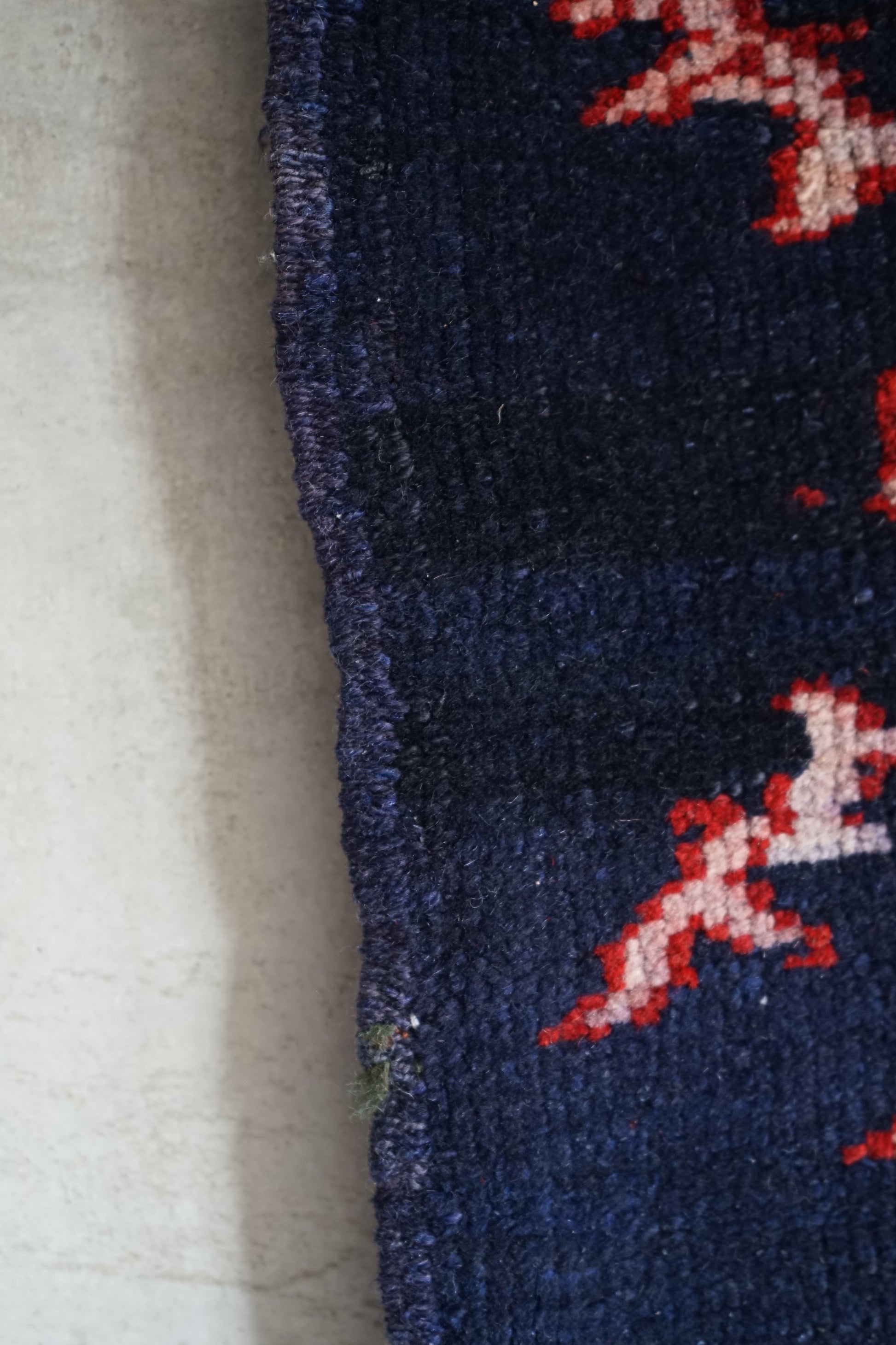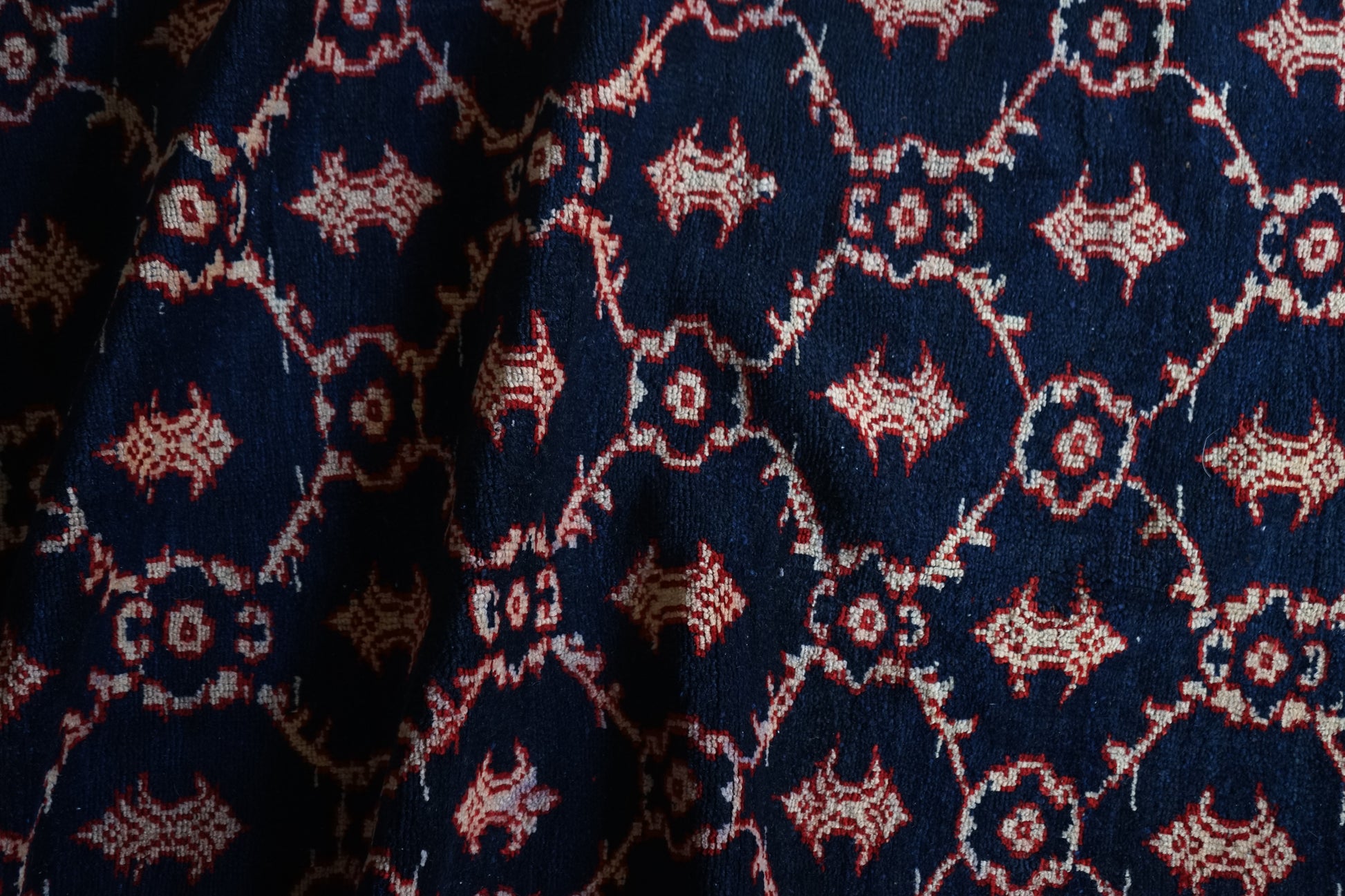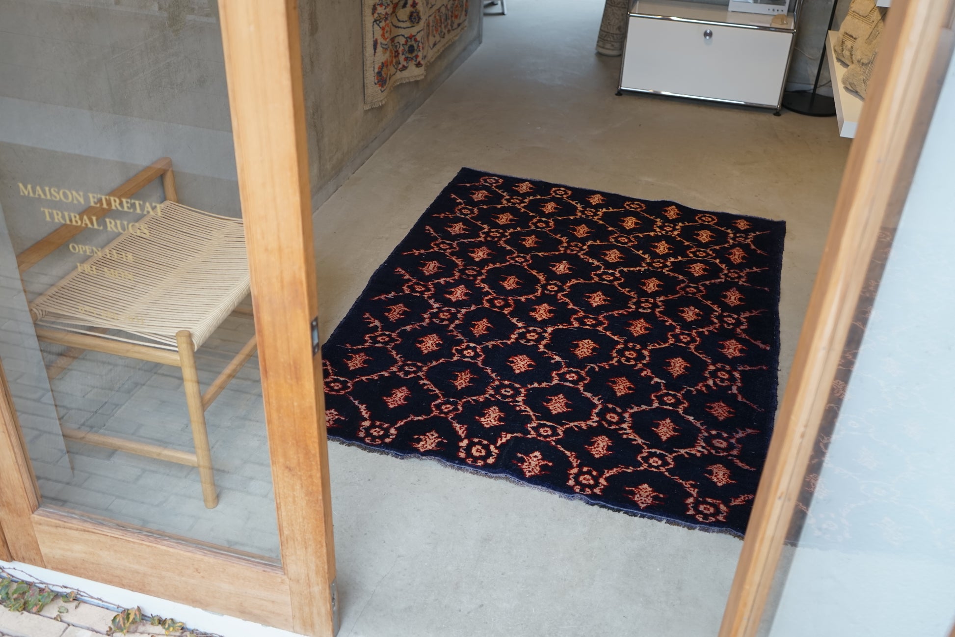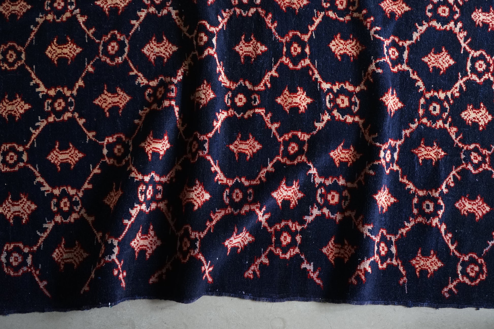 ふっくらとした毛並みに濃紺のイスパルタ絨毯。手織り特有の歪みも味わい深い表情のひとつとなっています。