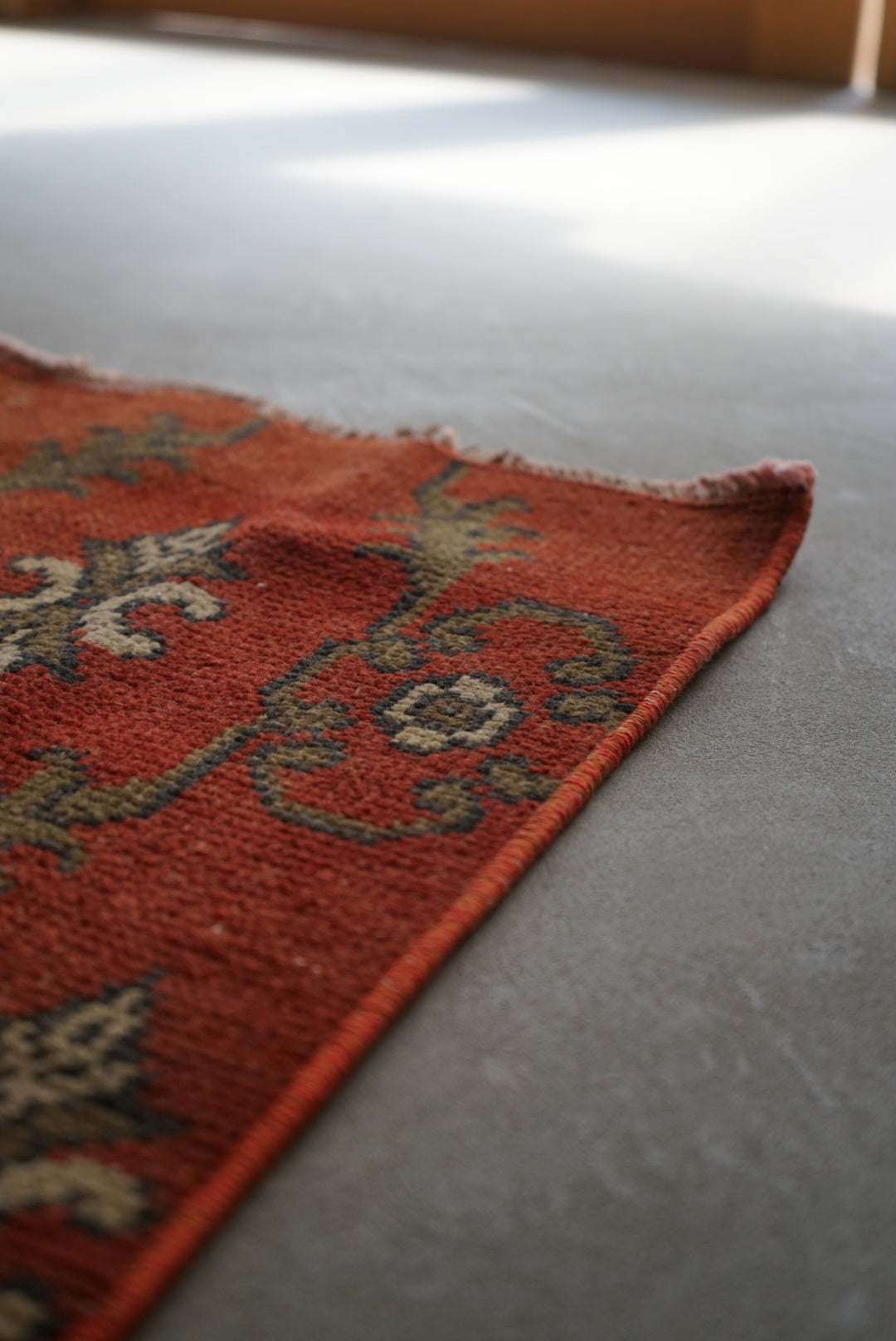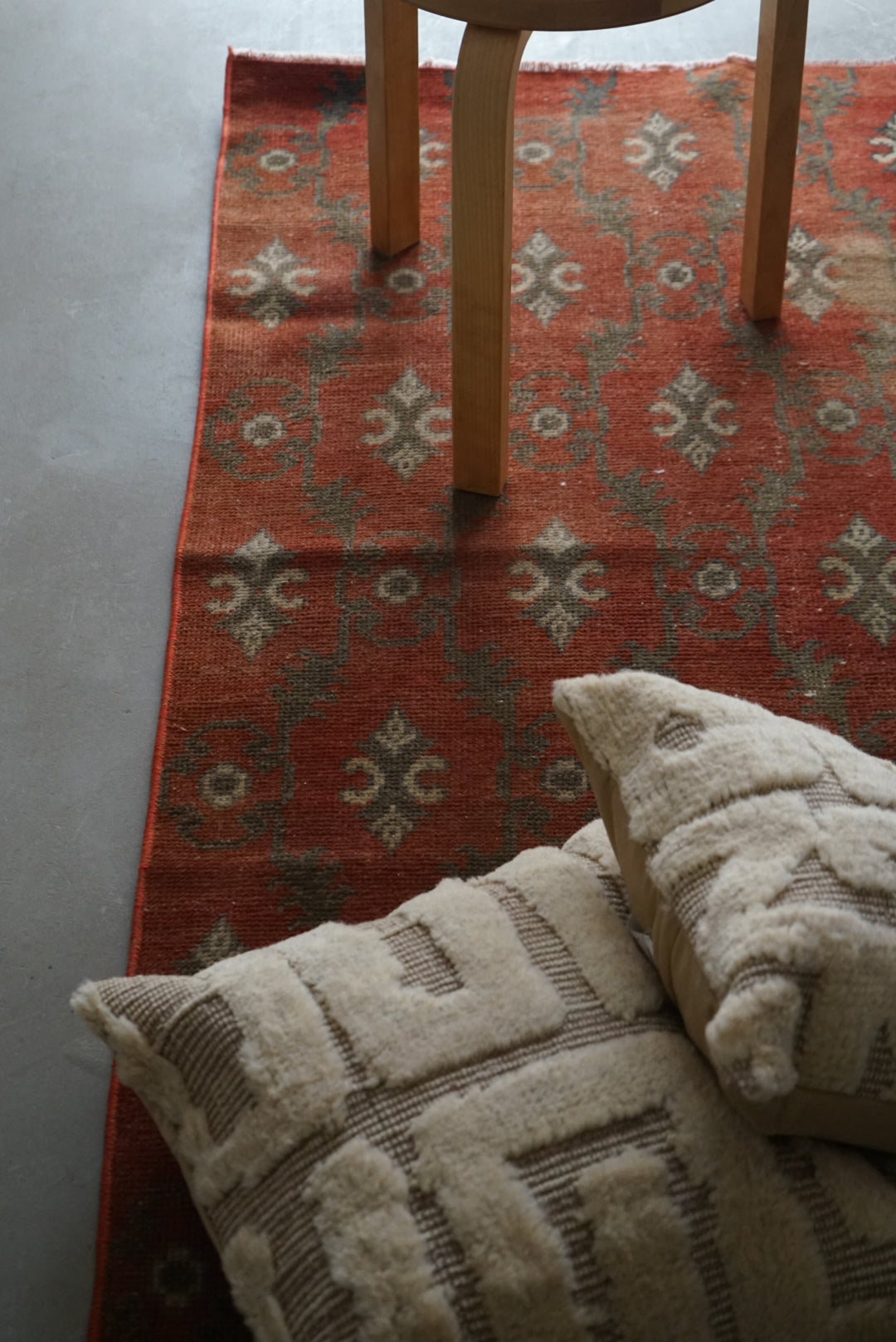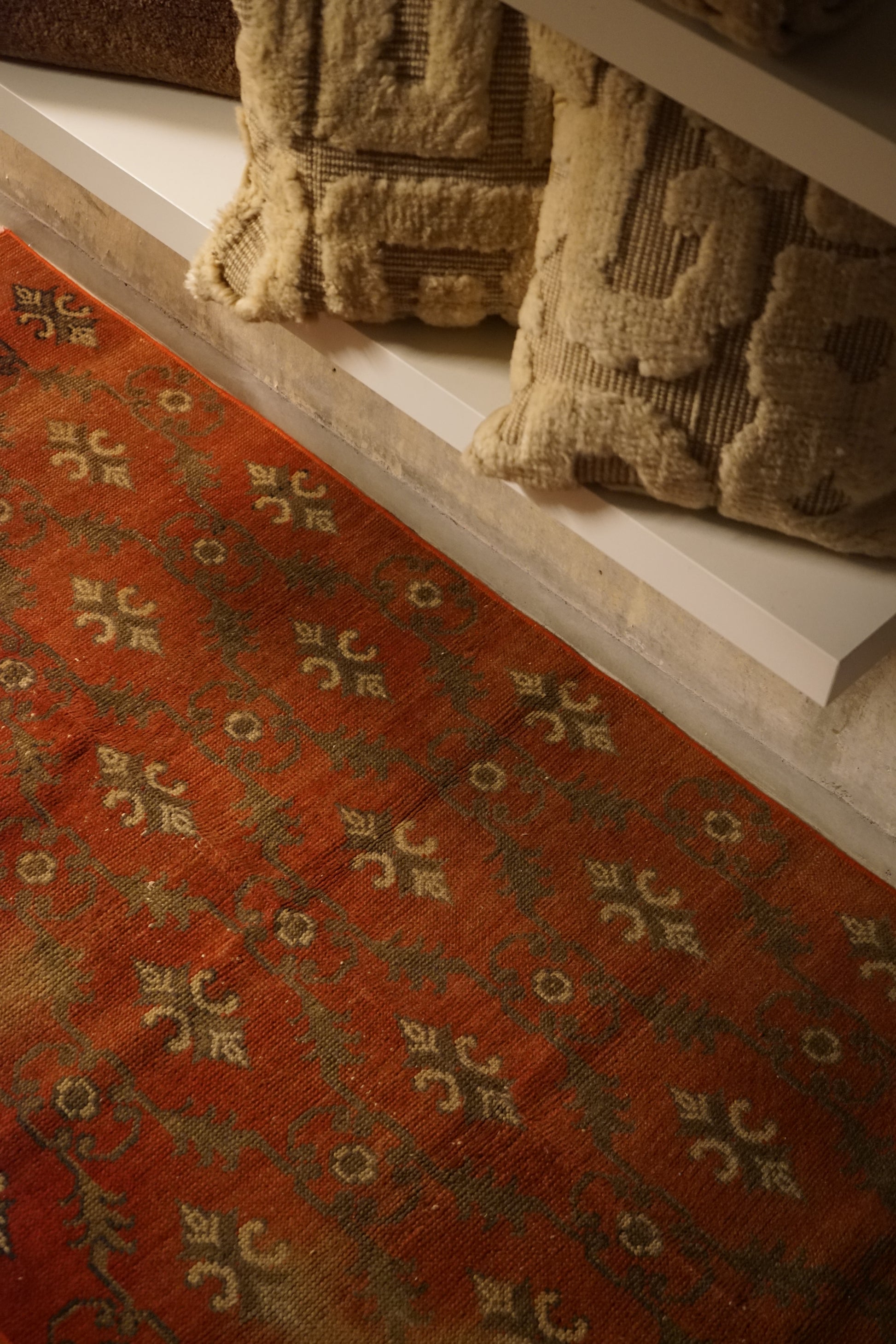 ブラッドオレンジ色のイスパルタ絨毯。クラシカルなものは月日を経た風合いの良さ、個性を大切に厳選しています。