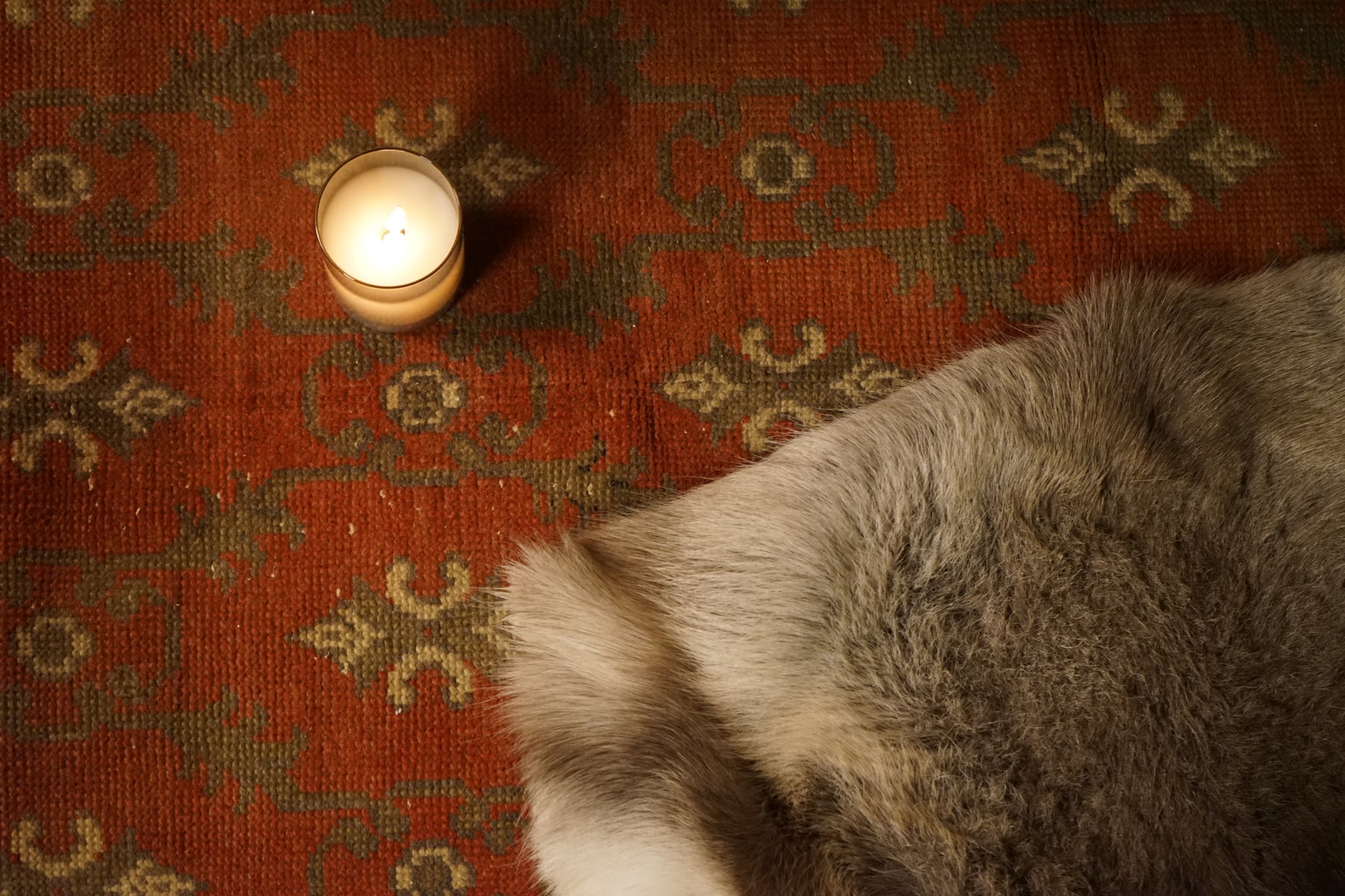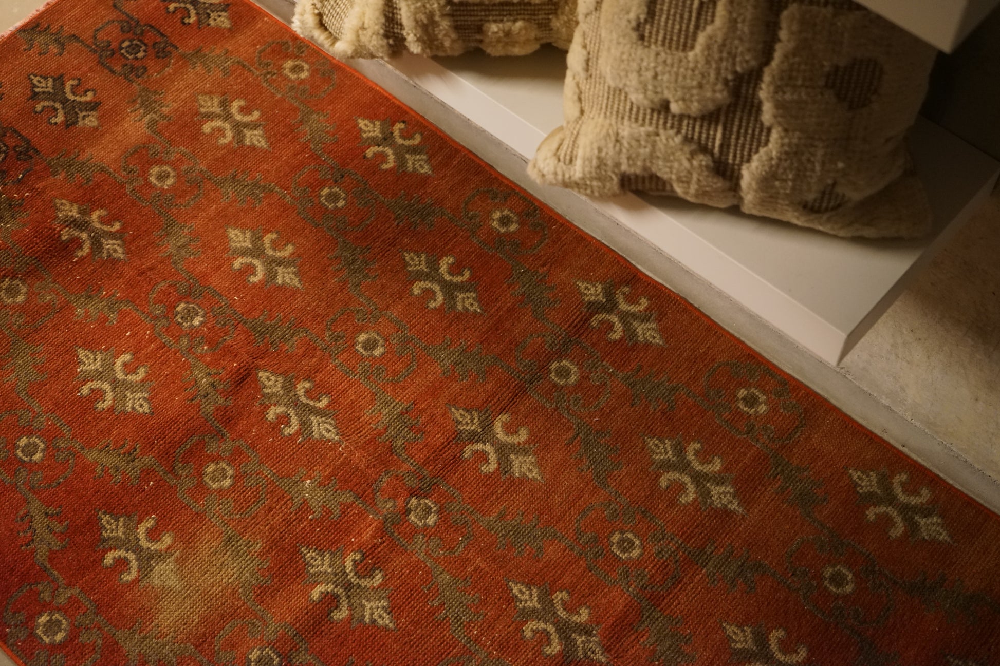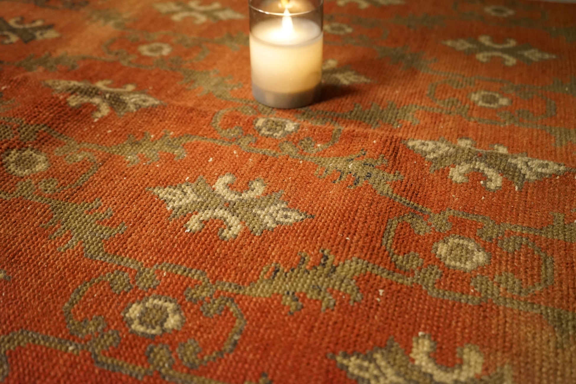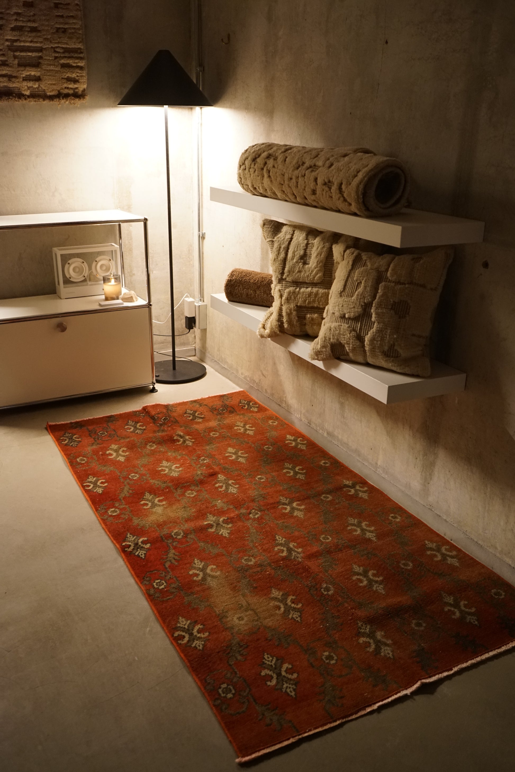ブラッドオレンジ色のイスパルタ絨毯。クラシカルなものは月日を経た風合いの良さ、個性を大切に厳選しています。