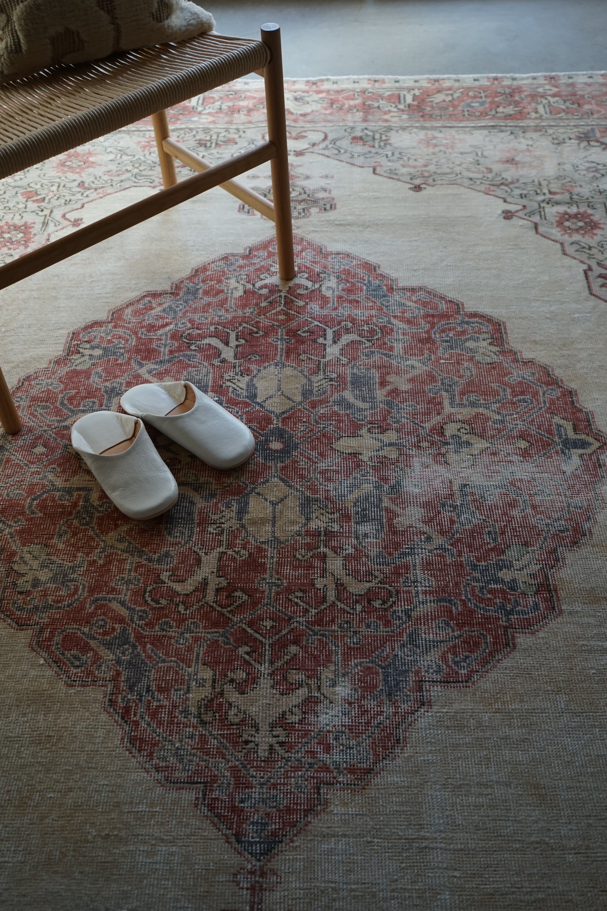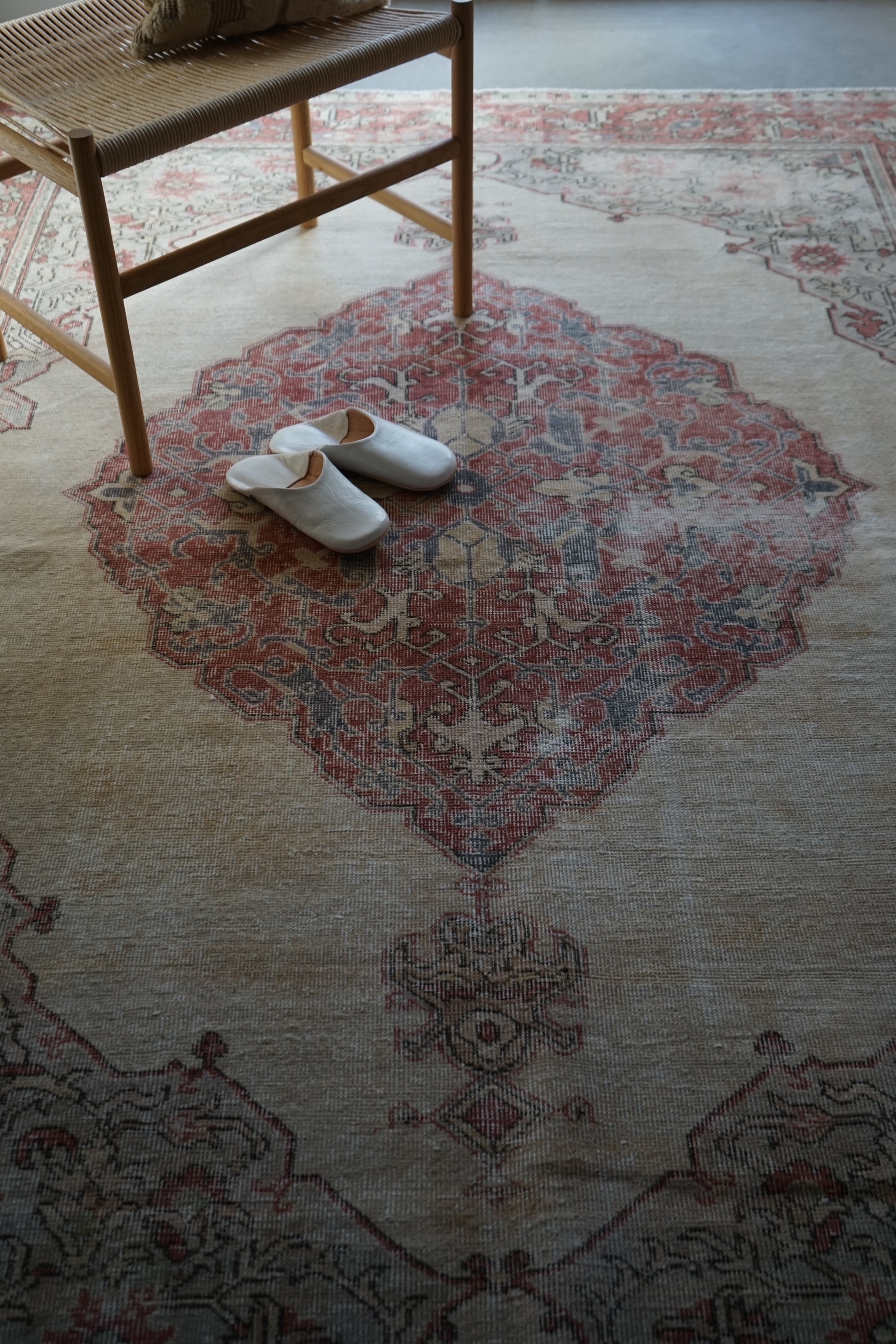 褐色になった赤色はピンクになり、温かみ溢れる姿になりました。メダリオンに細かな草木模様が広がる華やかなイスパルタ絨毯です。