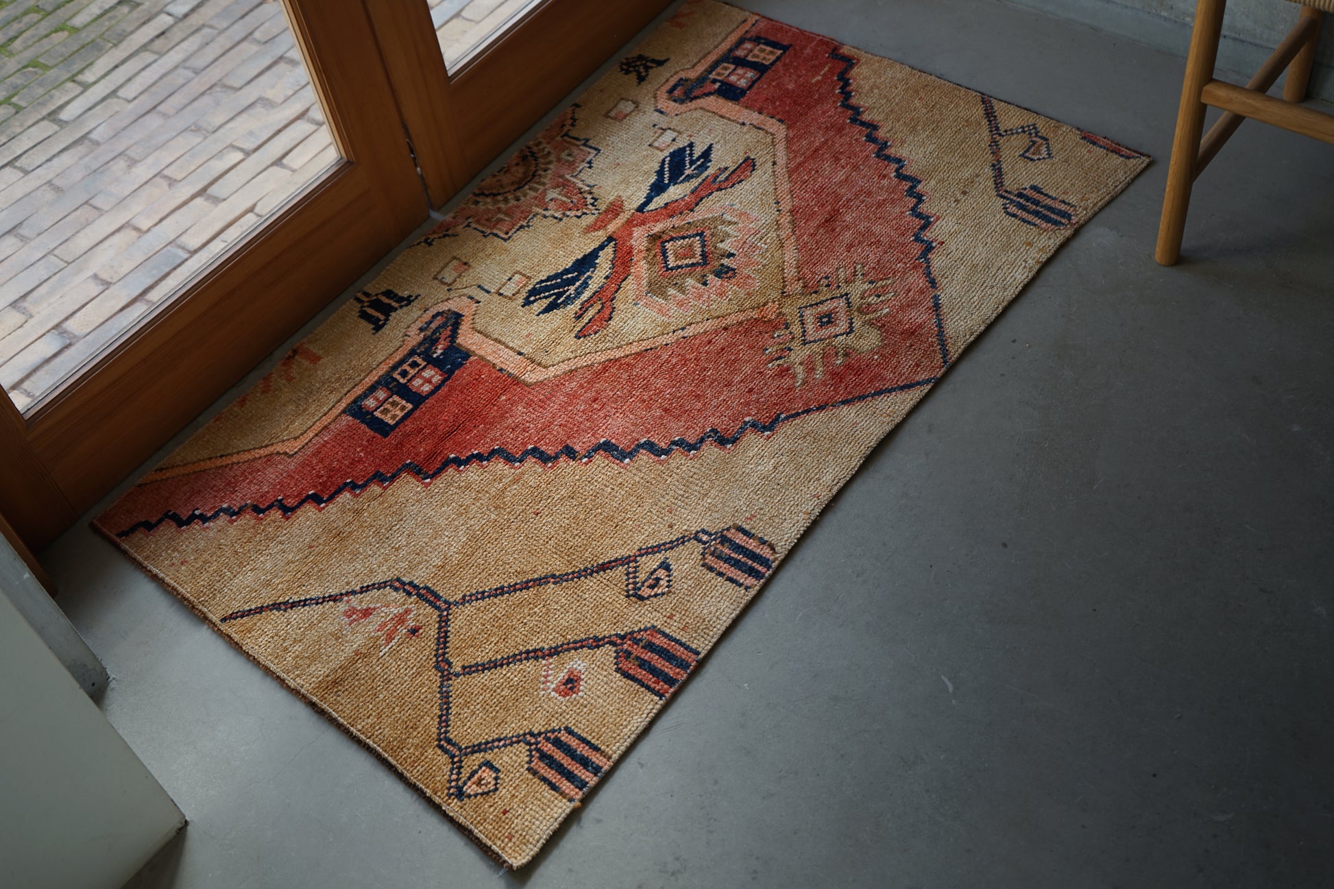 ぬくもりあるベージュ色のスモールサイズラグ。レッドのメダリオンにオリエンタルな草木模様が広がります。
