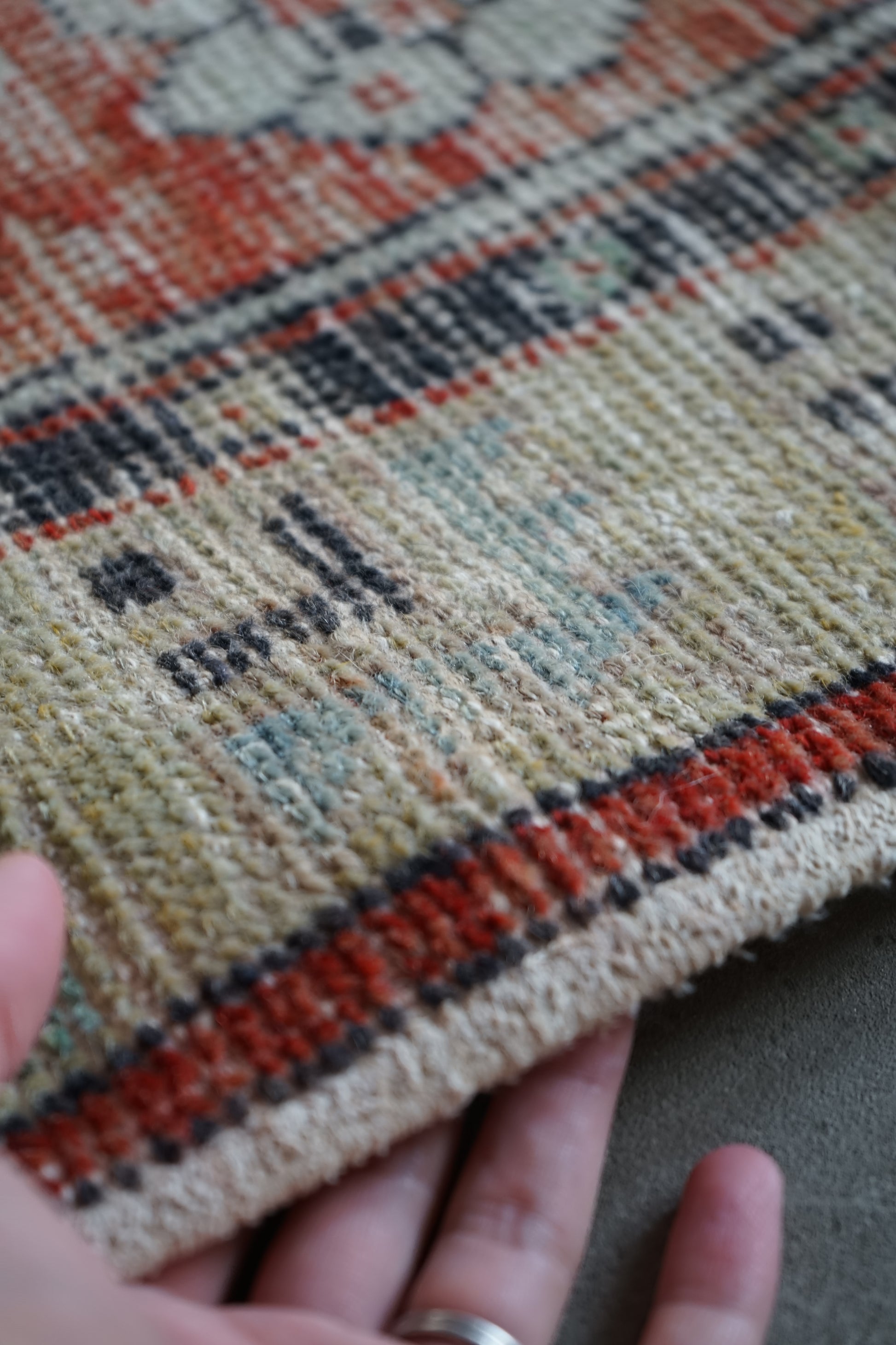 全体的に表面の羊毛(パイル)は短く摩耗しております。芯地はコットンなので丈夫です、厚みは3mm程度です。