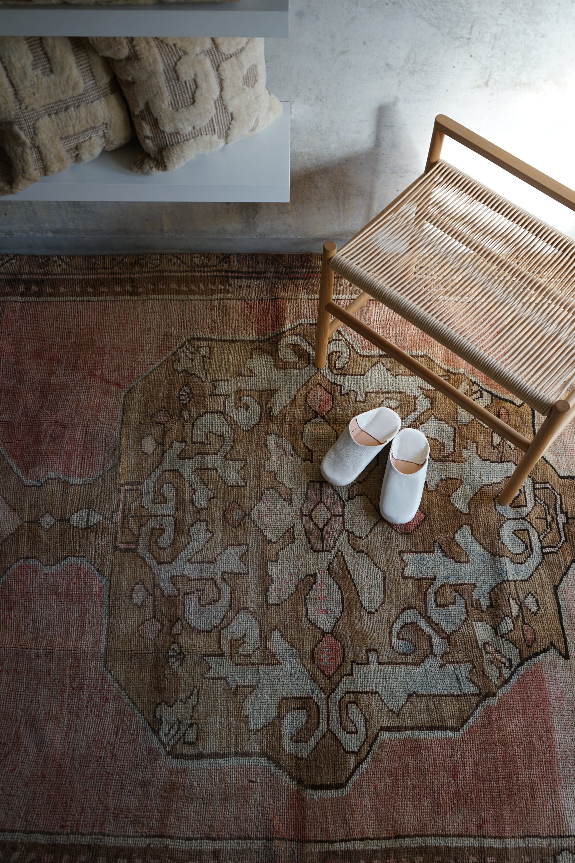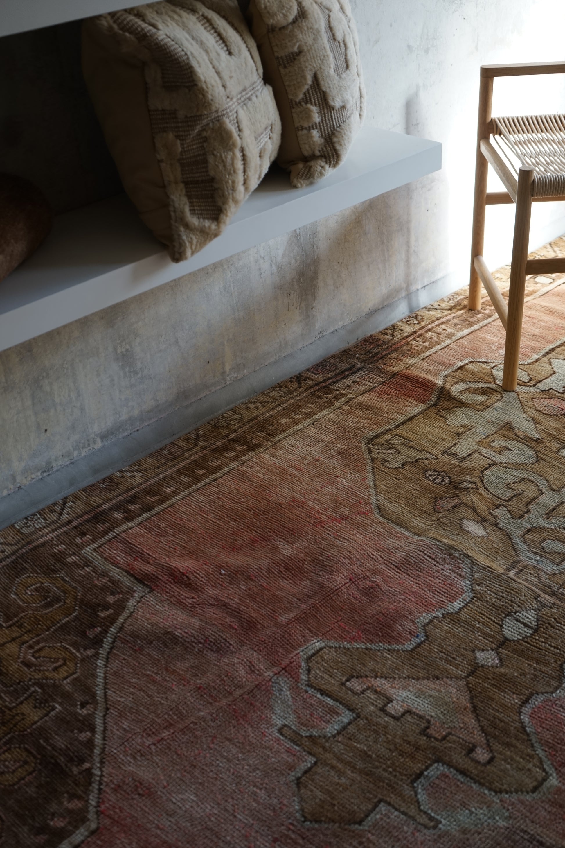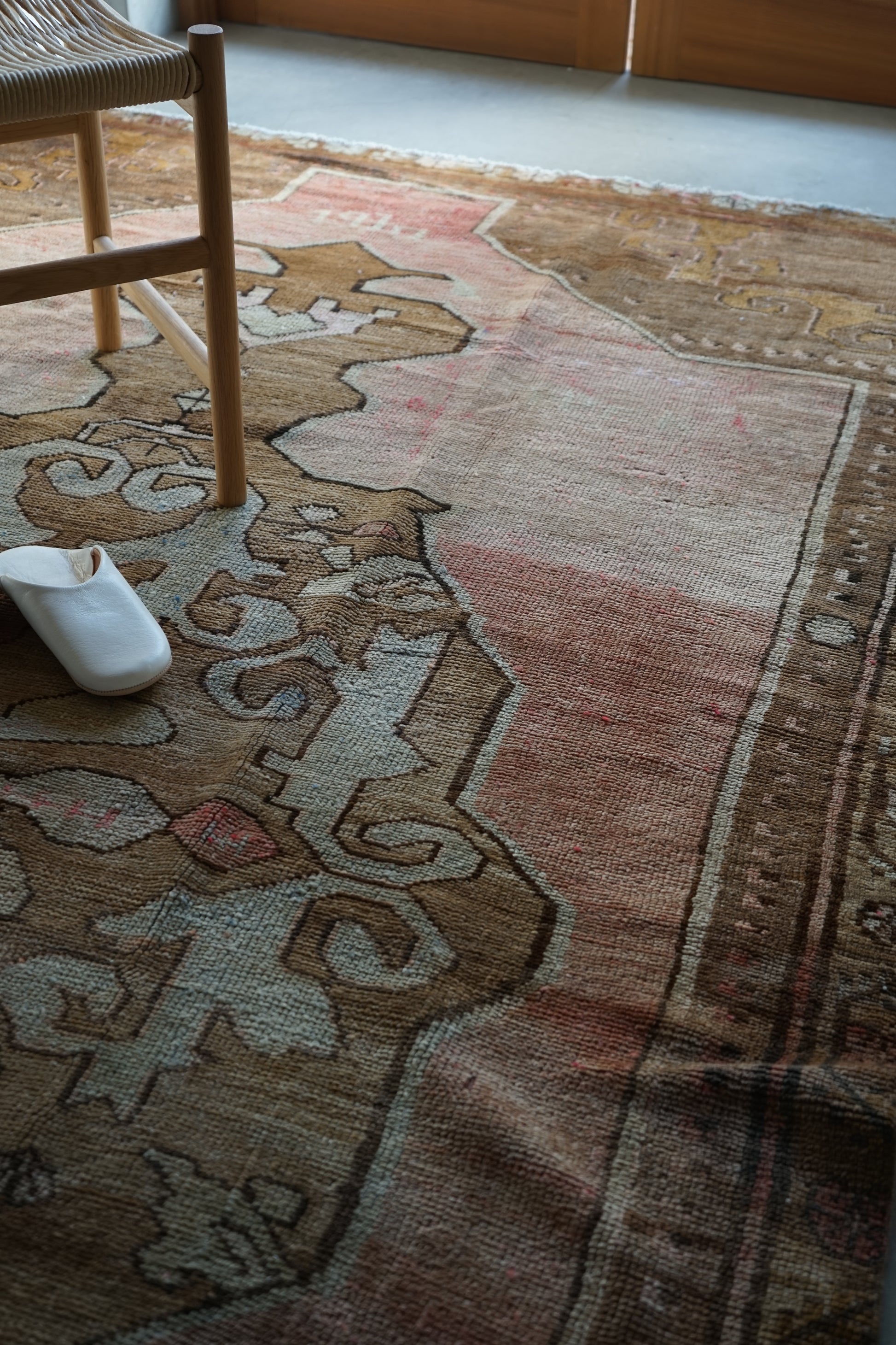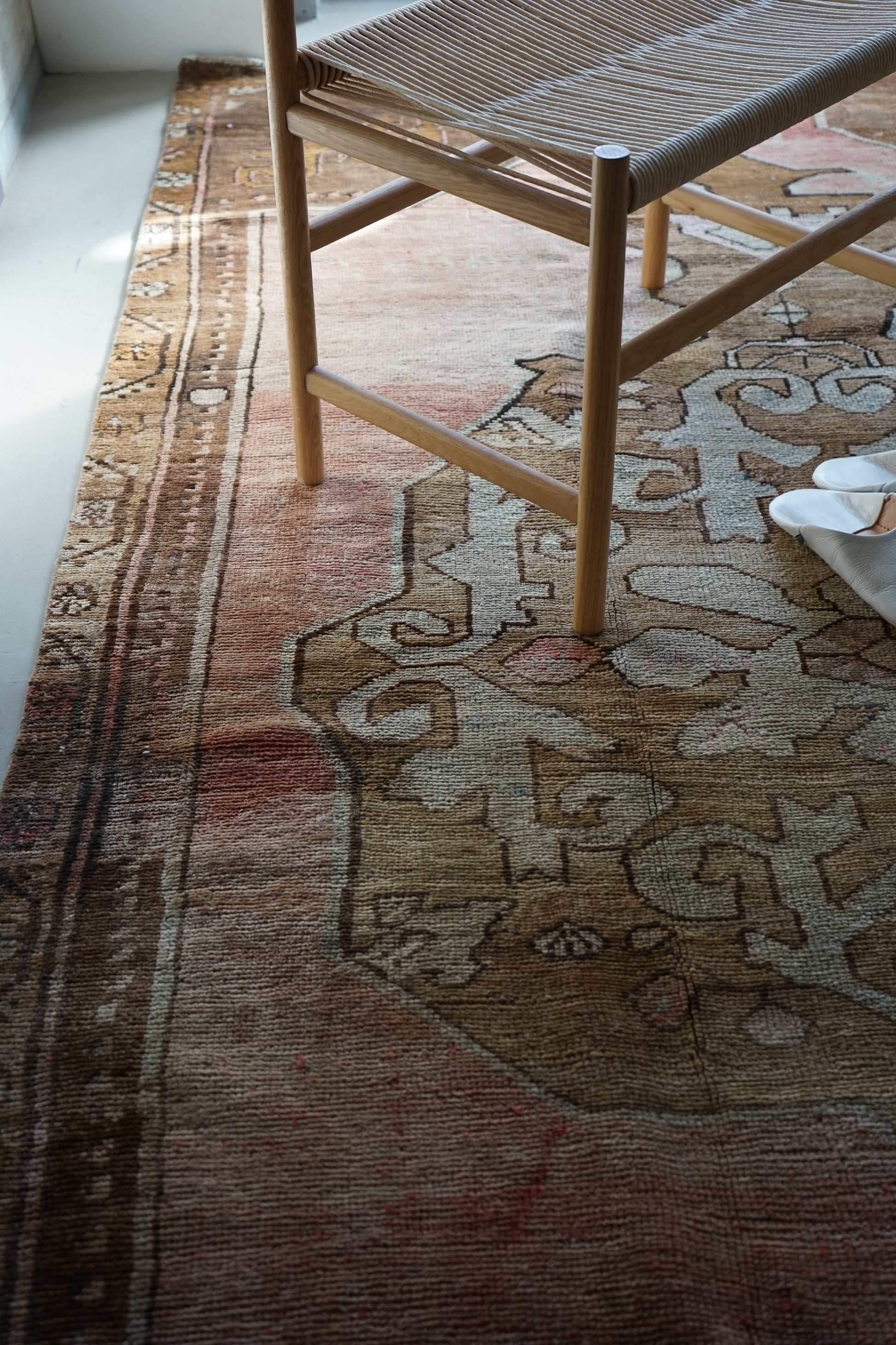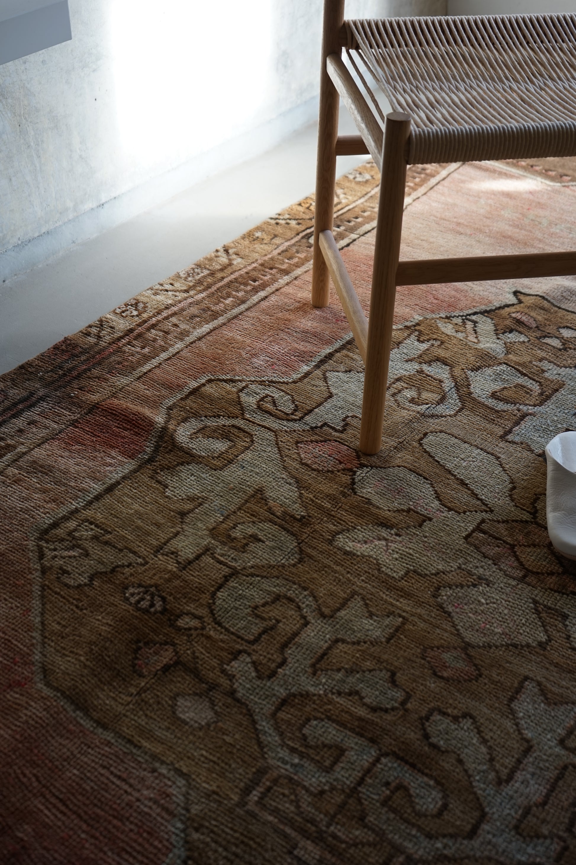 褐色のサーモンピンクが美しいウシャク絨毯。ナチュラルインテリアに万能のコーディネートをみせてくれる一枚です。