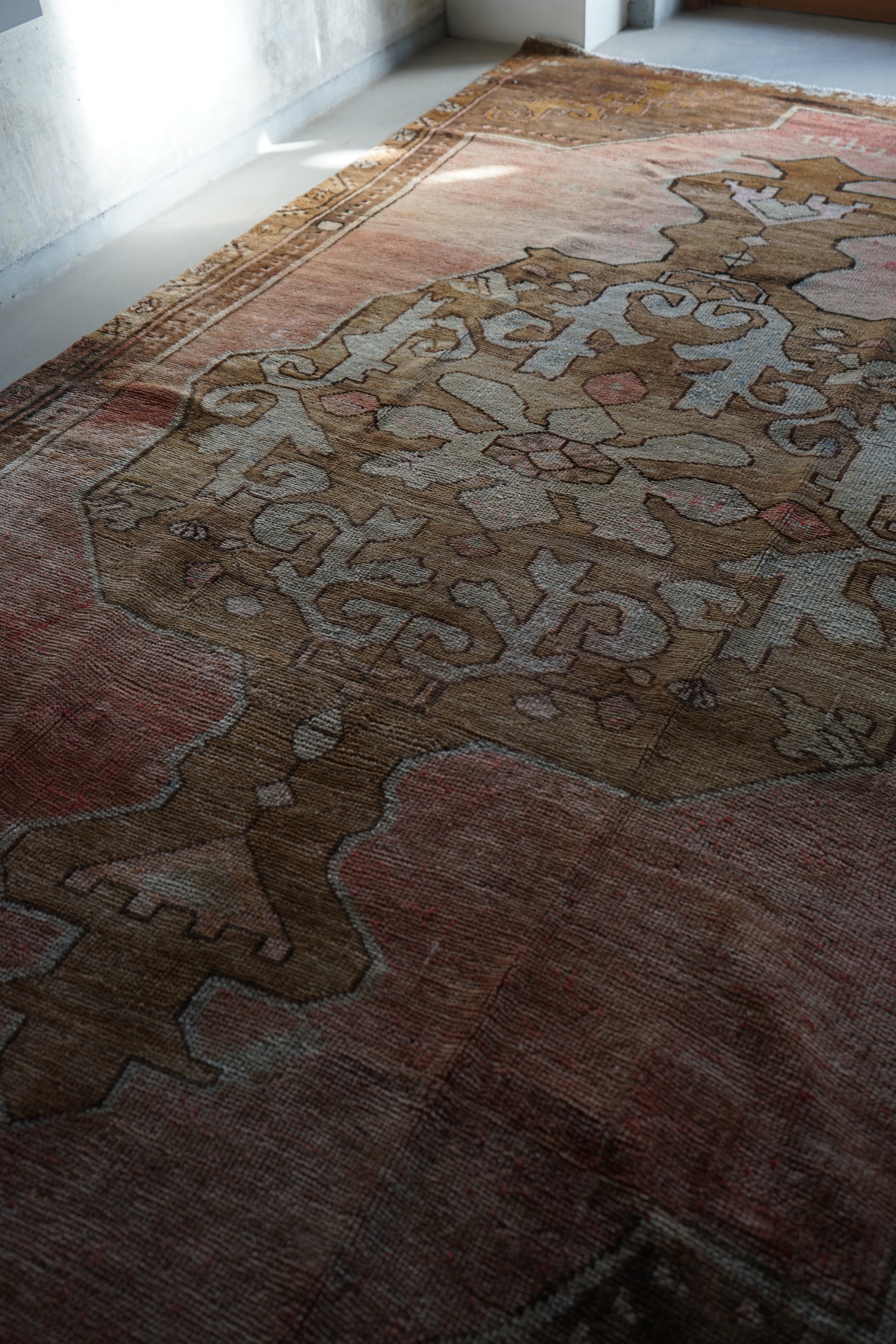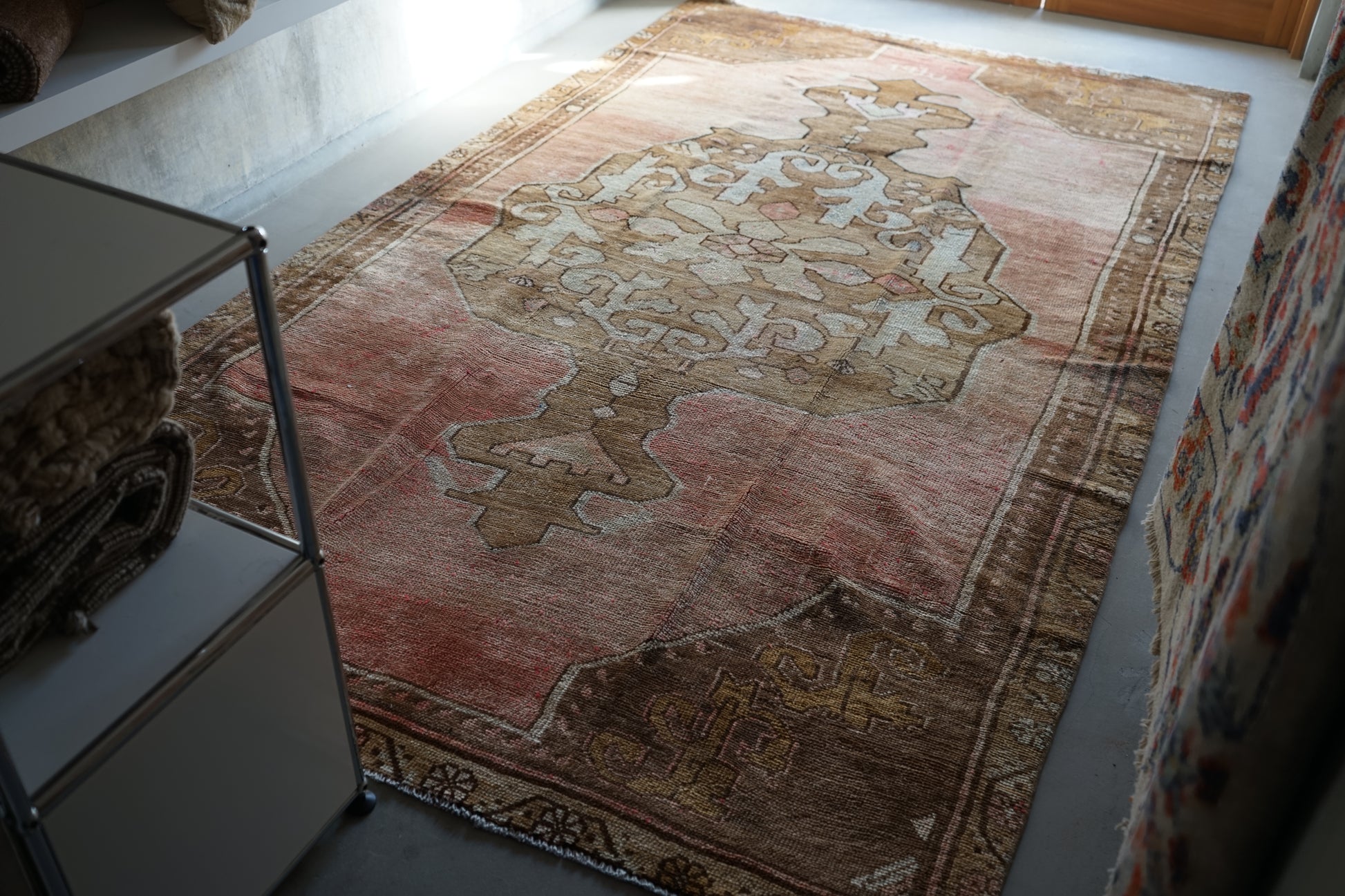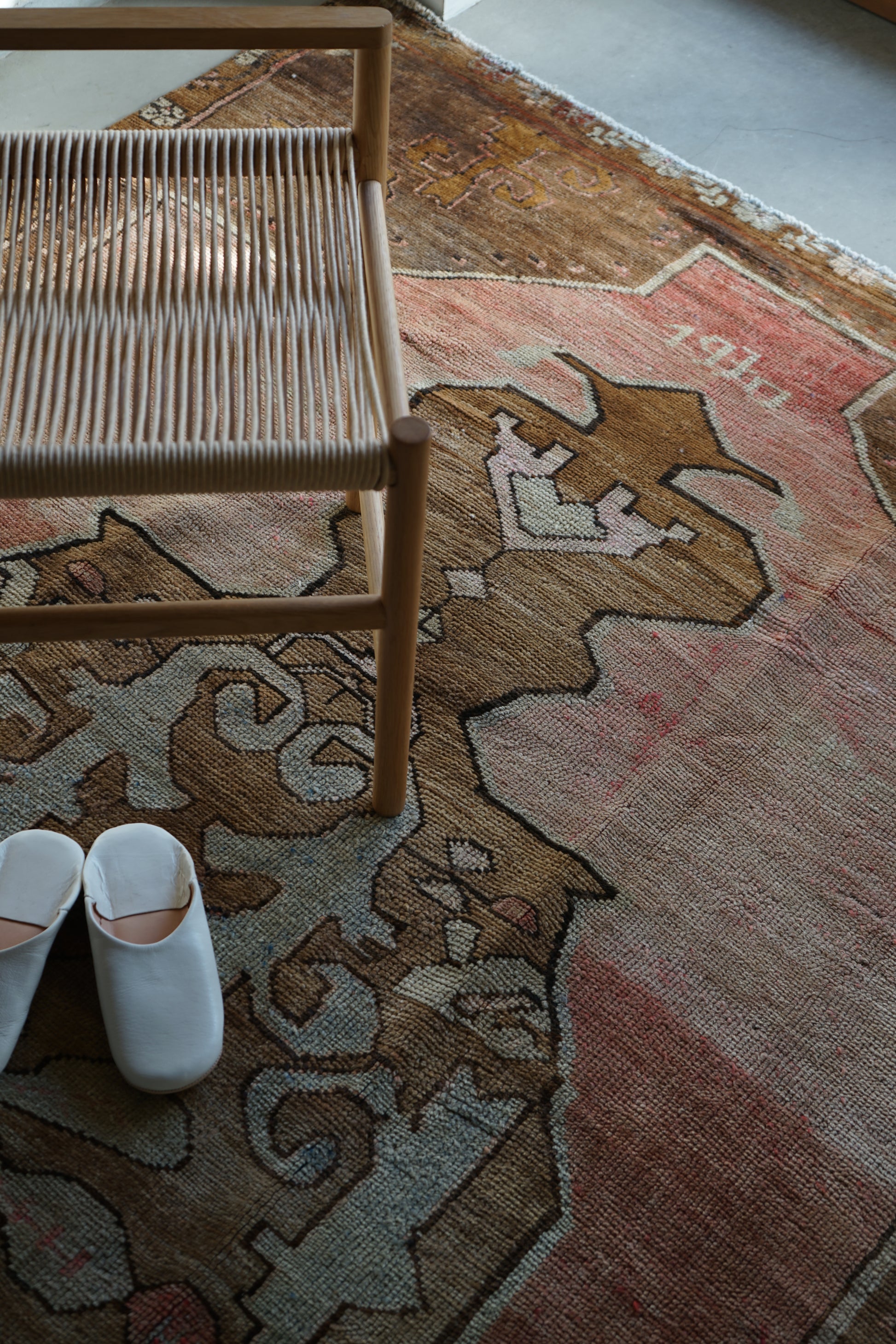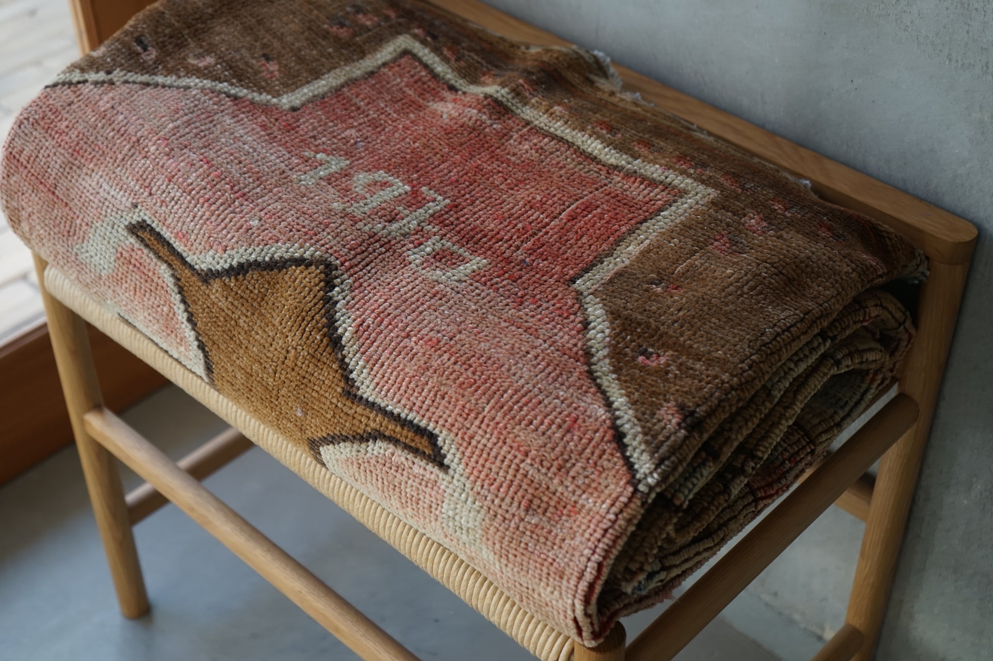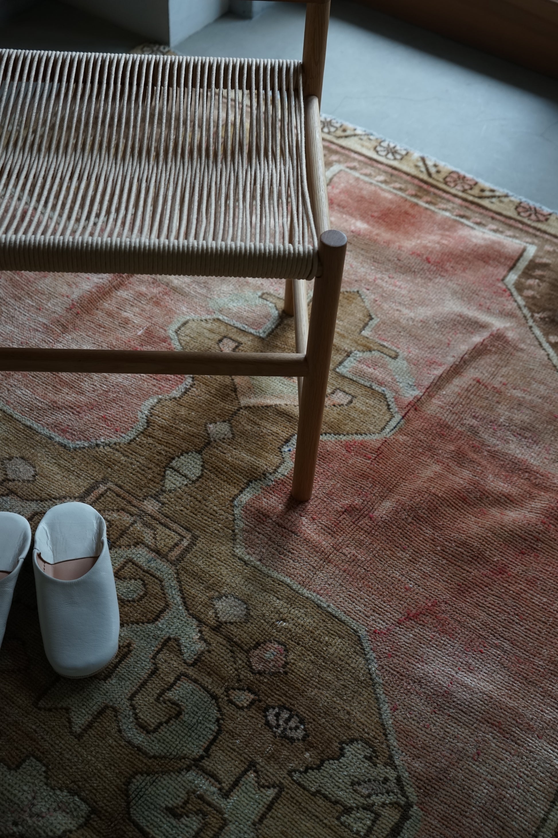 褐色のサーモンピンクが美しいウシャク絨毯。ナチュラルインテリアに万能のコーディネートをみせてくれる一枚です。