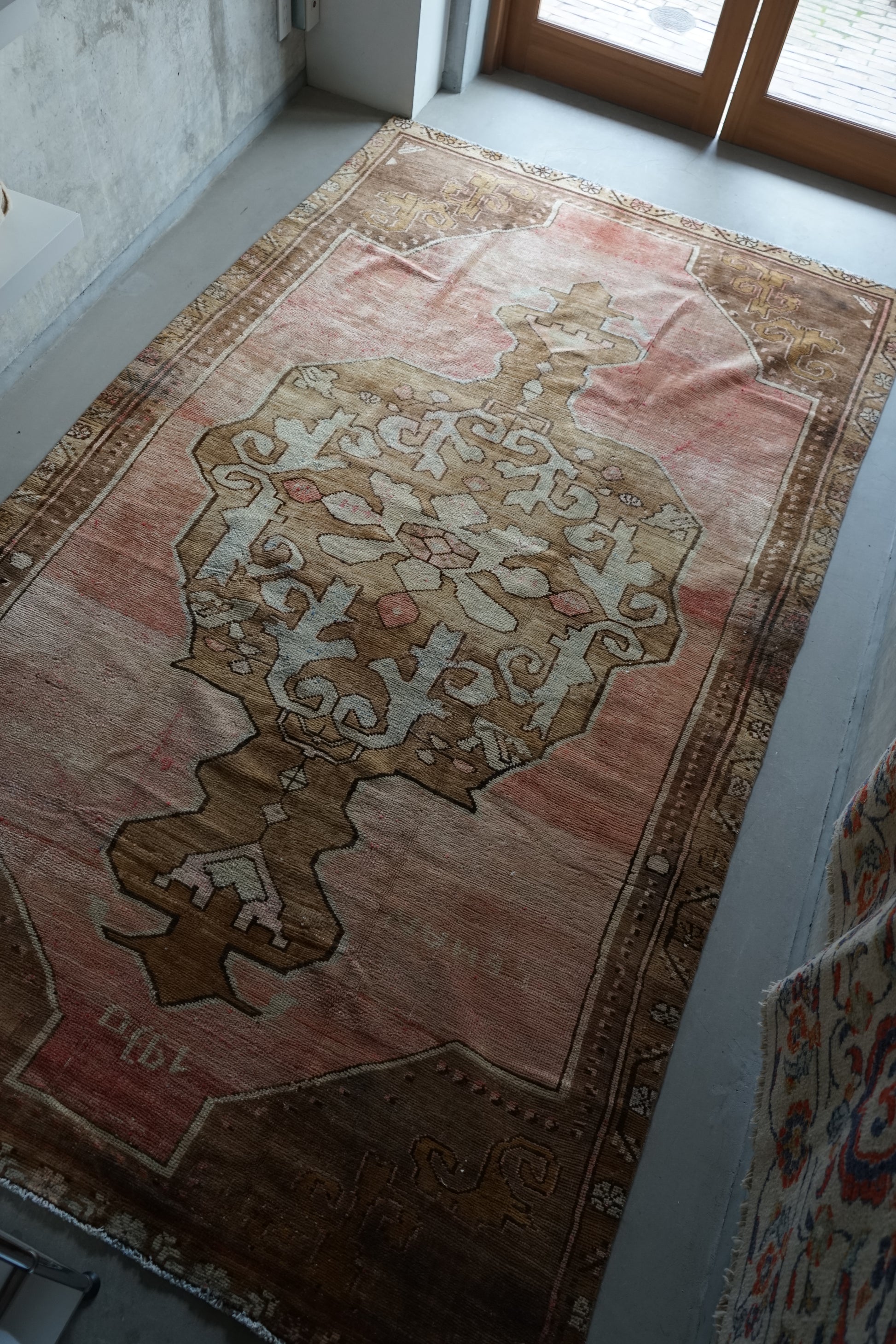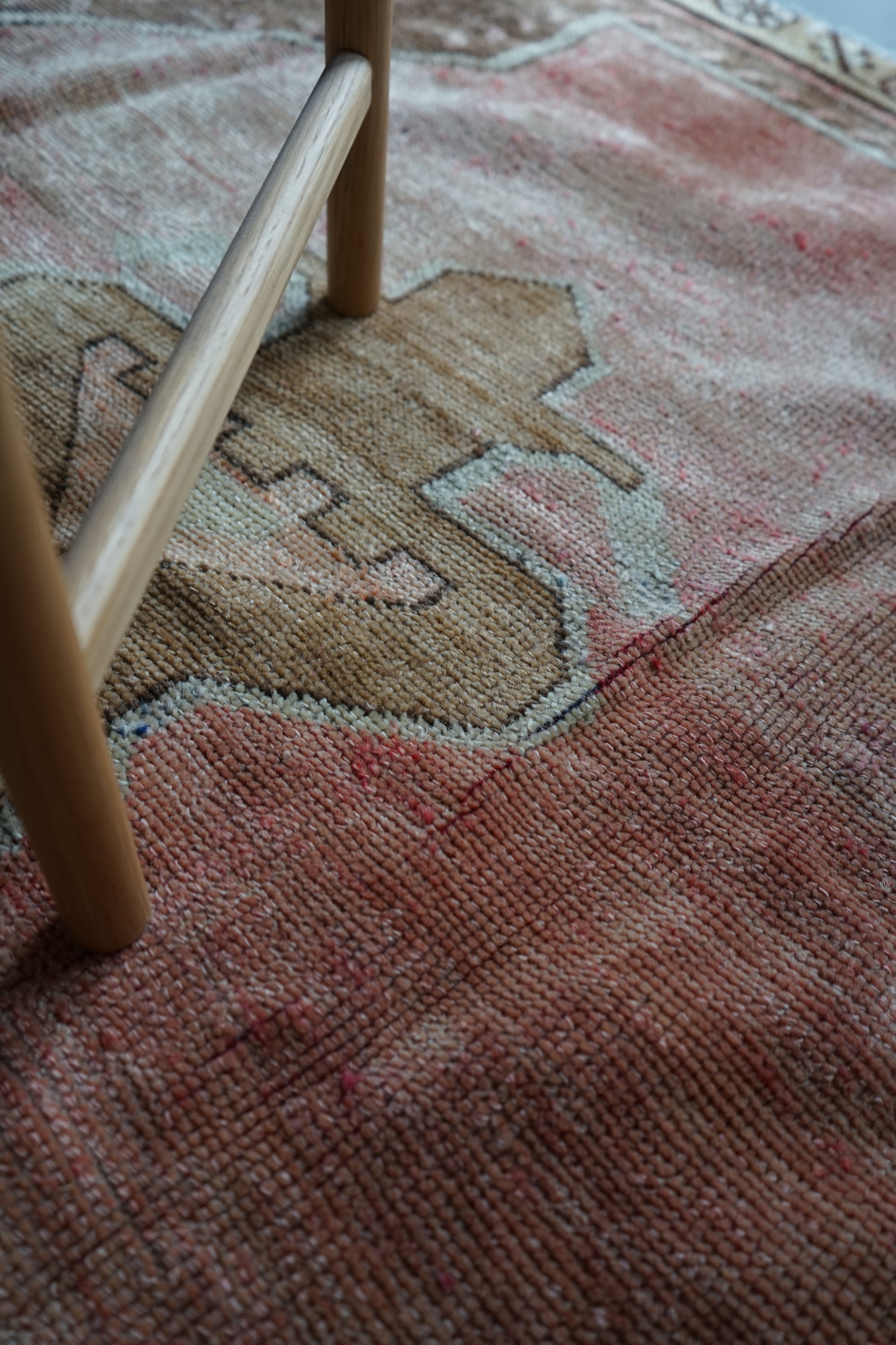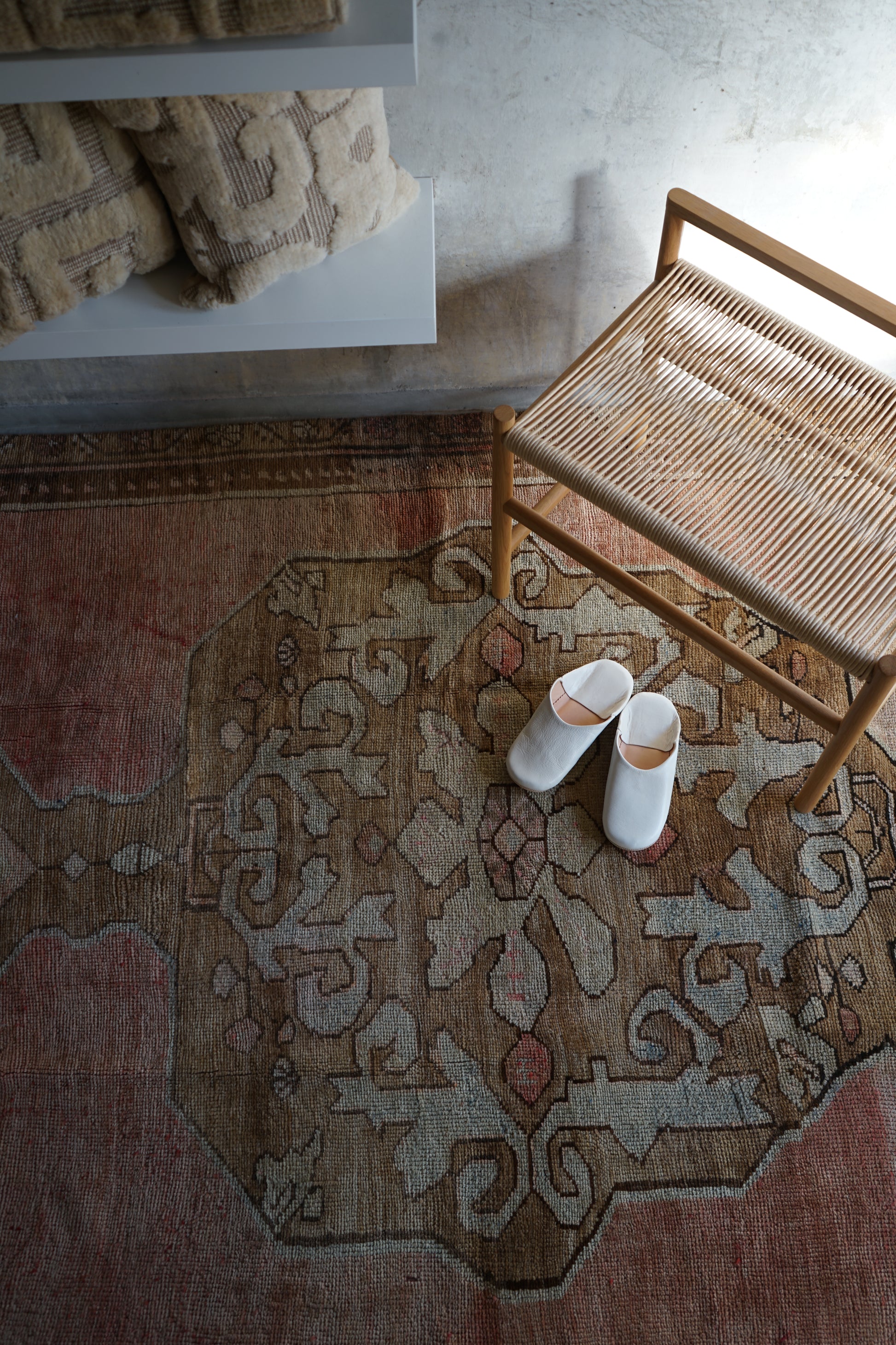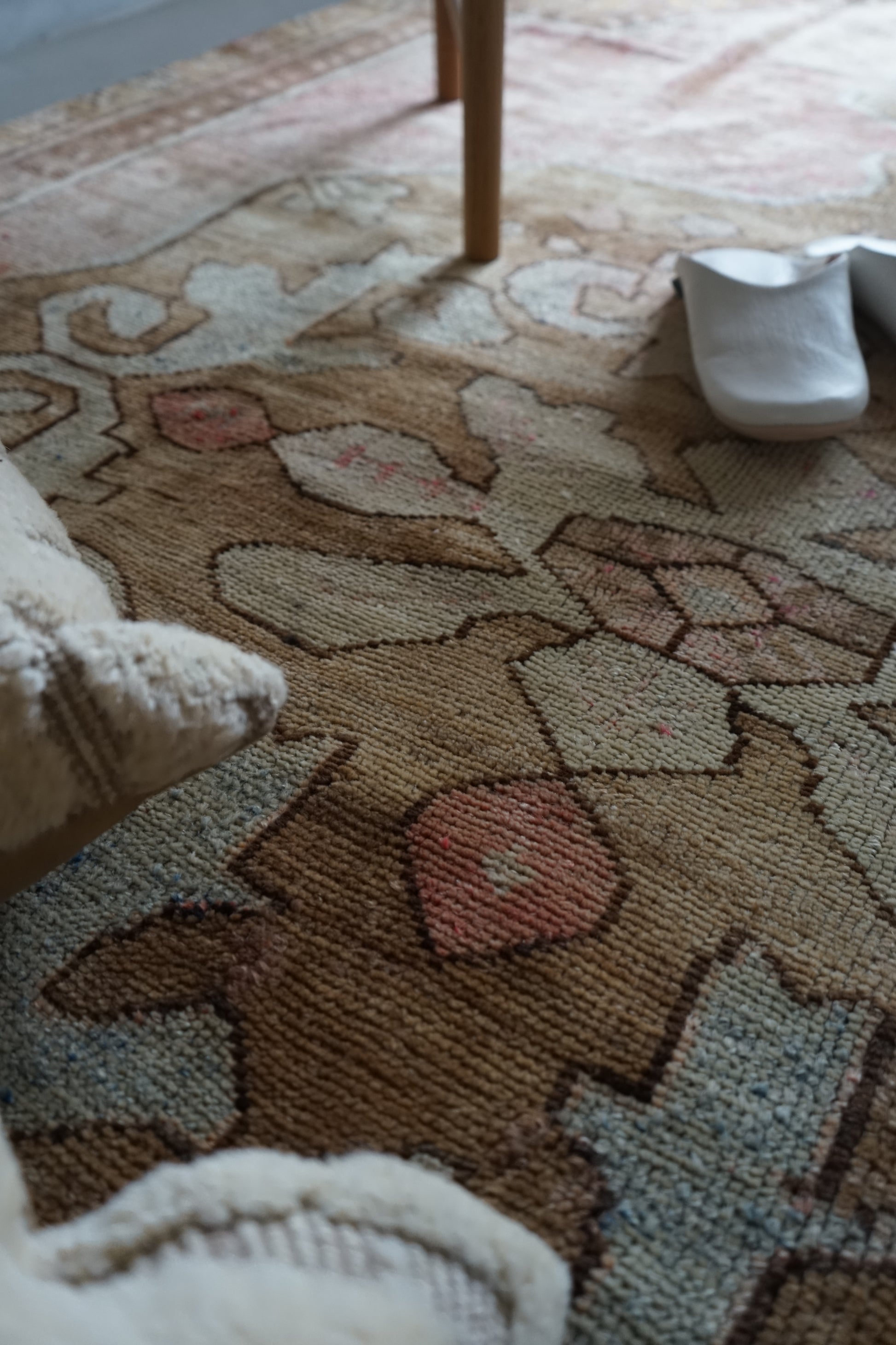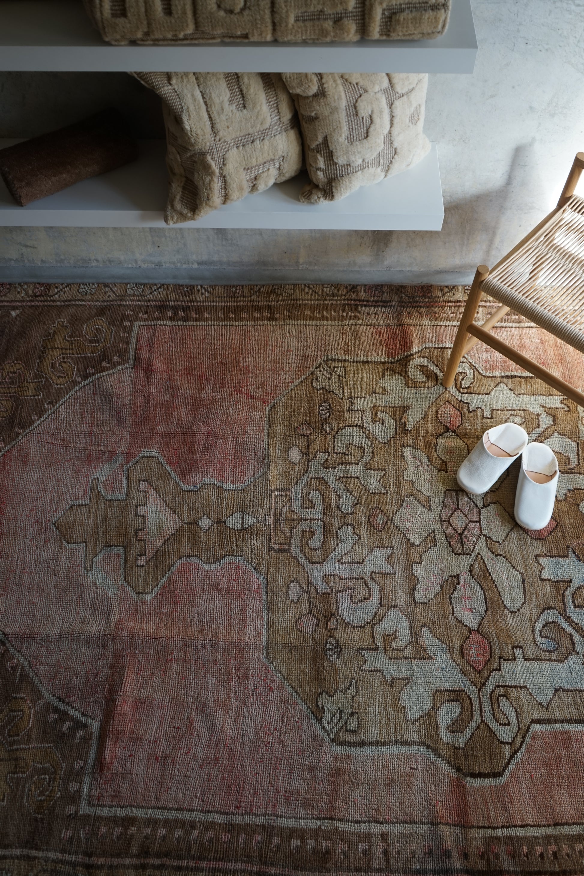 褐色のサーモンピンクが美しいウシャク絨毯。ナチュラルインテリアに万能のコーディネートをみせてくれる一枚です。