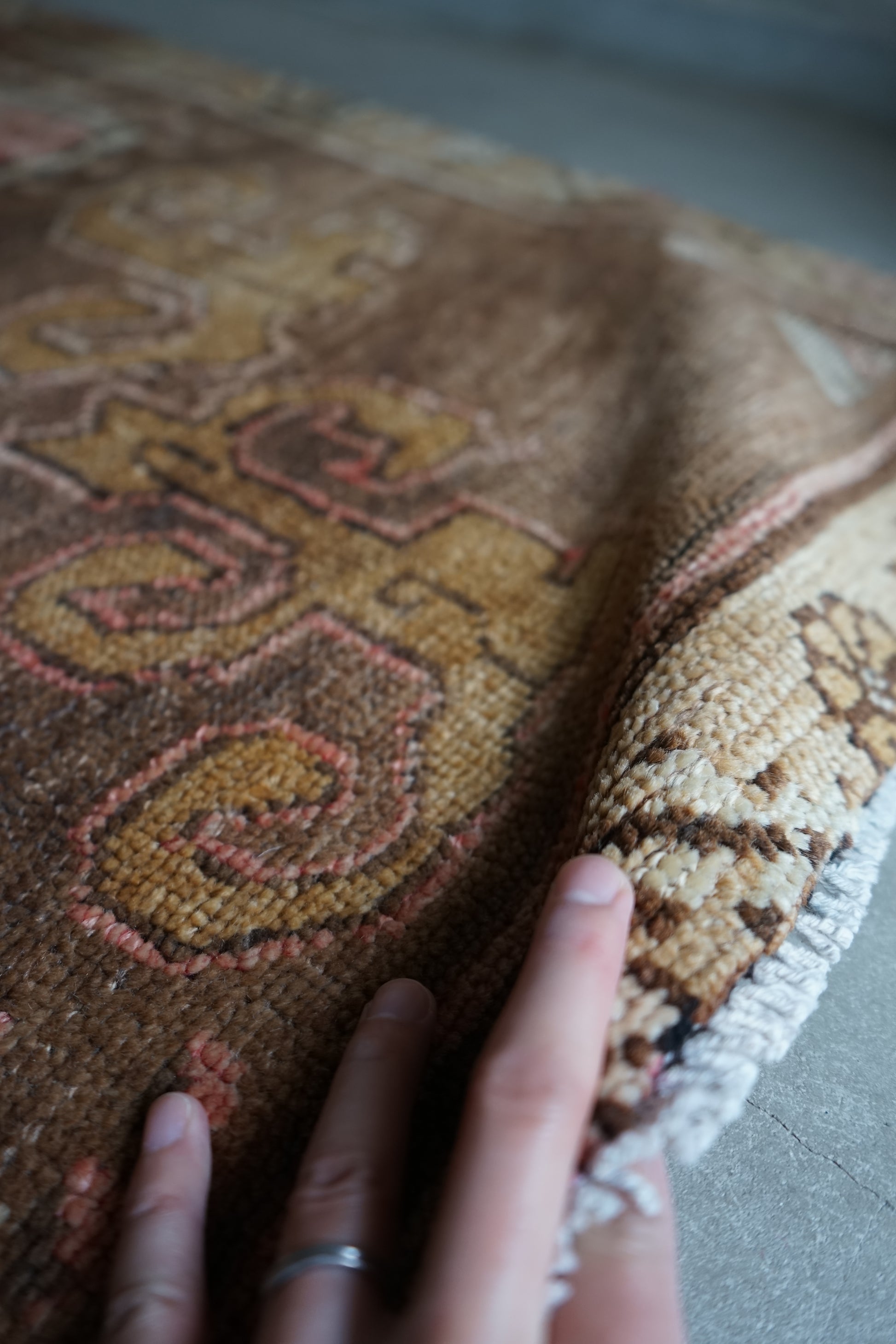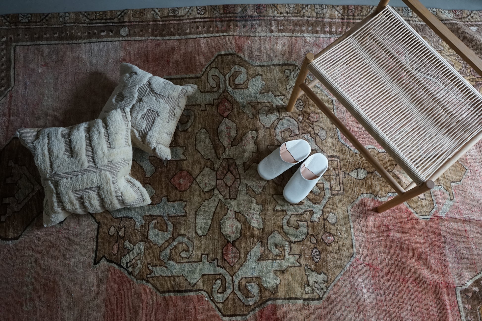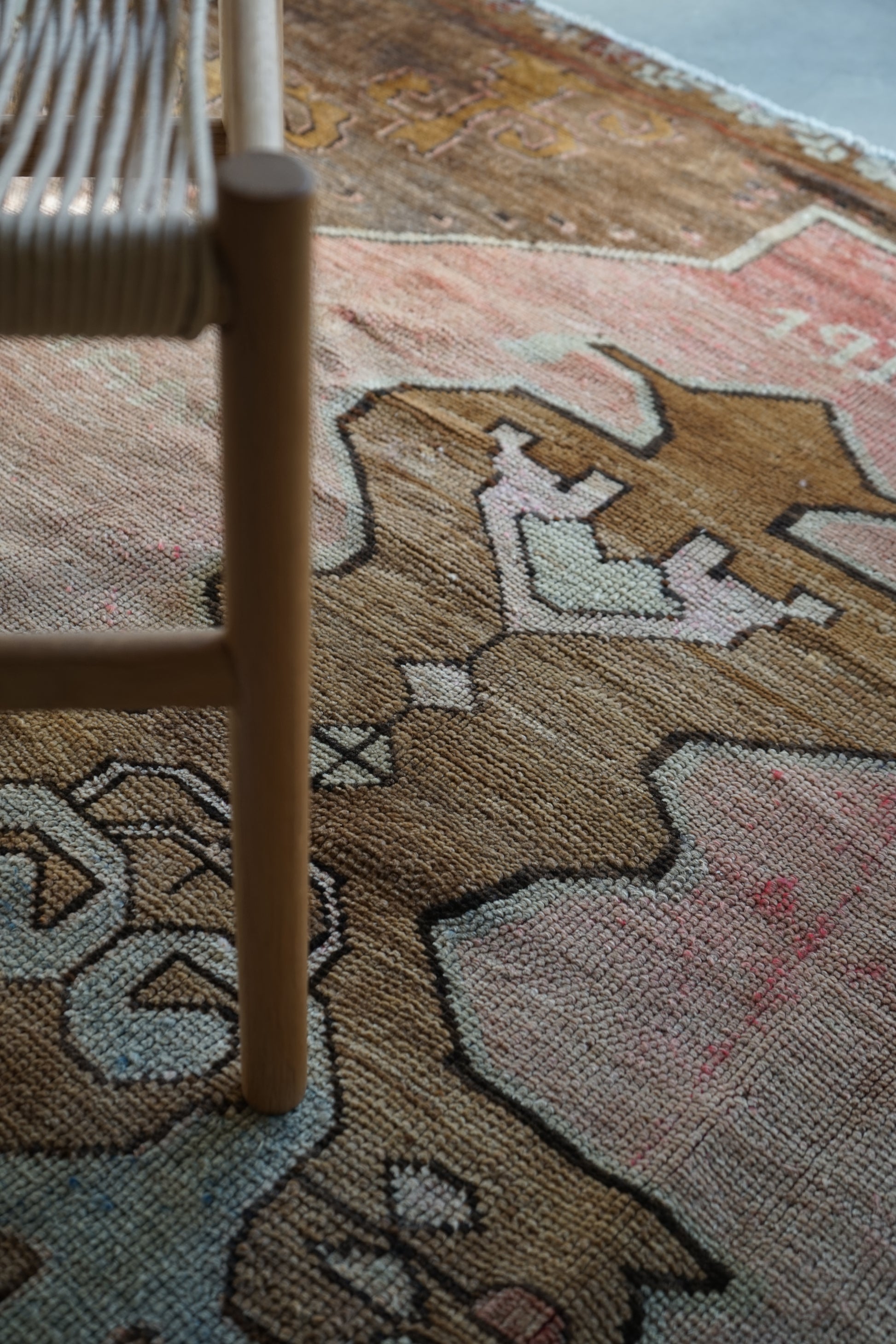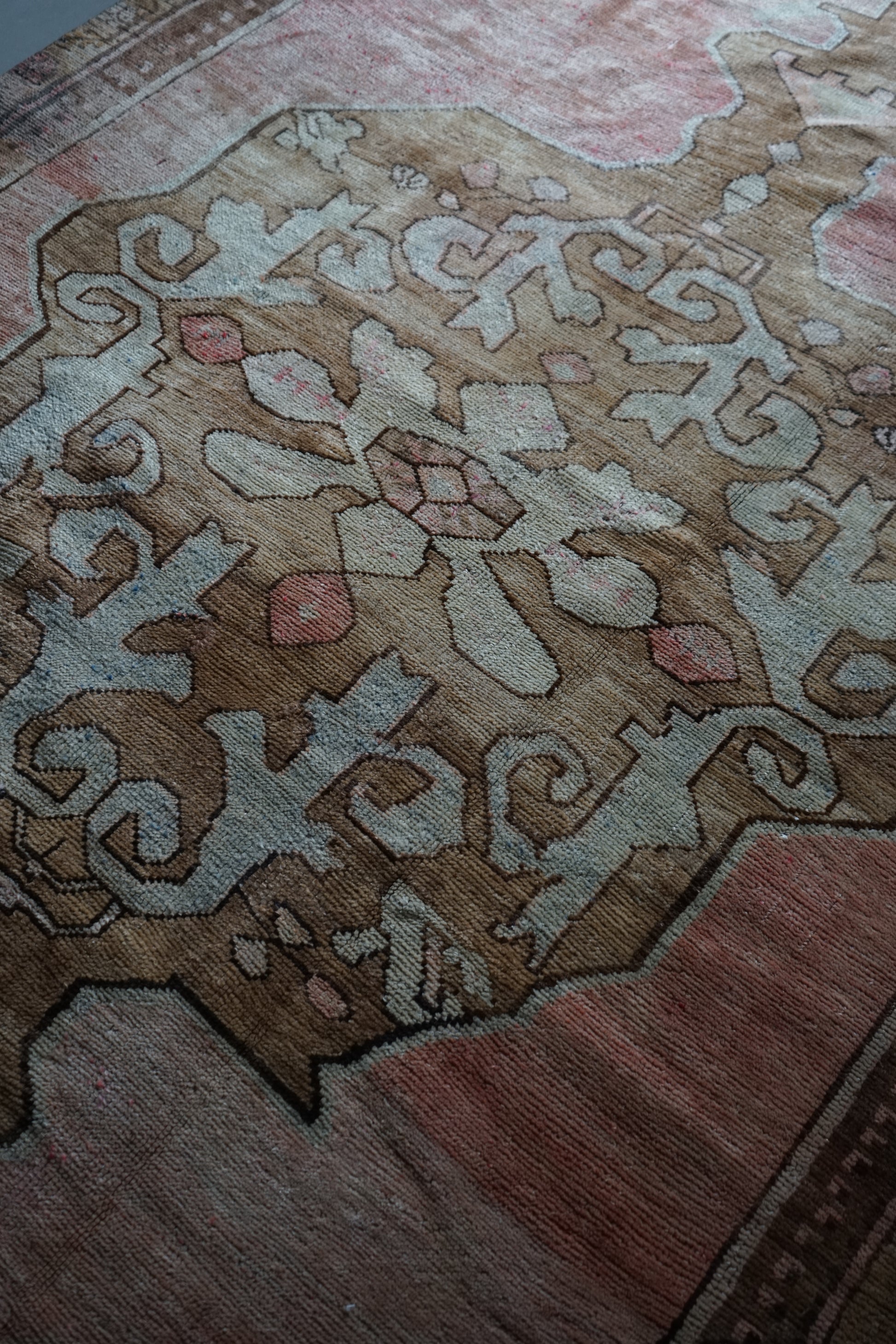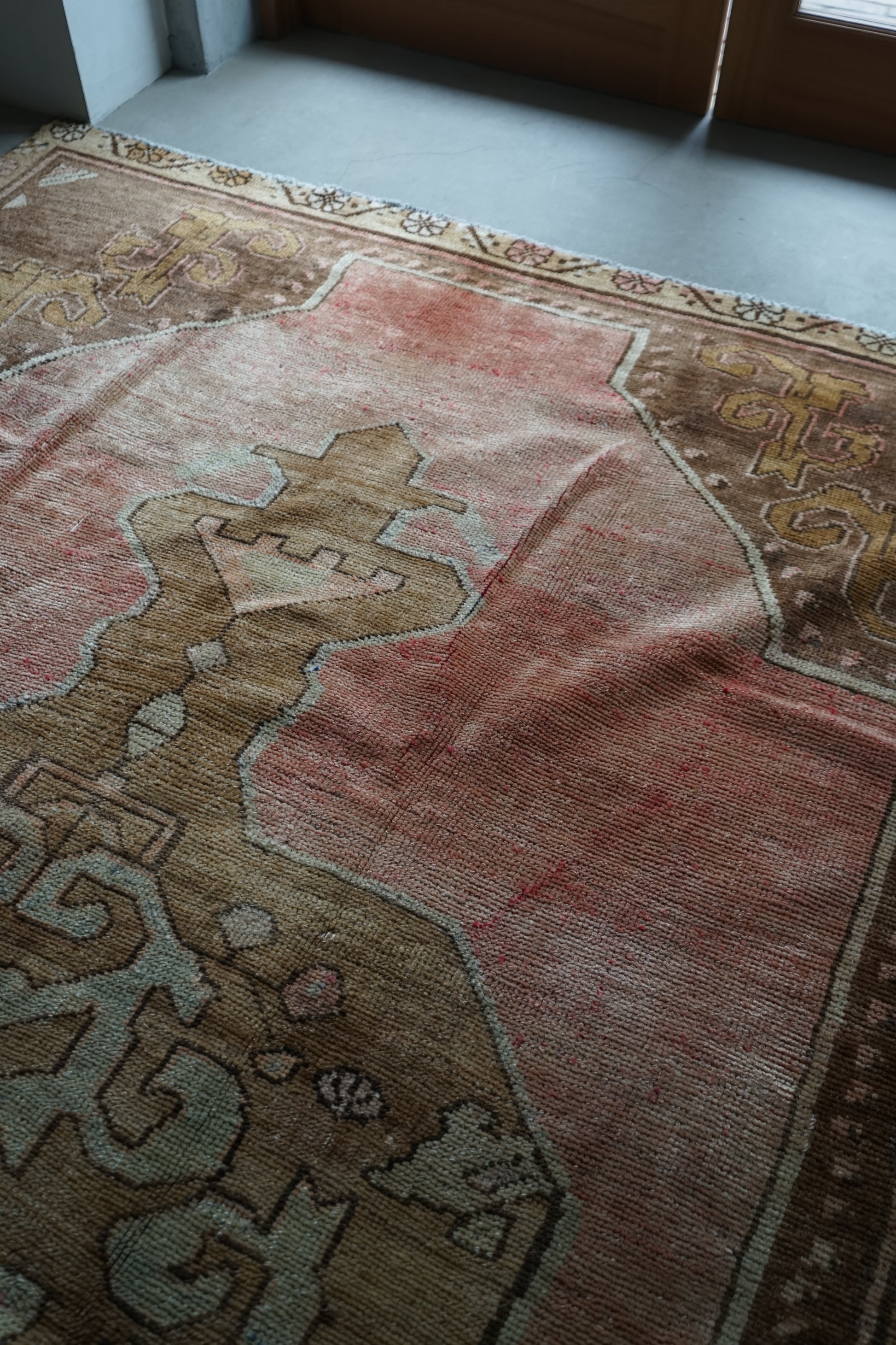 褐色のサーモンピンクが美しいウシャク絨毯。ナチュラルインテリアに万能のコーディネートをみせてくれる一枚です。