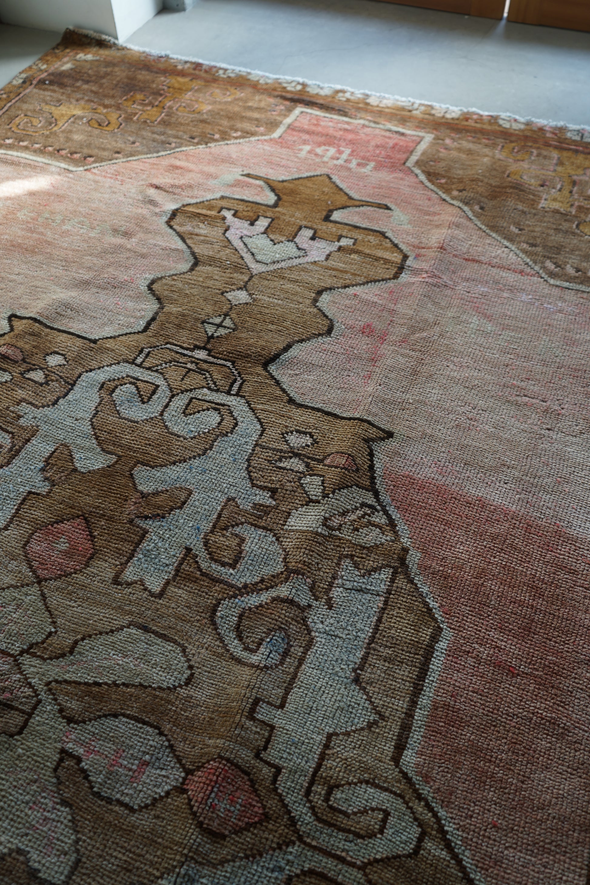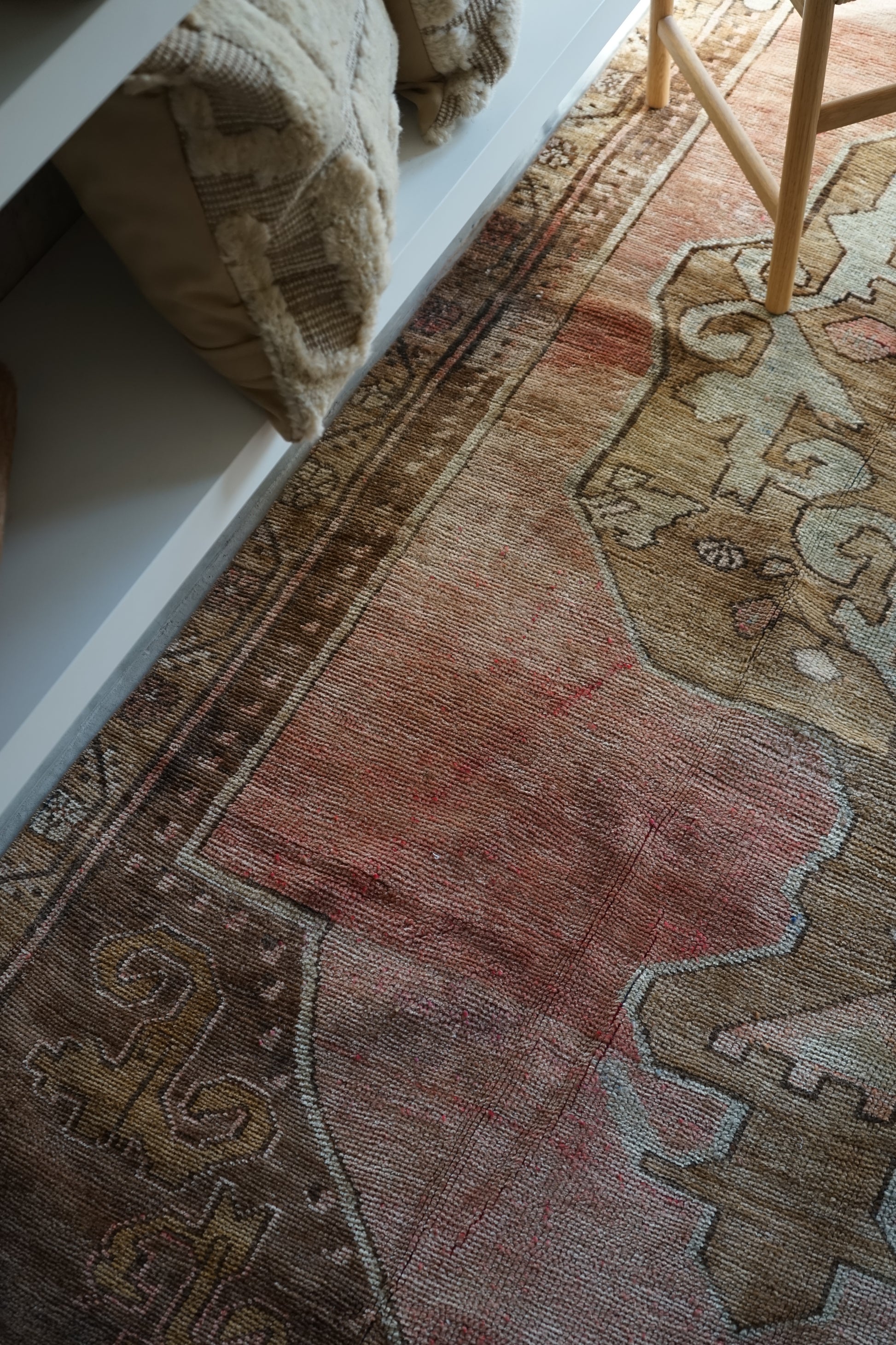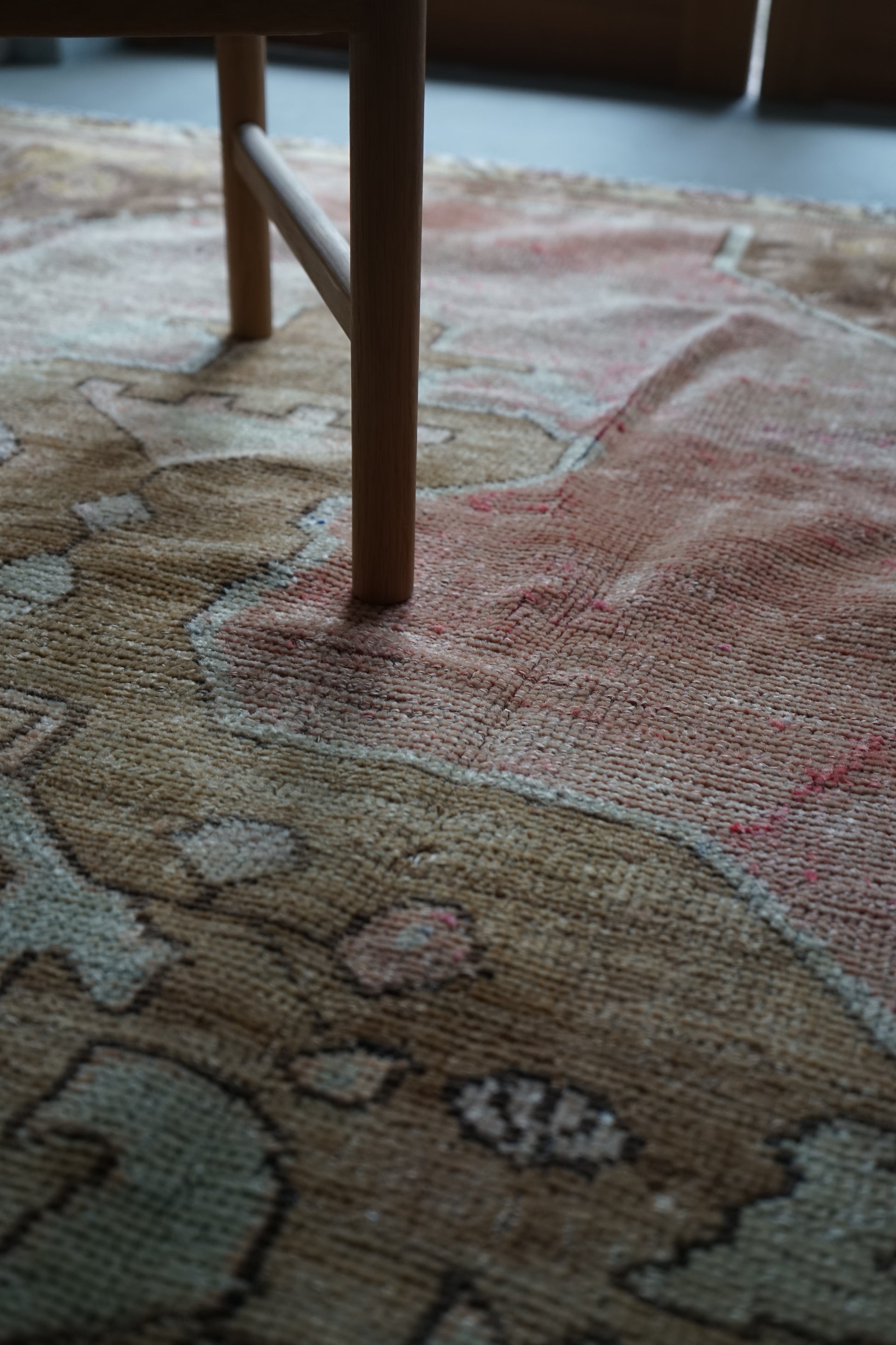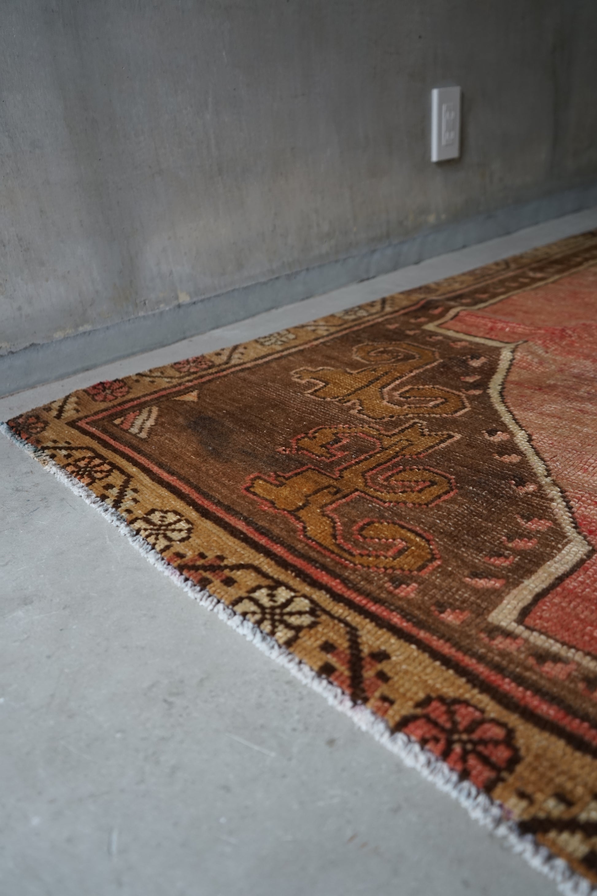 褐色のサーモンピンクが美しいウシャク絨毯。ナチュラルインテリアに万能のコーディネートをみせてくれる一枚です。