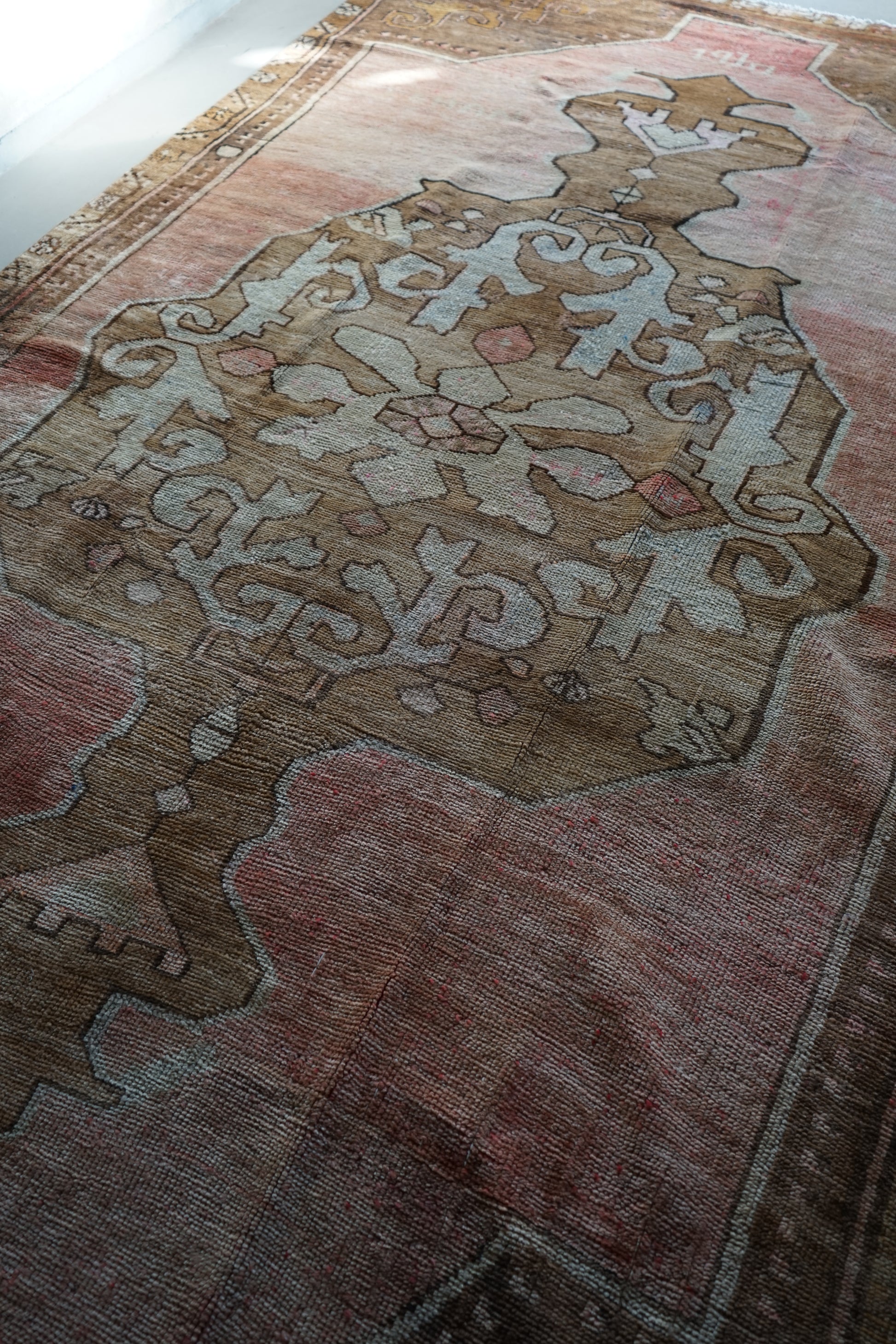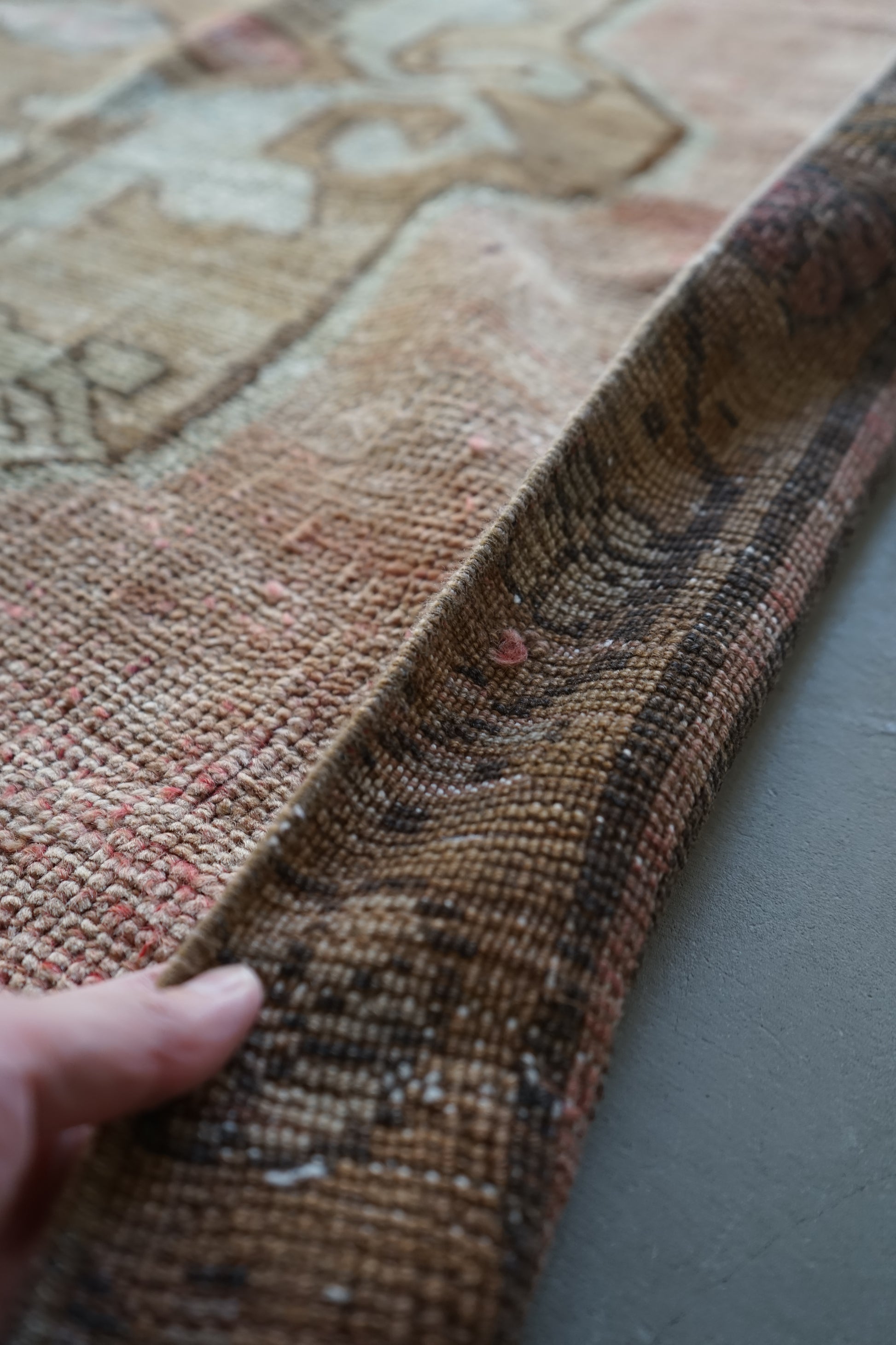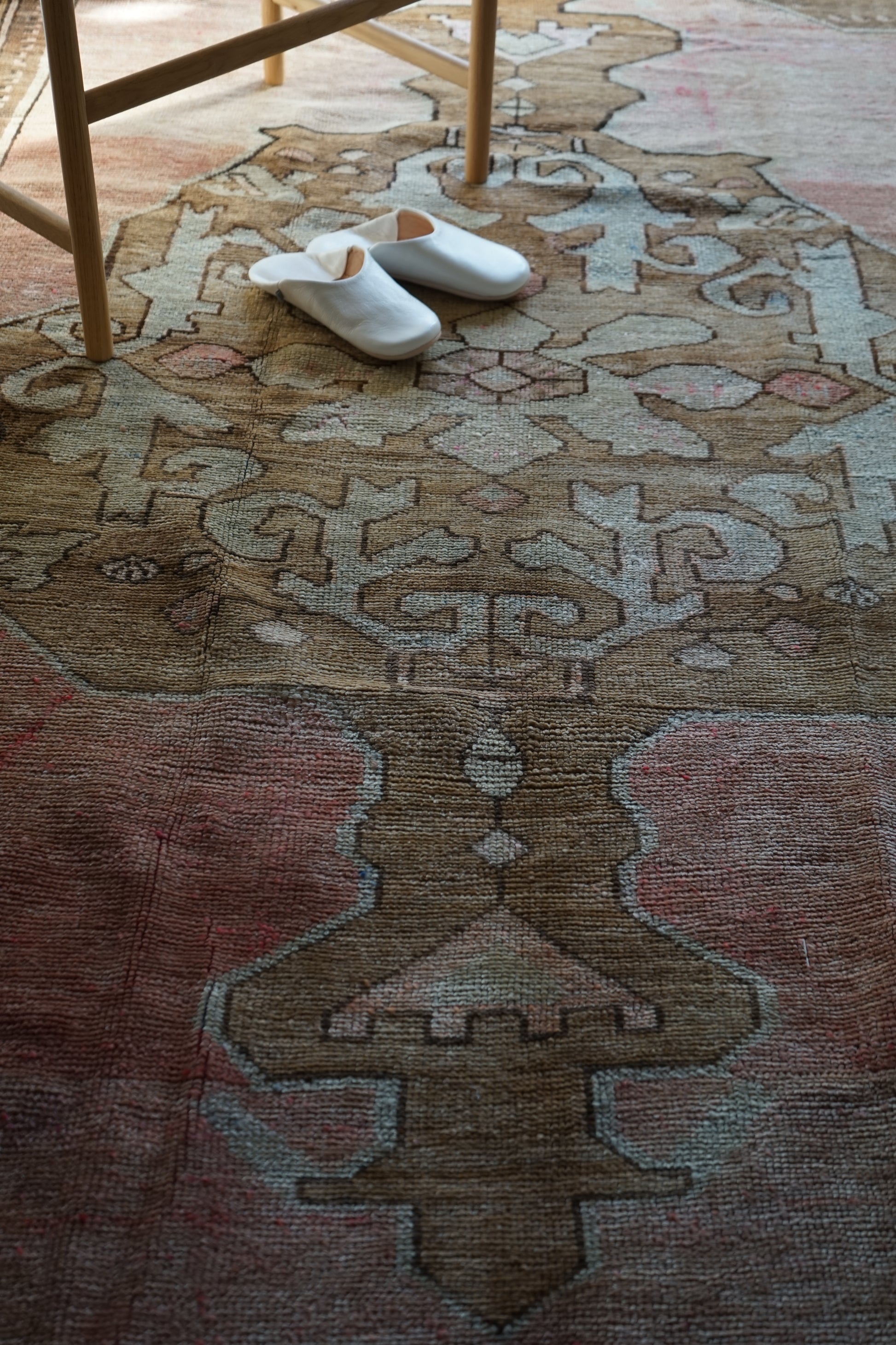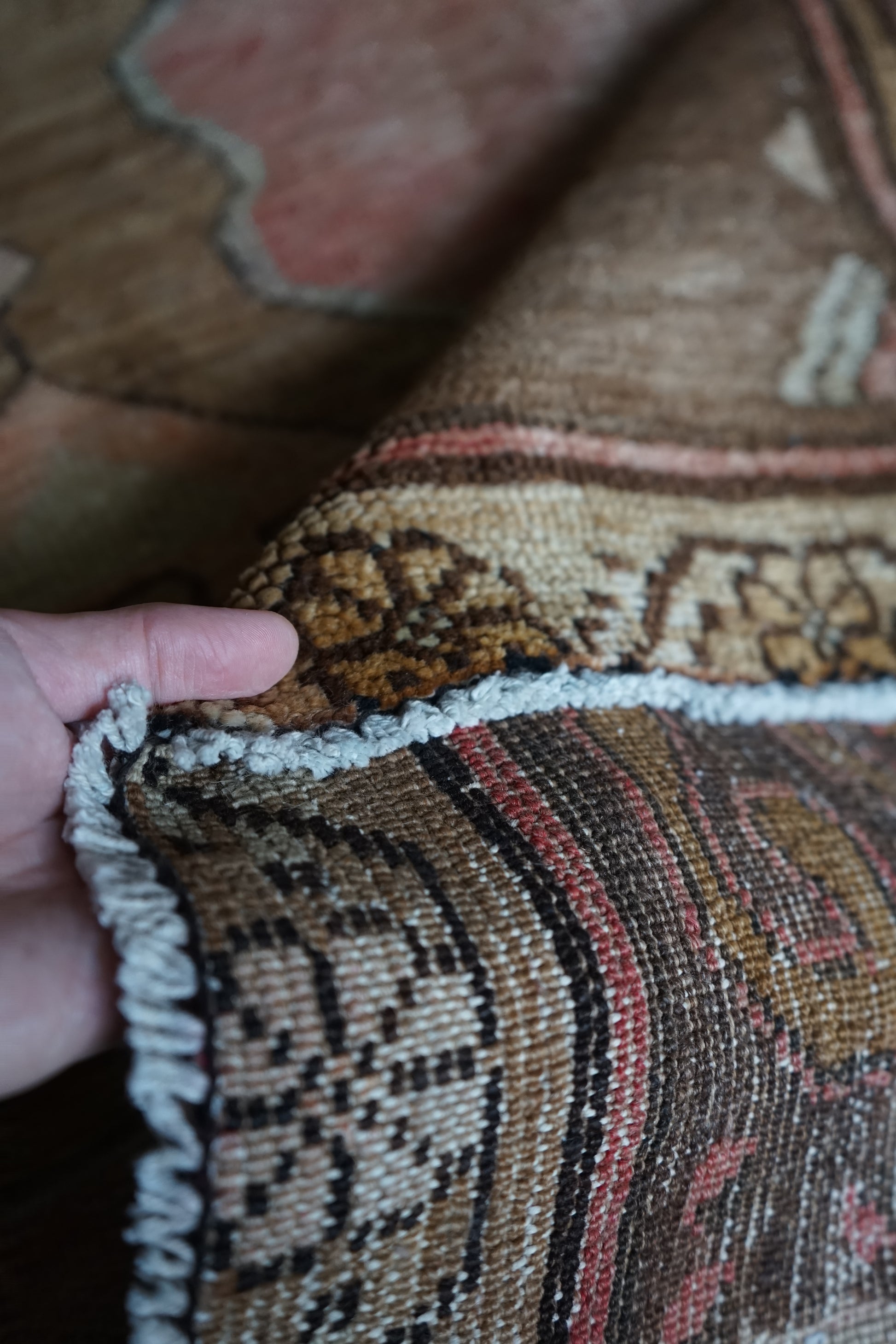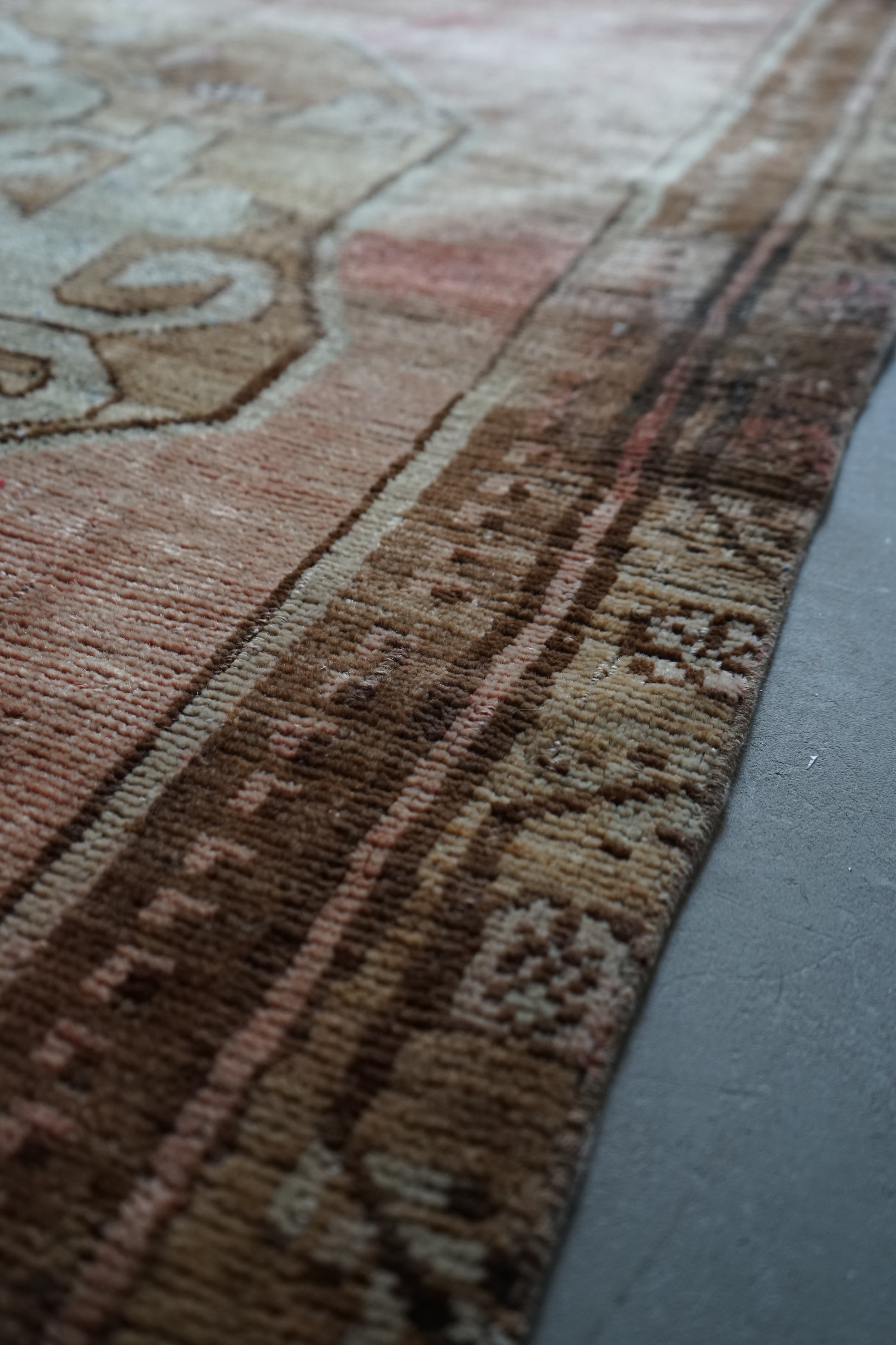 褐色のサーモンピンクが美しいウシャク絨毯。ナチュラルインテリアに万能のコーディネートをみせてくれる一枚です。