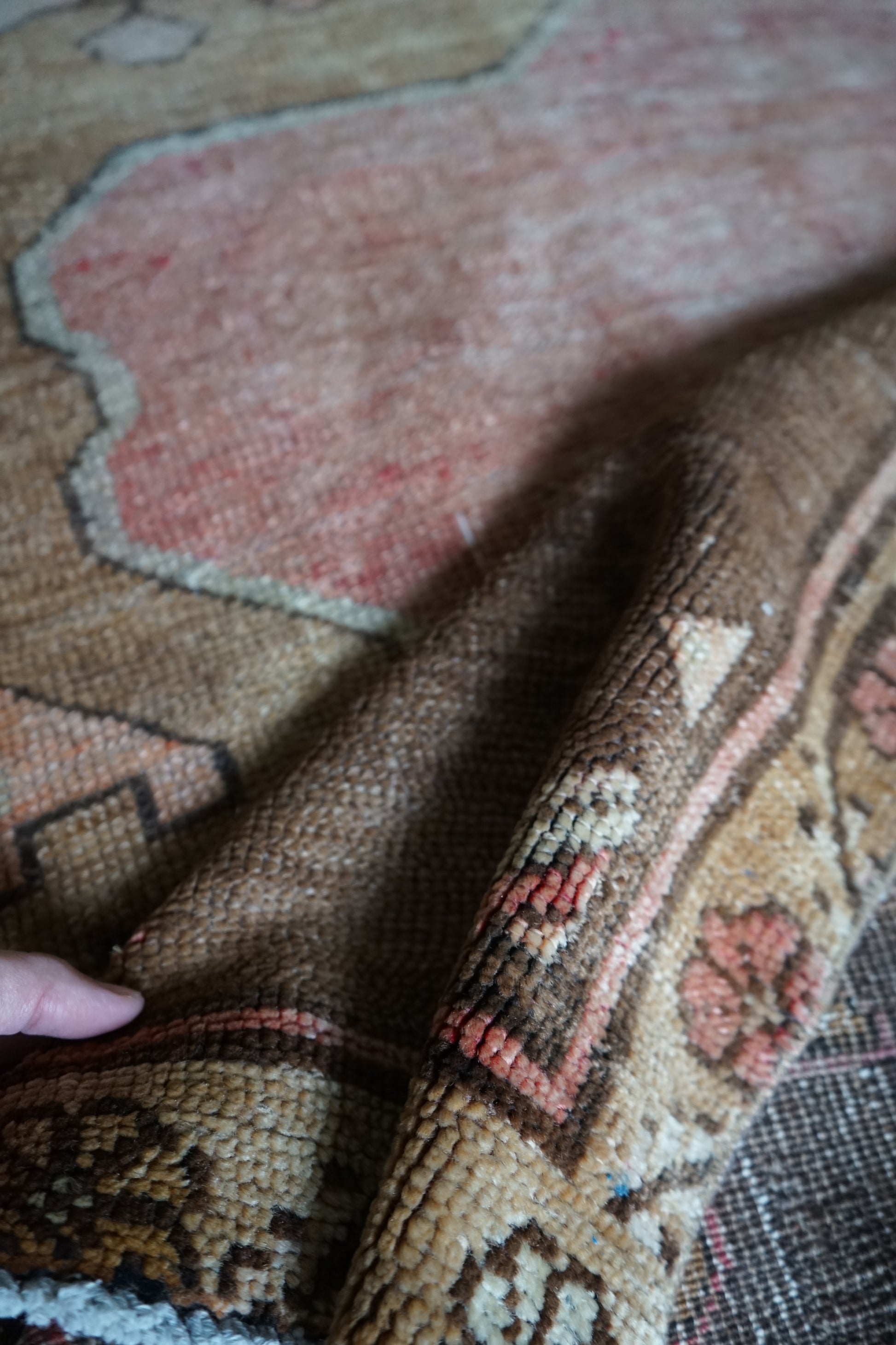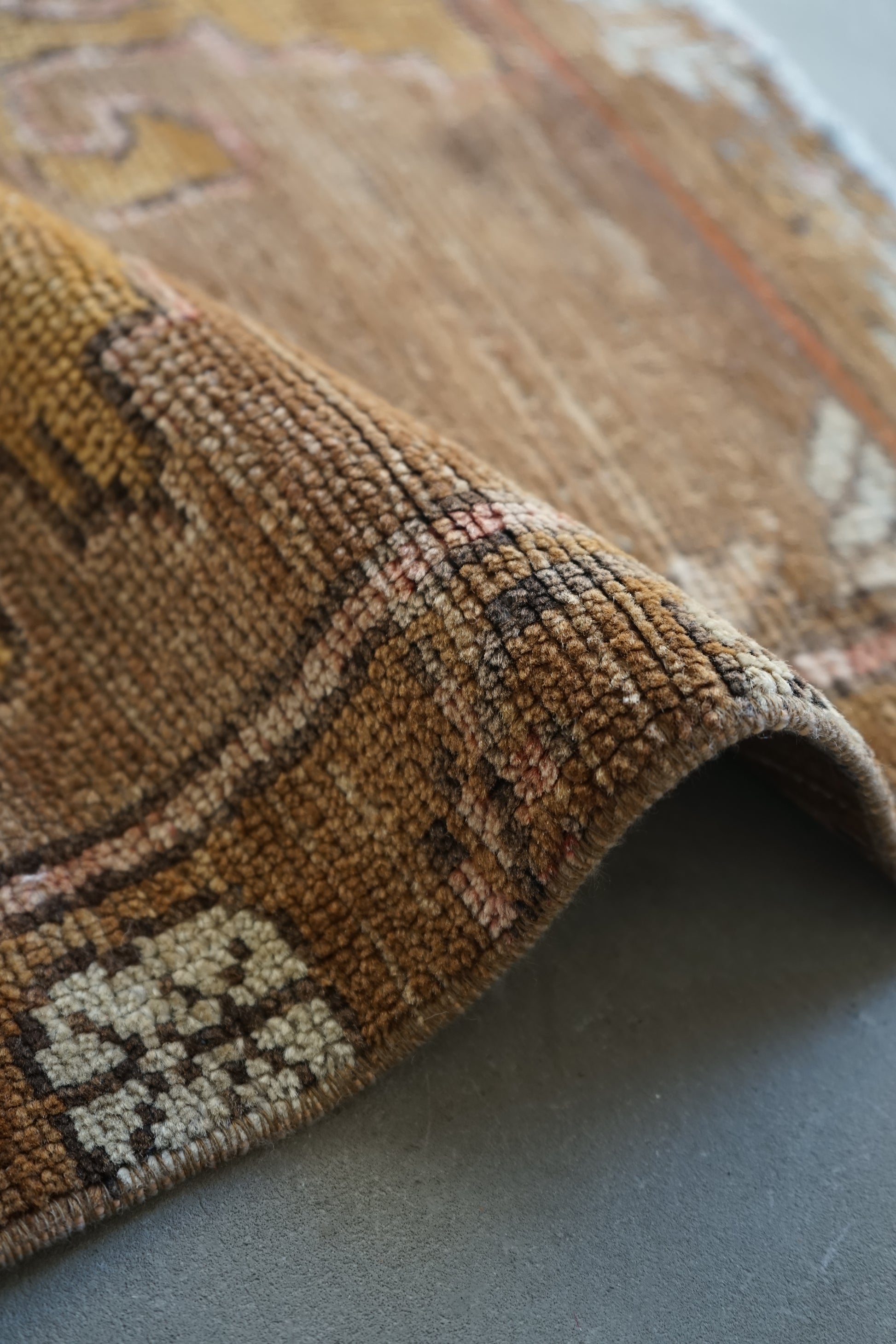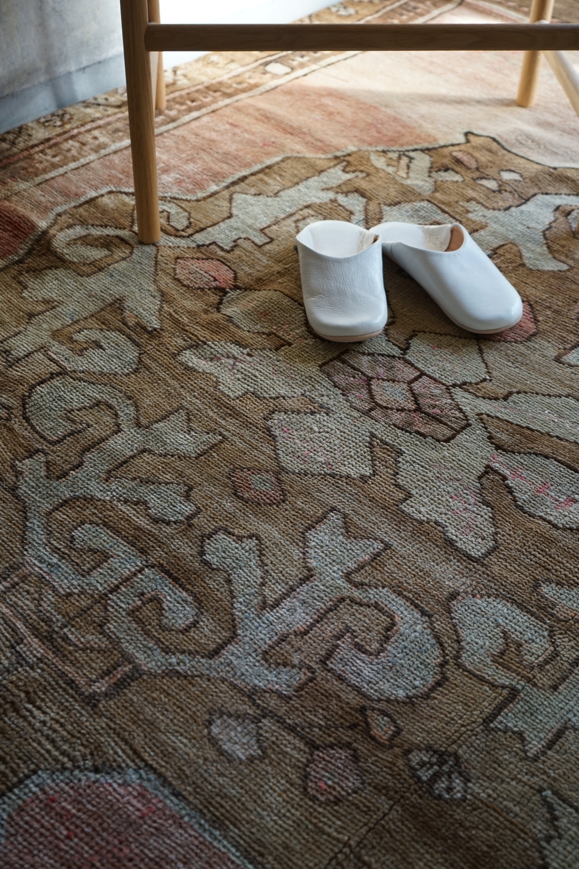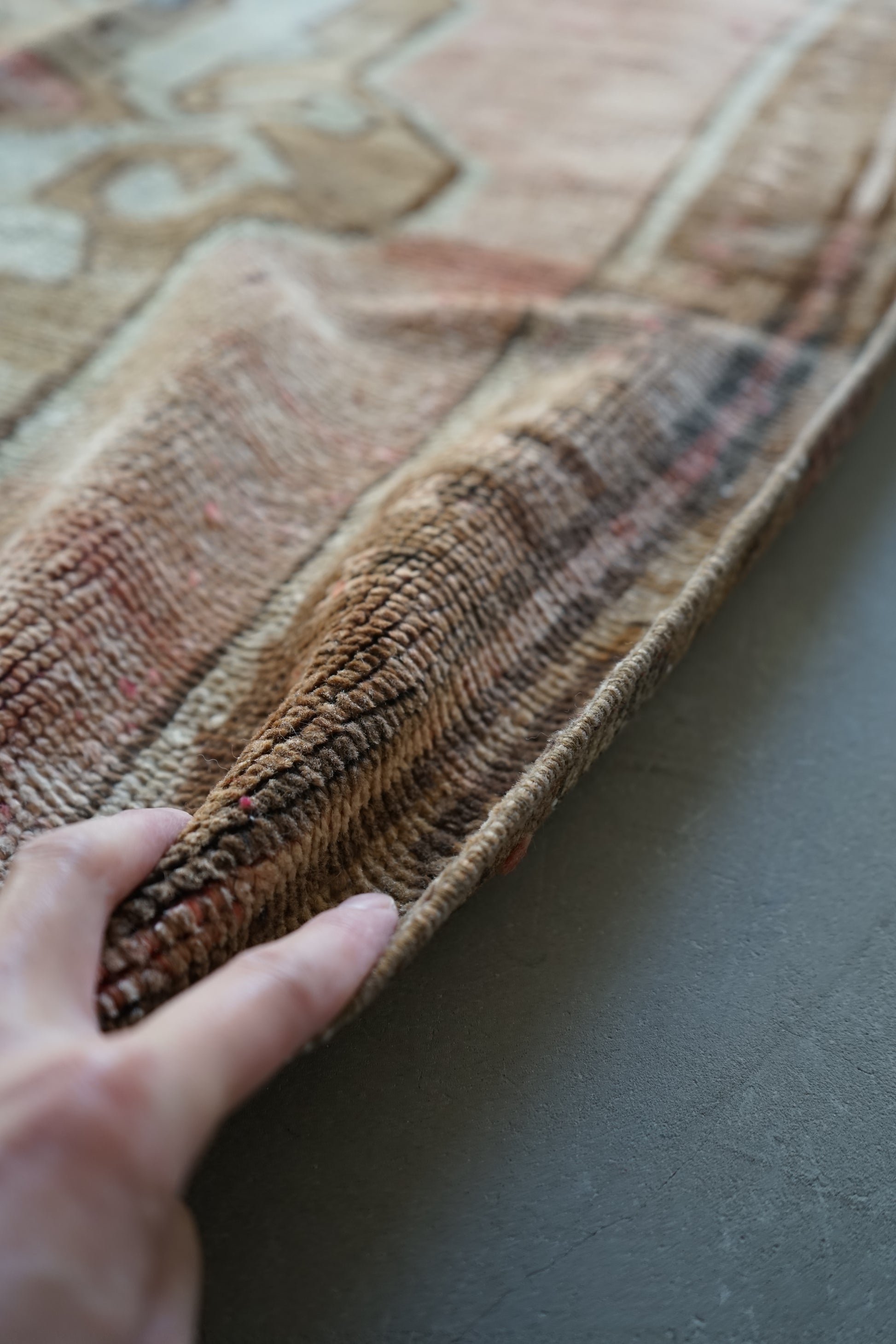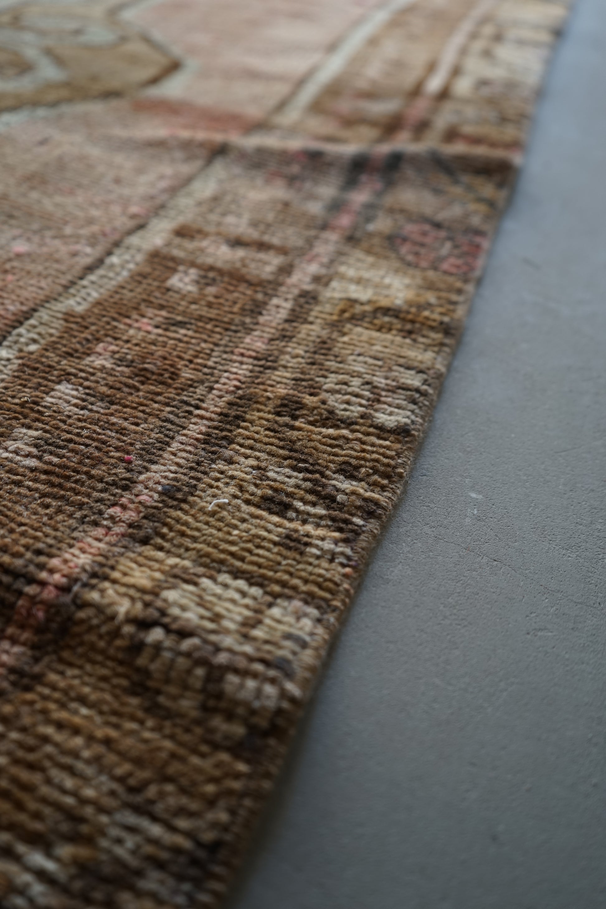 褐色のサーモンピンクが美しいウシャク絨毯。ナチュラルインテリアに万能のコーディネートをみせてくれる一枚です。