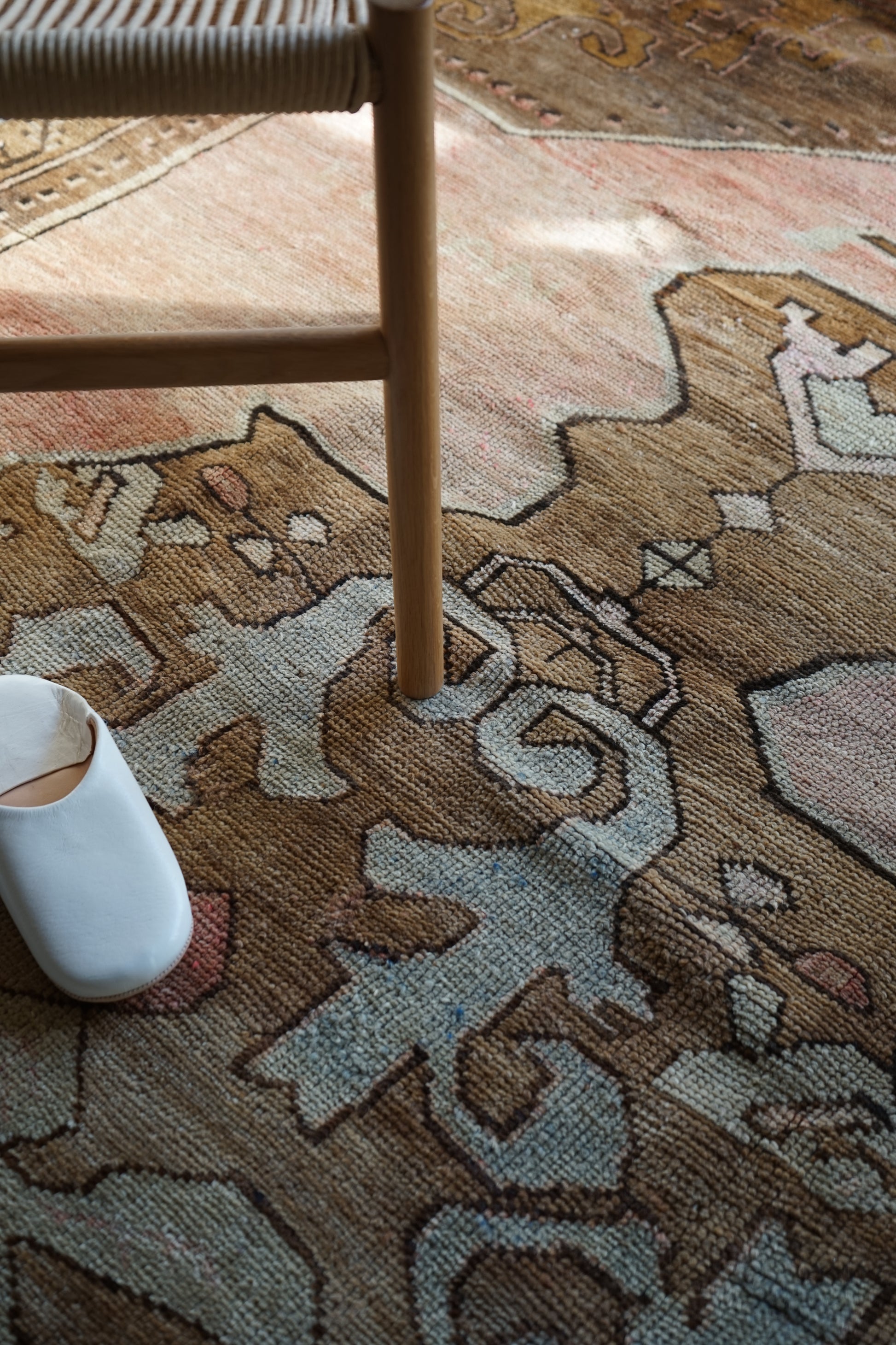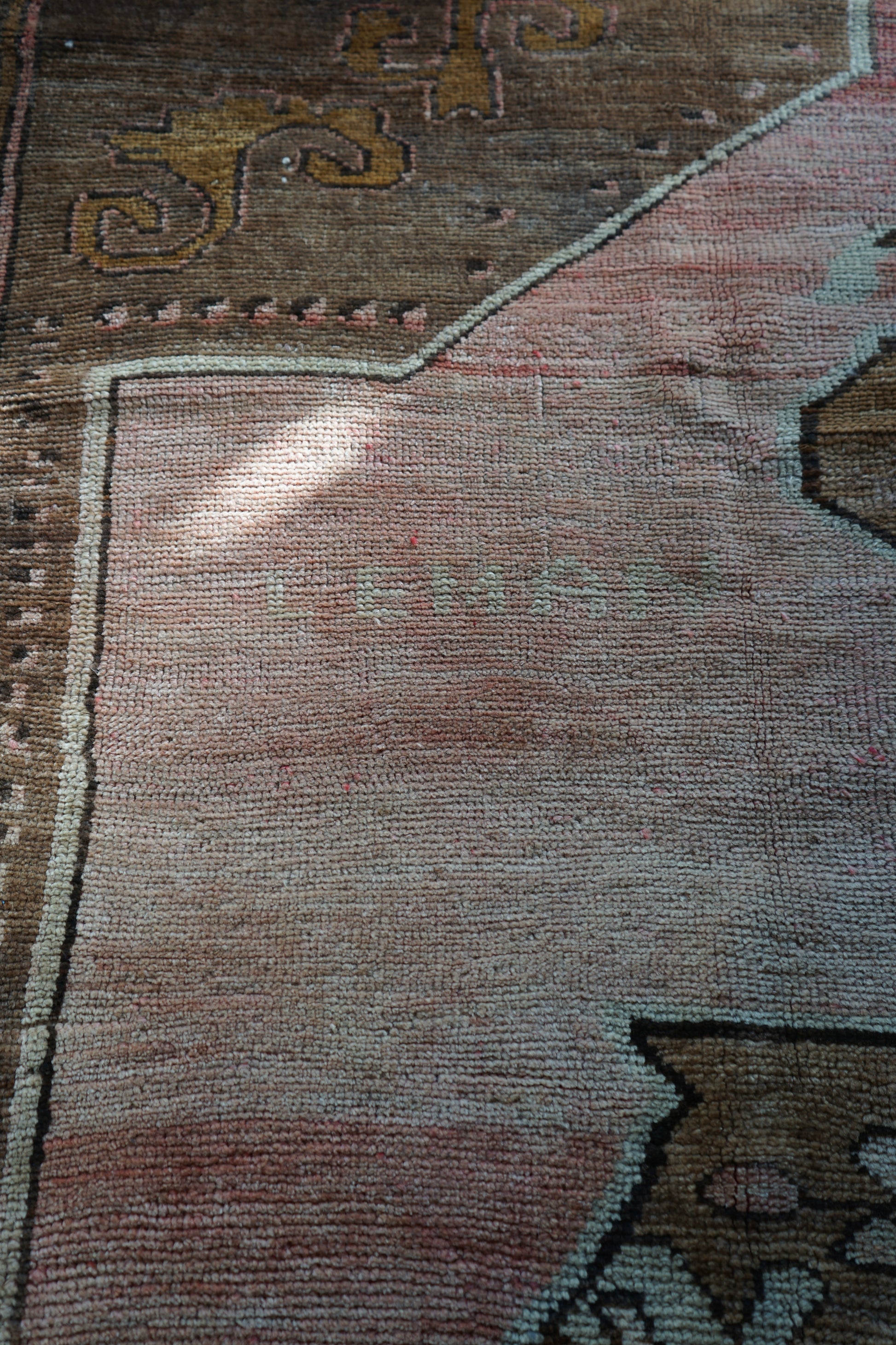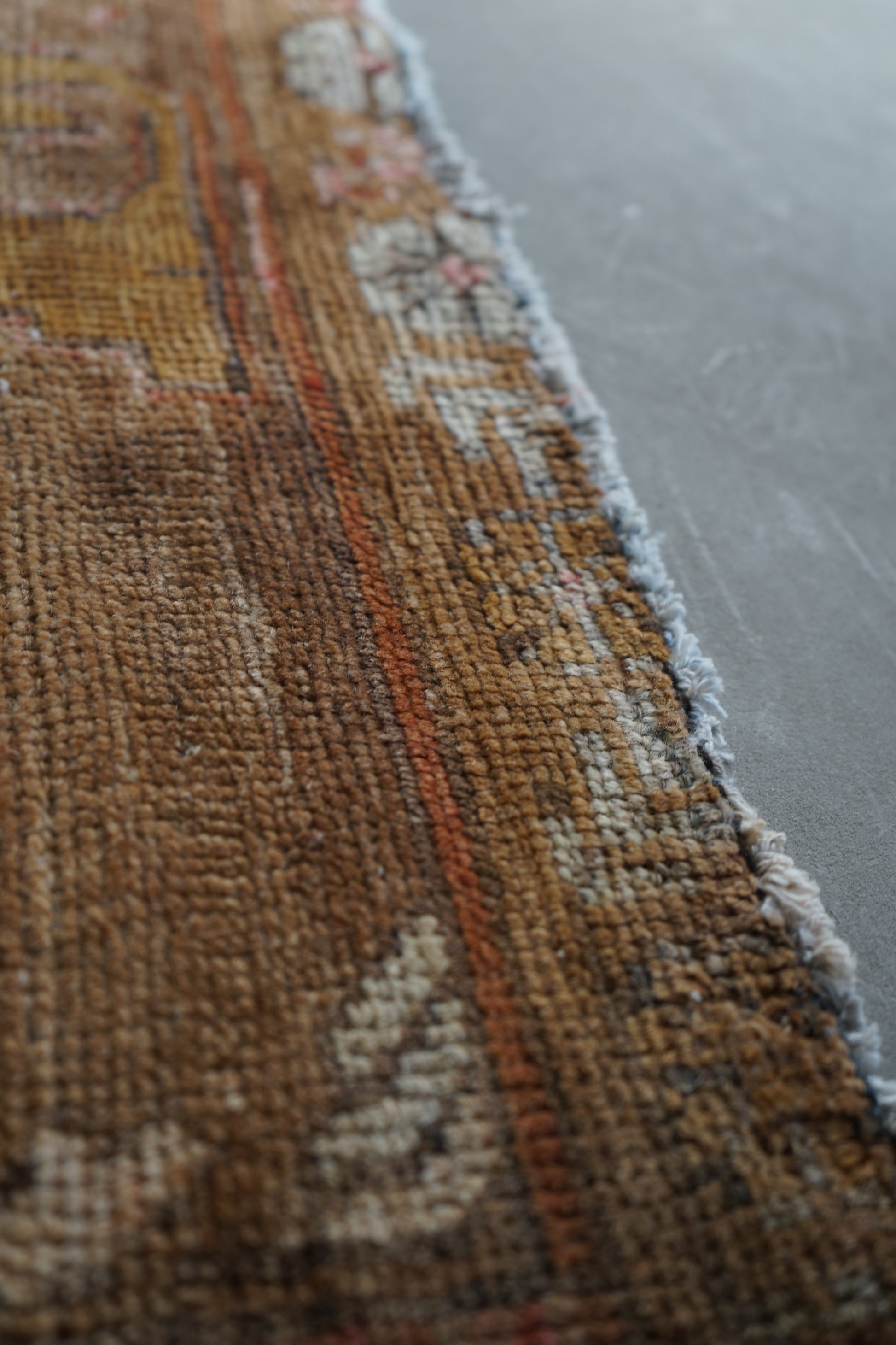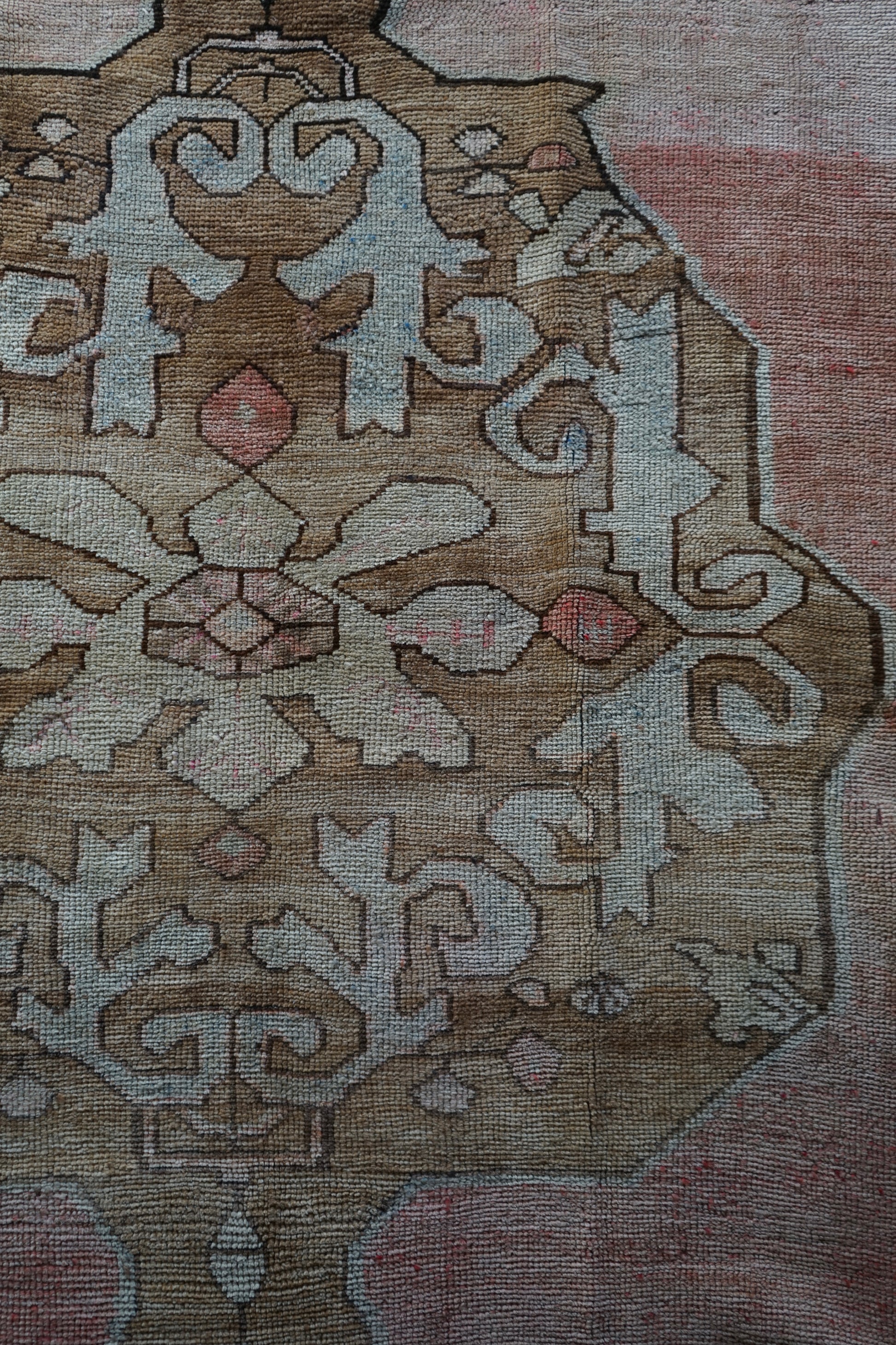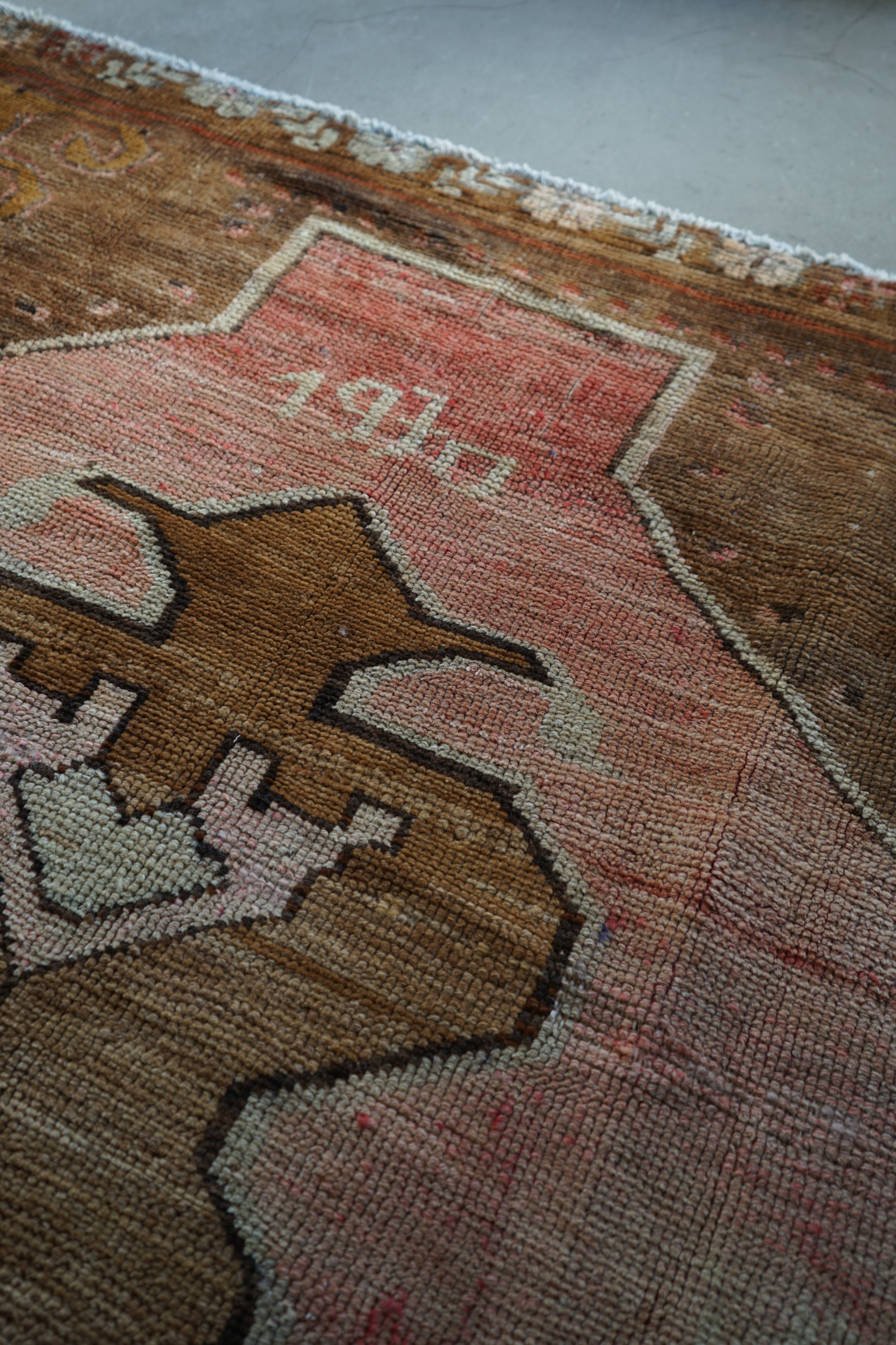 褐色のサーモンピンクが美しいウシャク絨毯。ナチュラルインテリアに万能のコーディネートをみせてくれる一枚です。