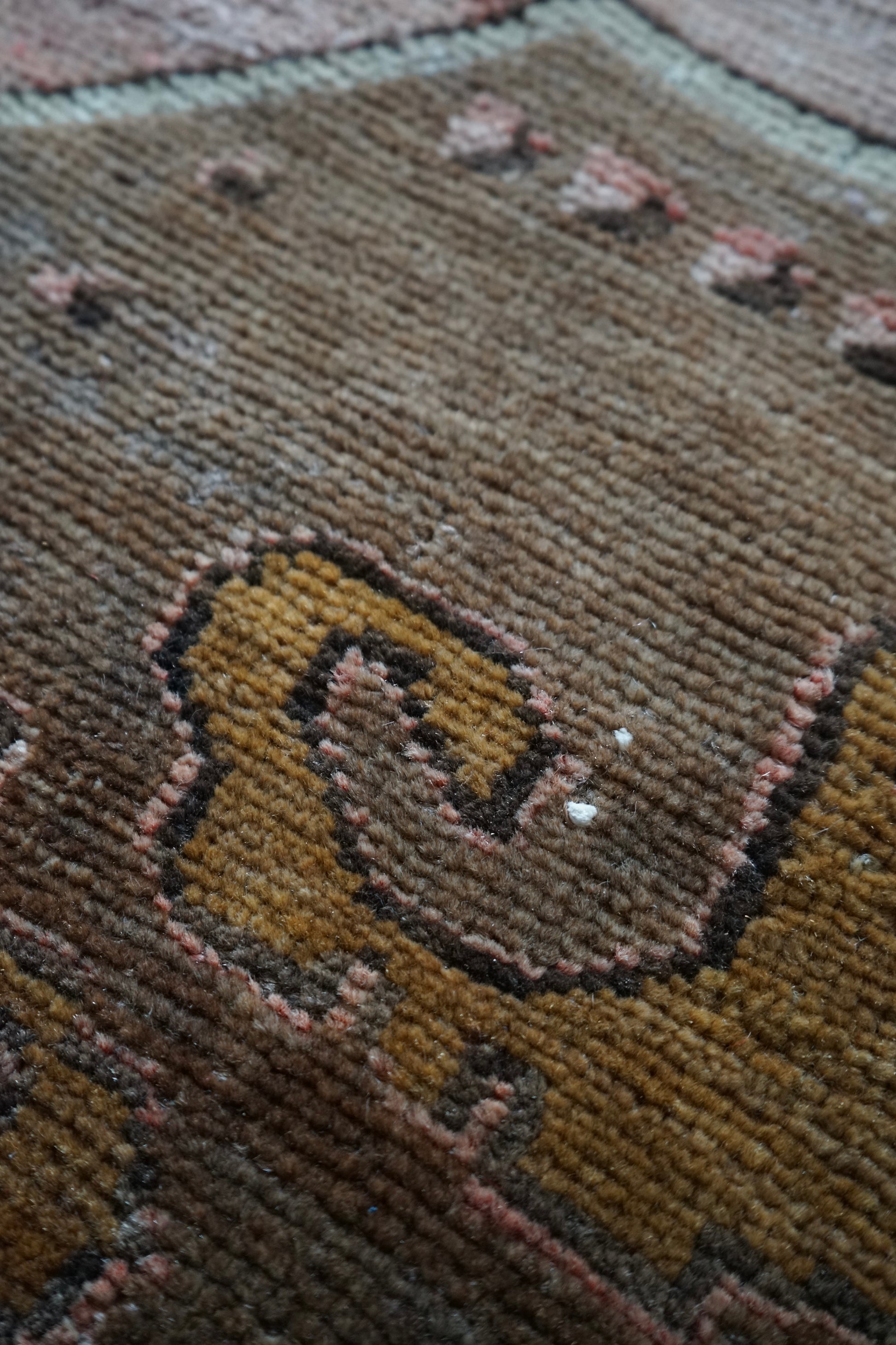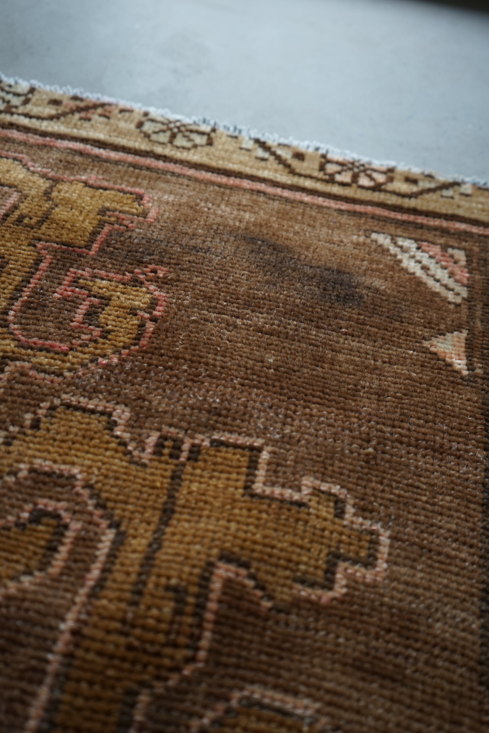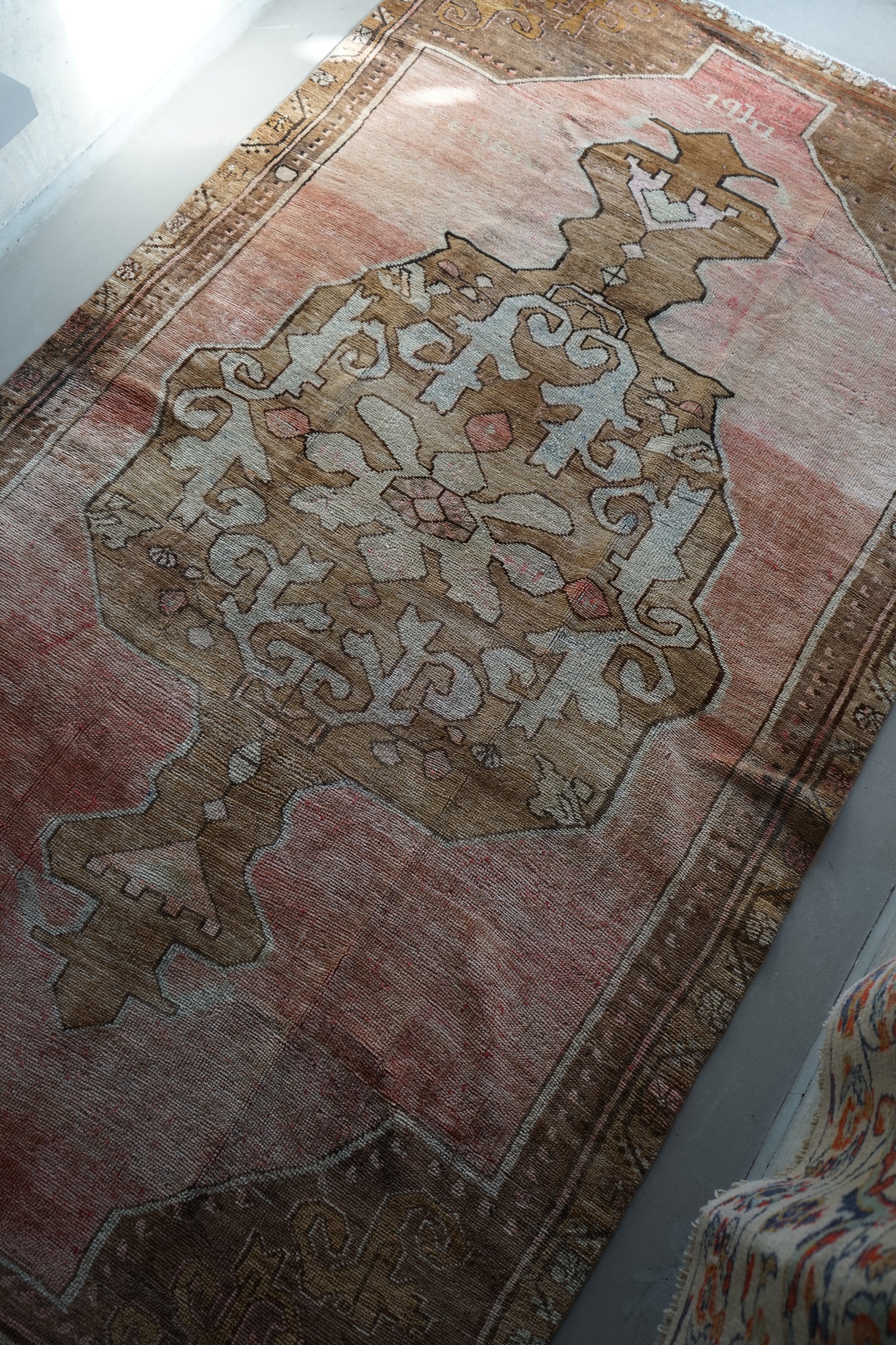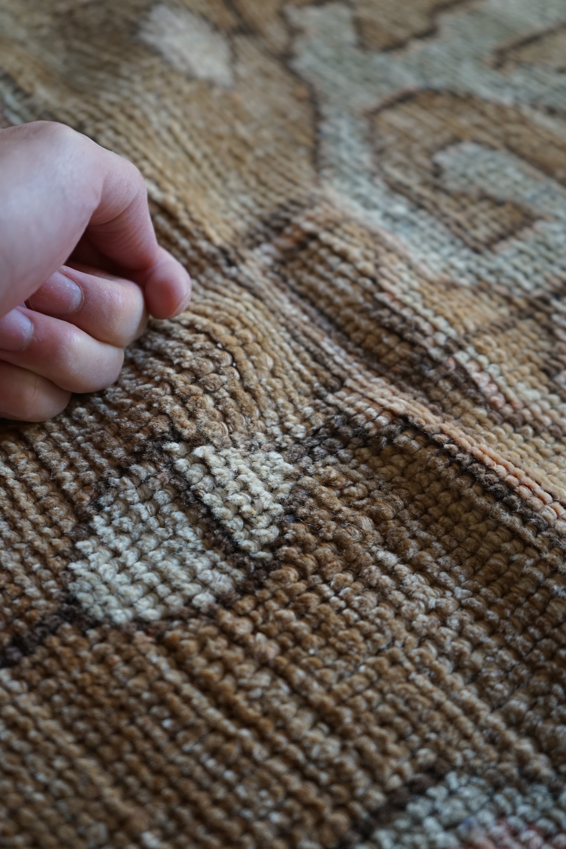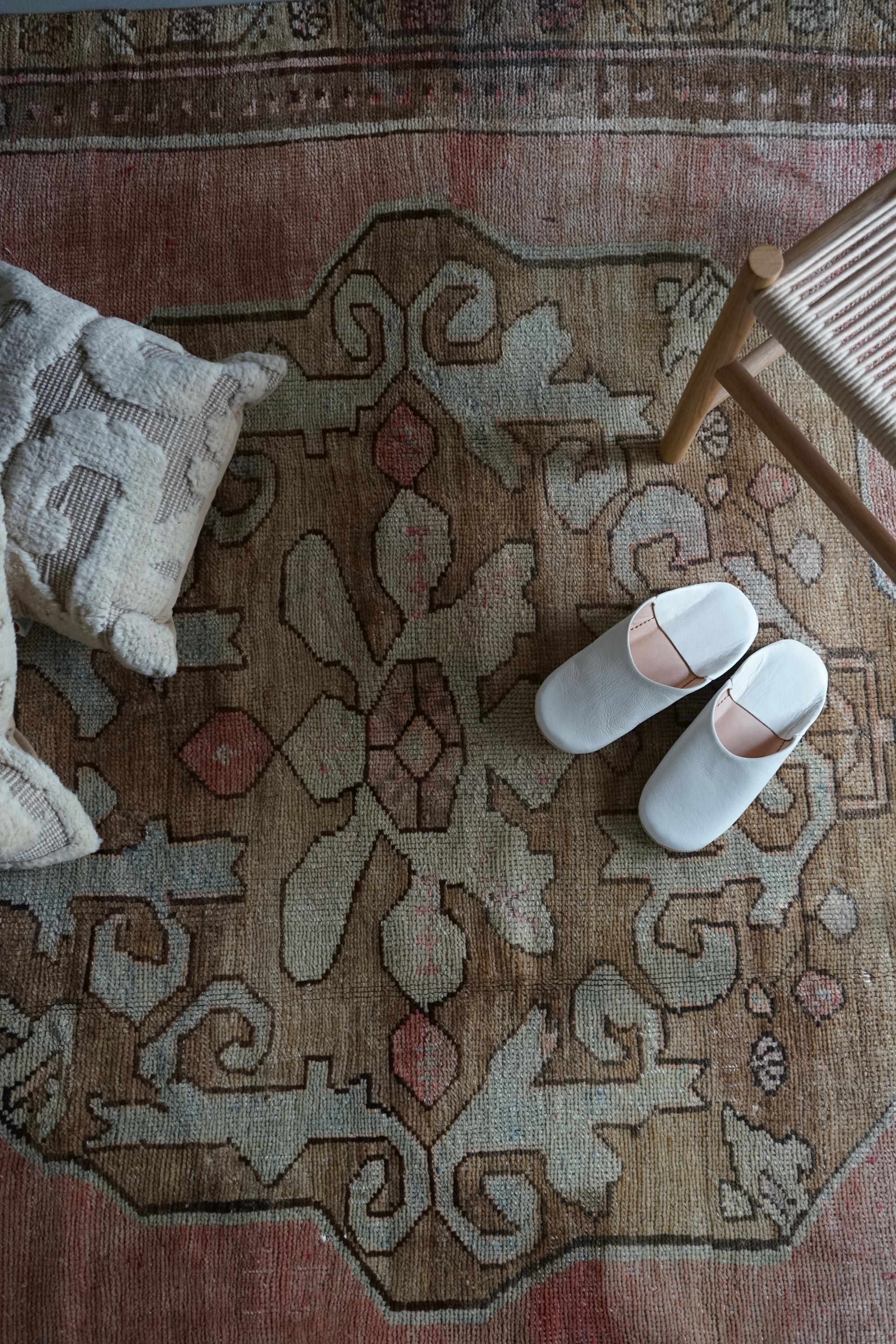褐色のサーモンピンクが美しいウシャク絨毯。ナチュラルインテリアに万能のコーディネートをみせてくれる一枚です。