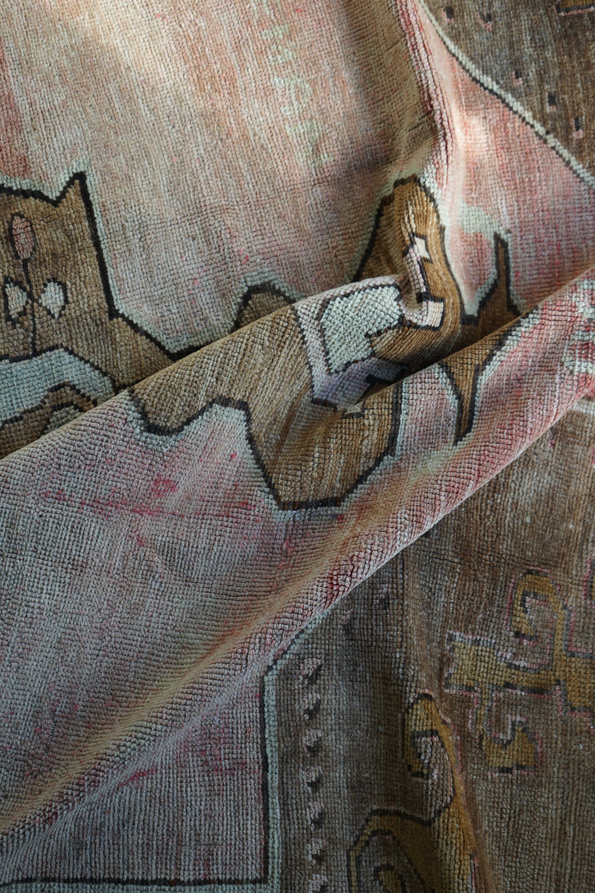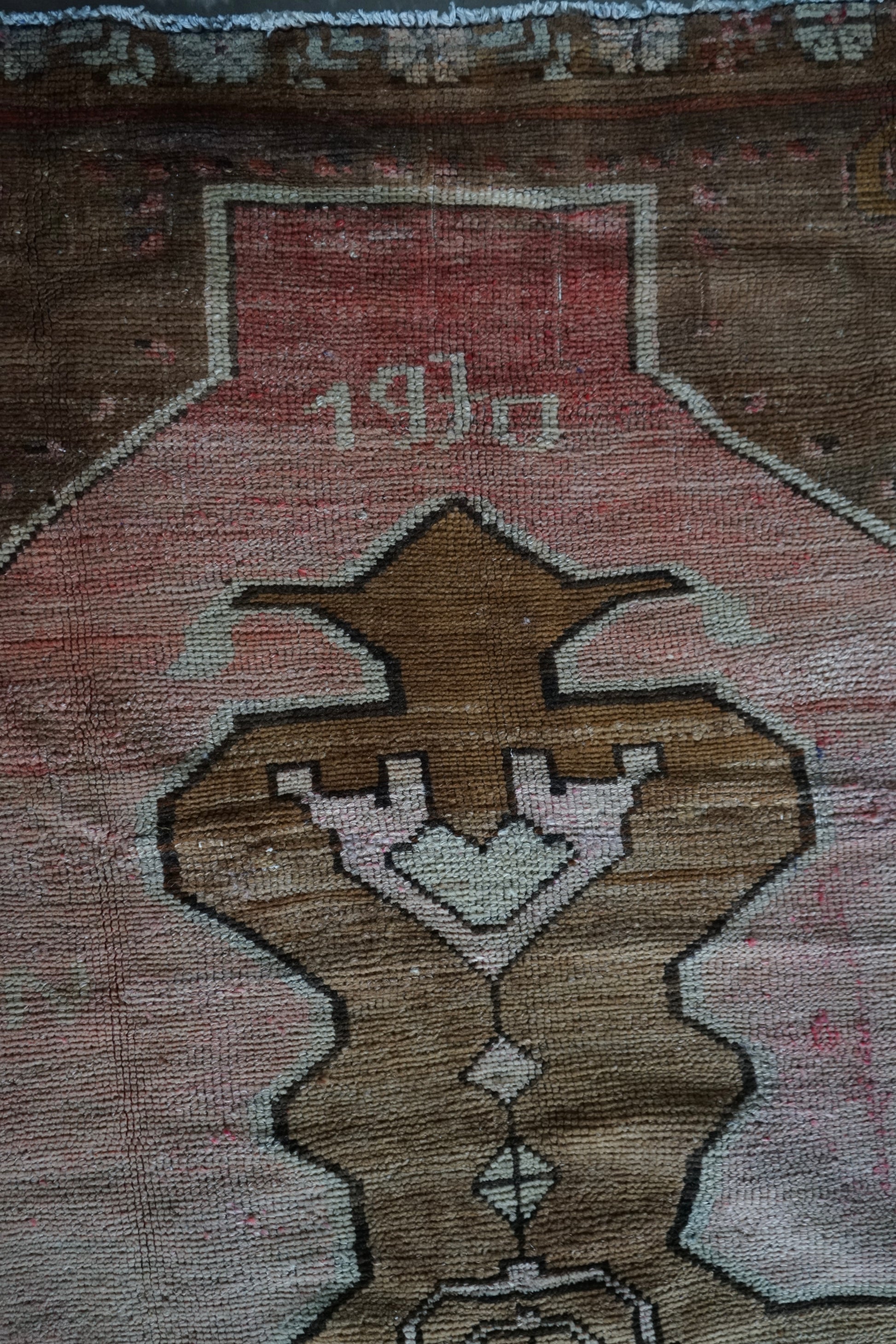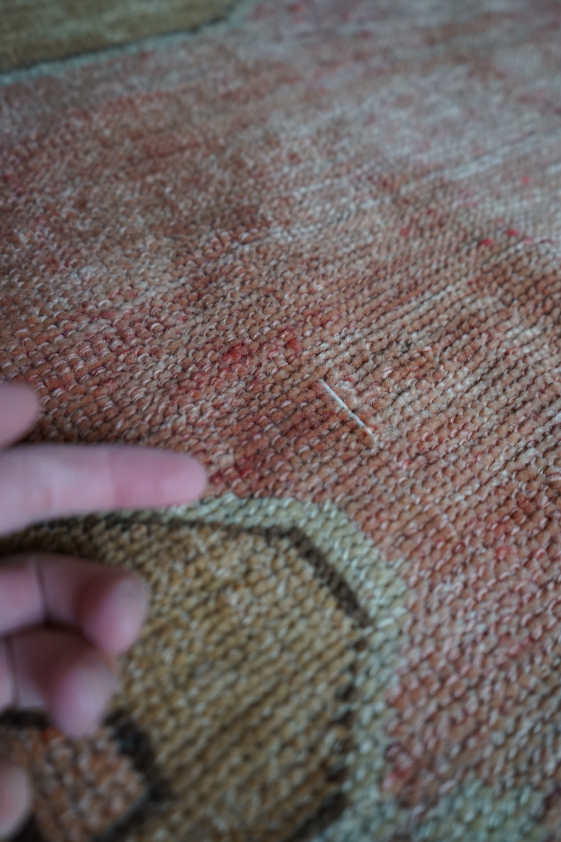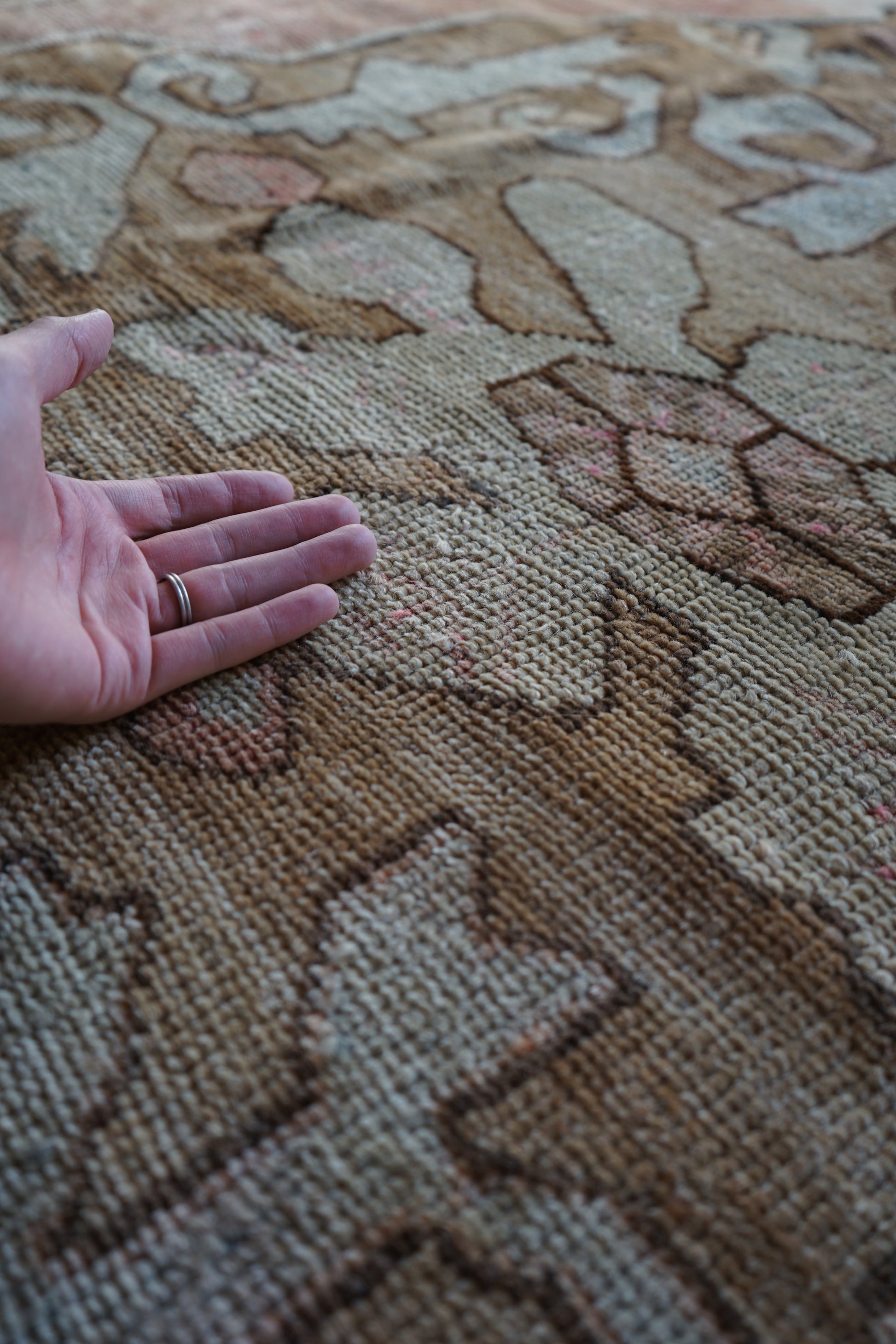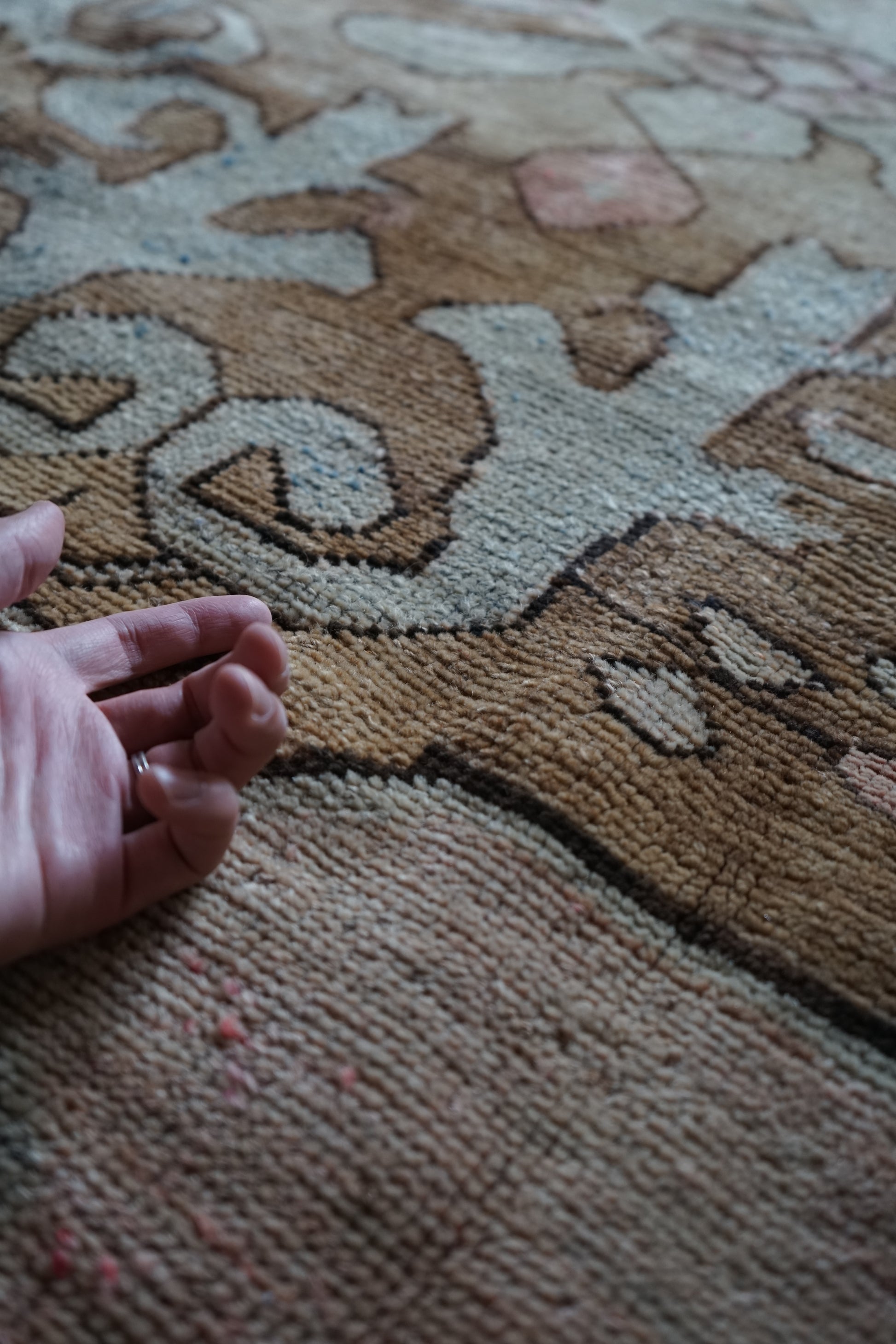 褐色のサーモンピンクが美しいウシャク絨毯。ナチュラルインテリアに万能のコーディネートをみせてくれる一枚です。