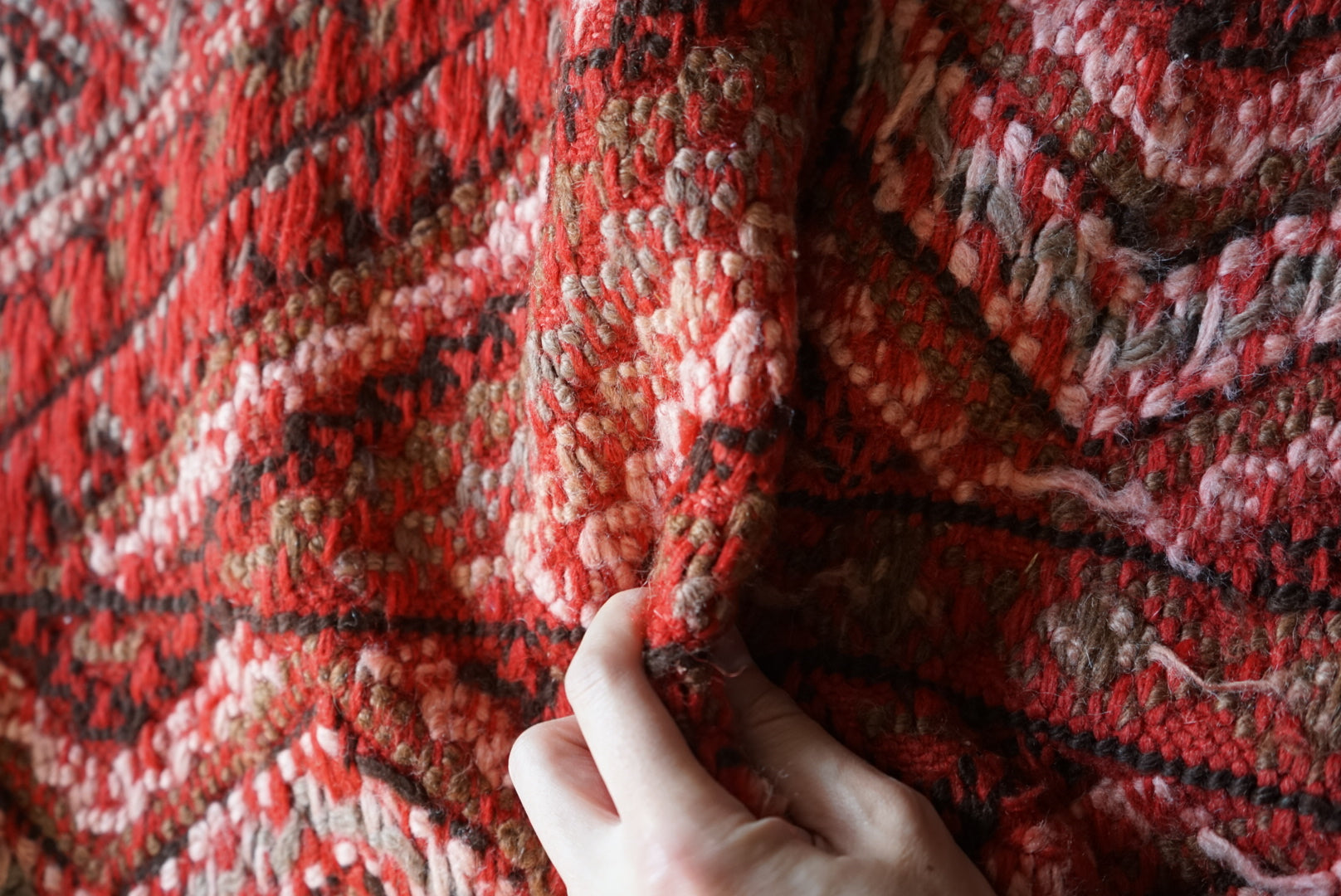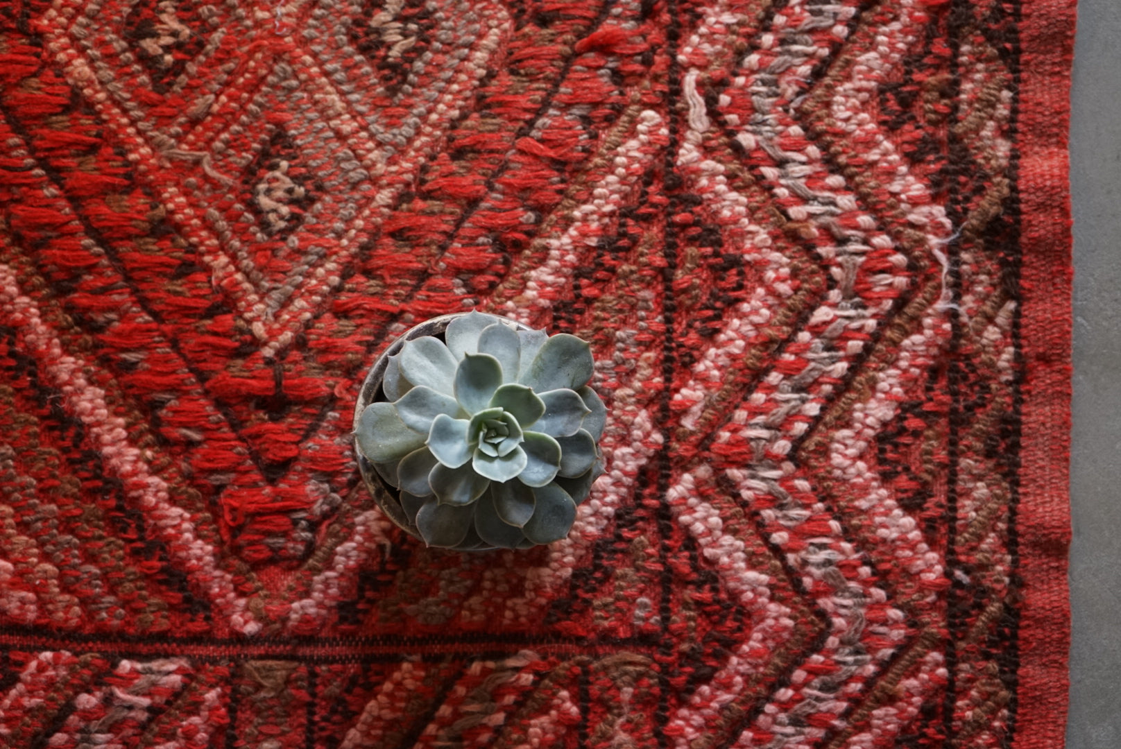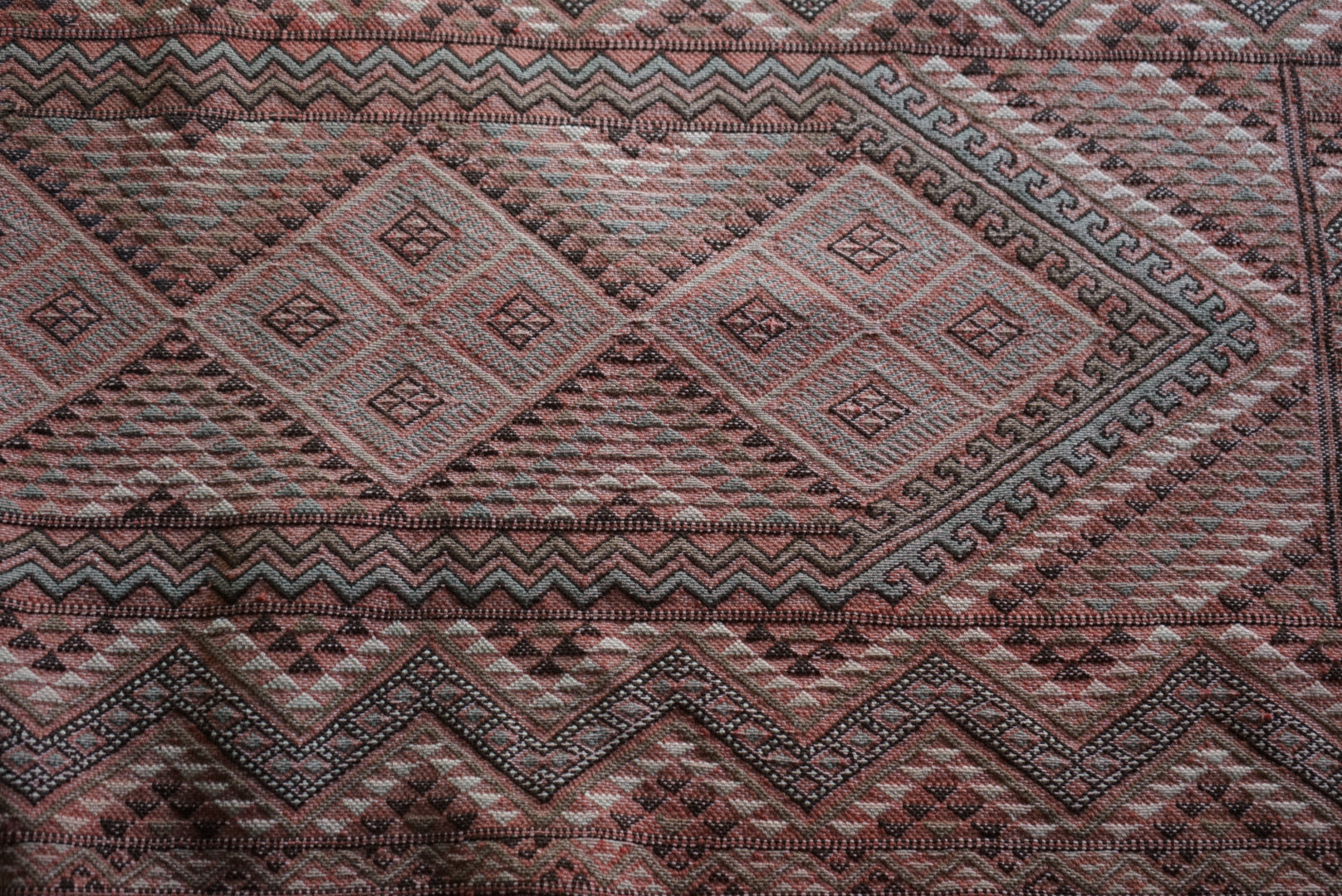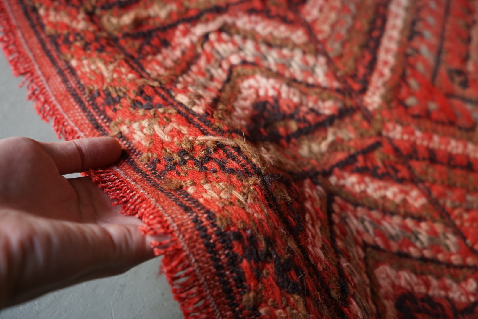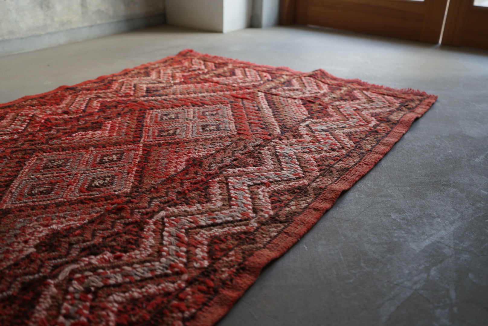 褐色のレッドが綺麗なトルコキリム。一見真っ赤なデザインですが、意匠にブラウンやモスグリーン色が織り込まれていて非常に穏やかな表情をしています。