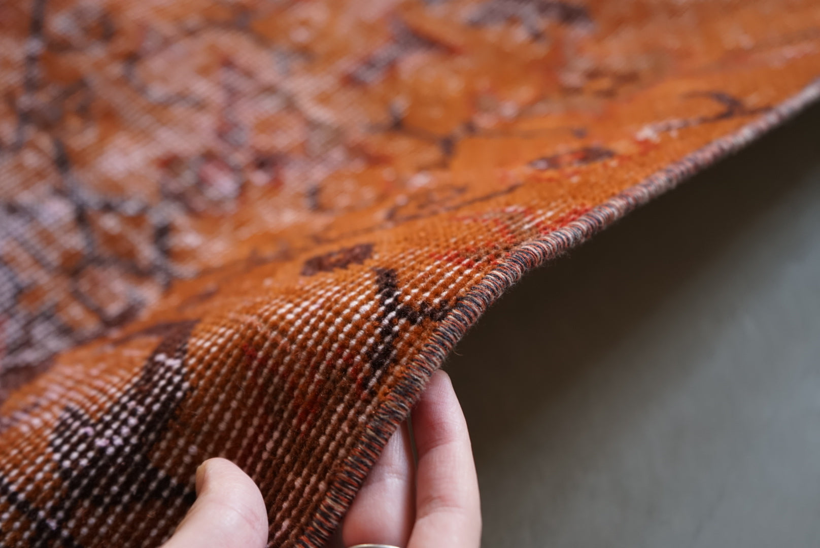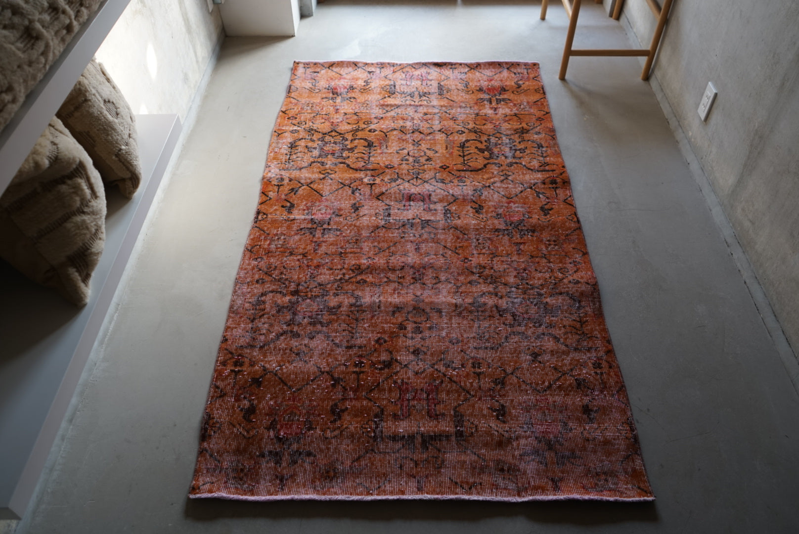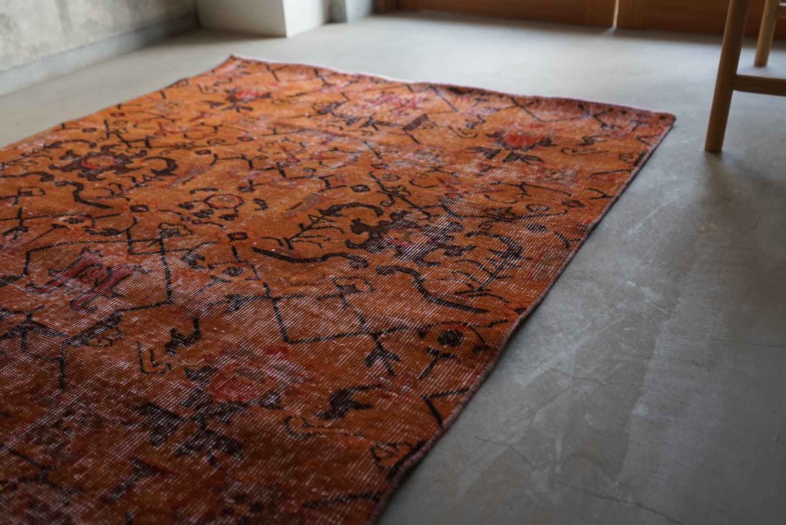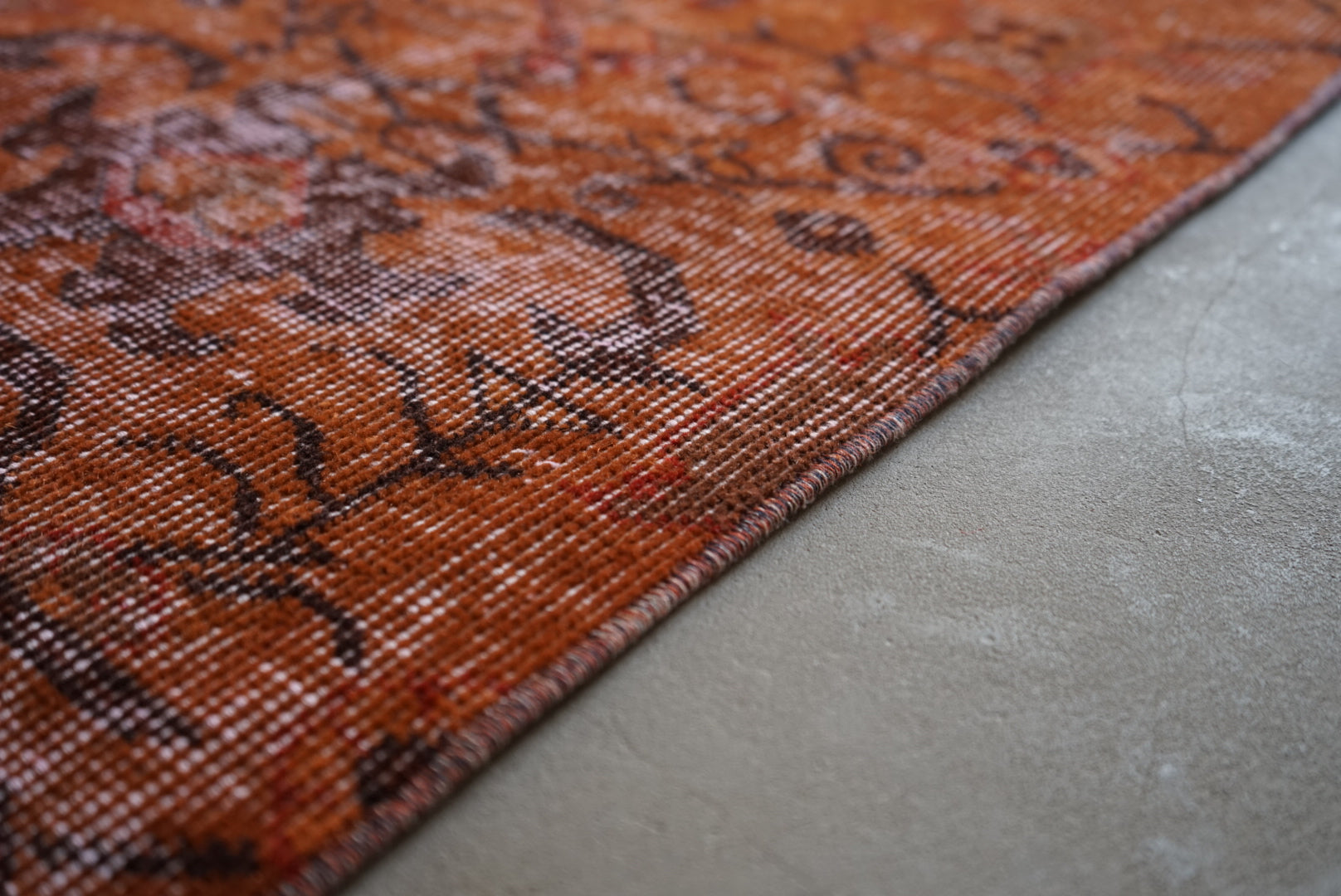 深みのあるオレンジのオーバーダイラグです。お部屋に広がると大ぶりな草花模様が空間を大胆に彩ってくれます。