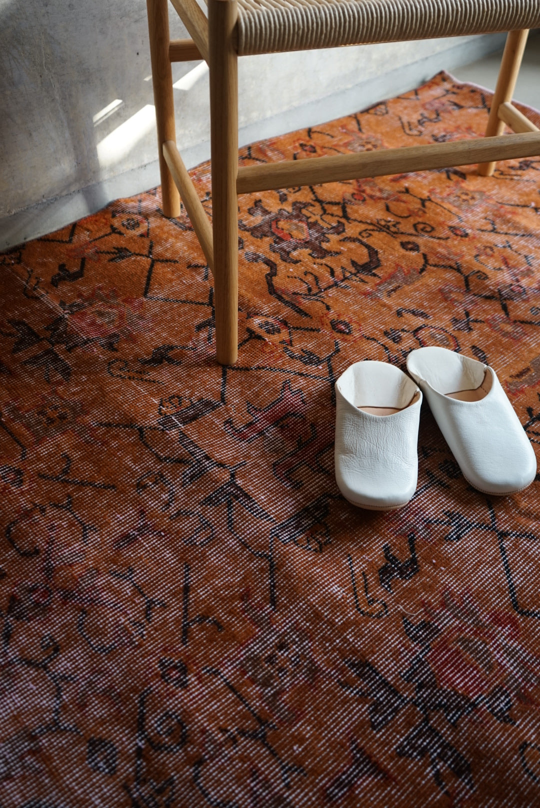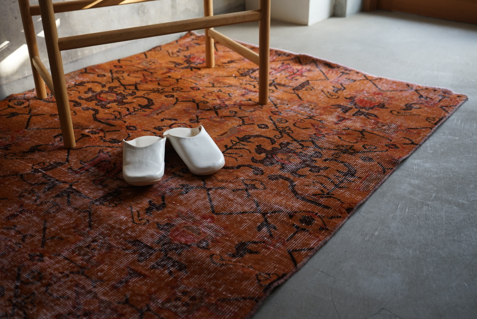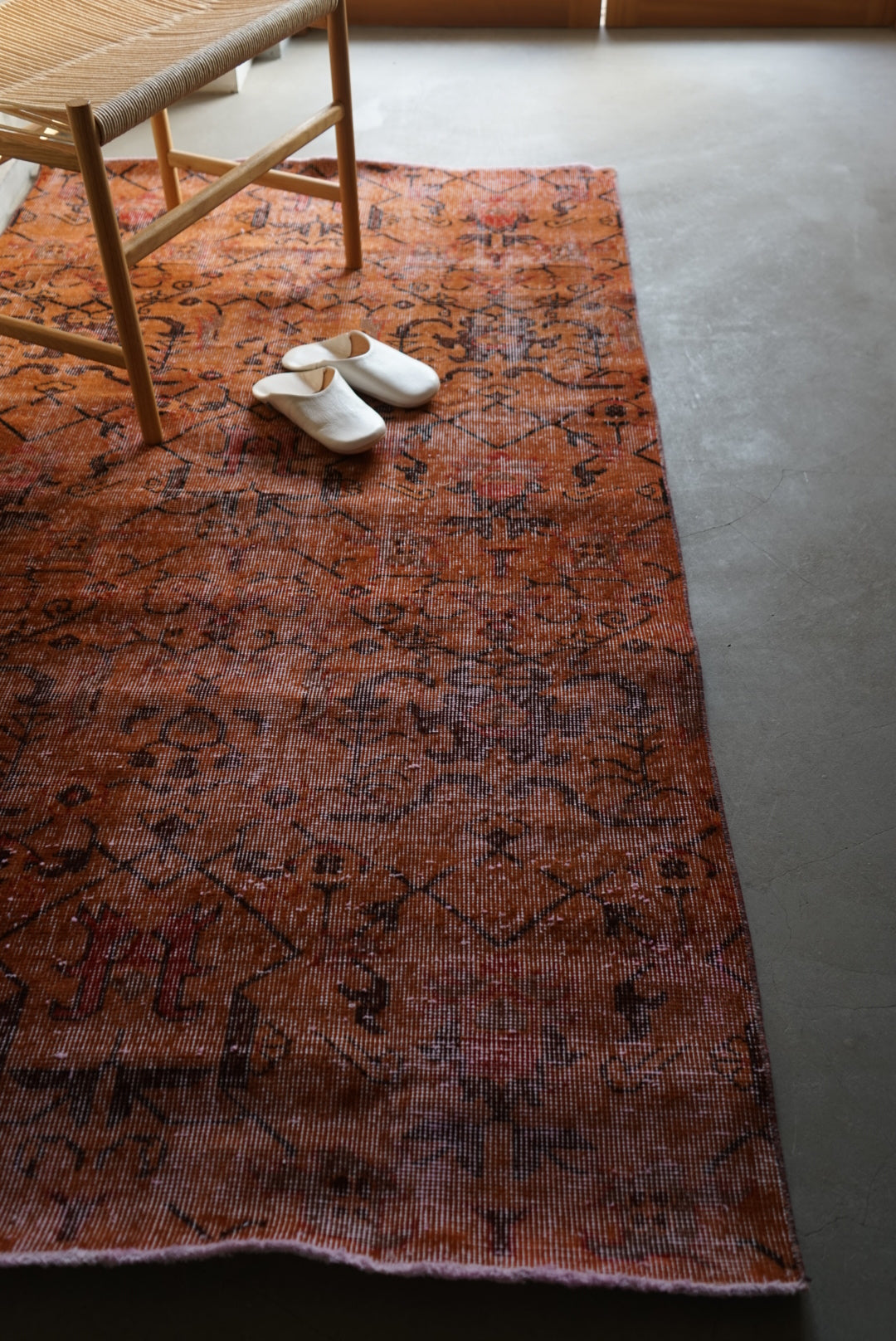 深みのあるオレンジのオーバーダイラグです。お部屋に広がると大ぶりな草花模様が空間を大胆に彩ってくれます。