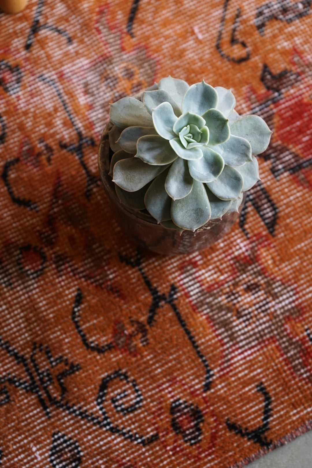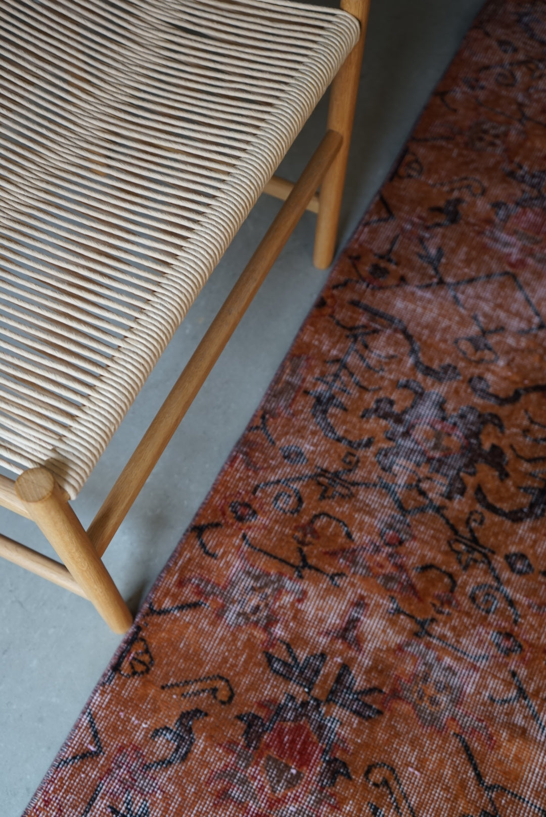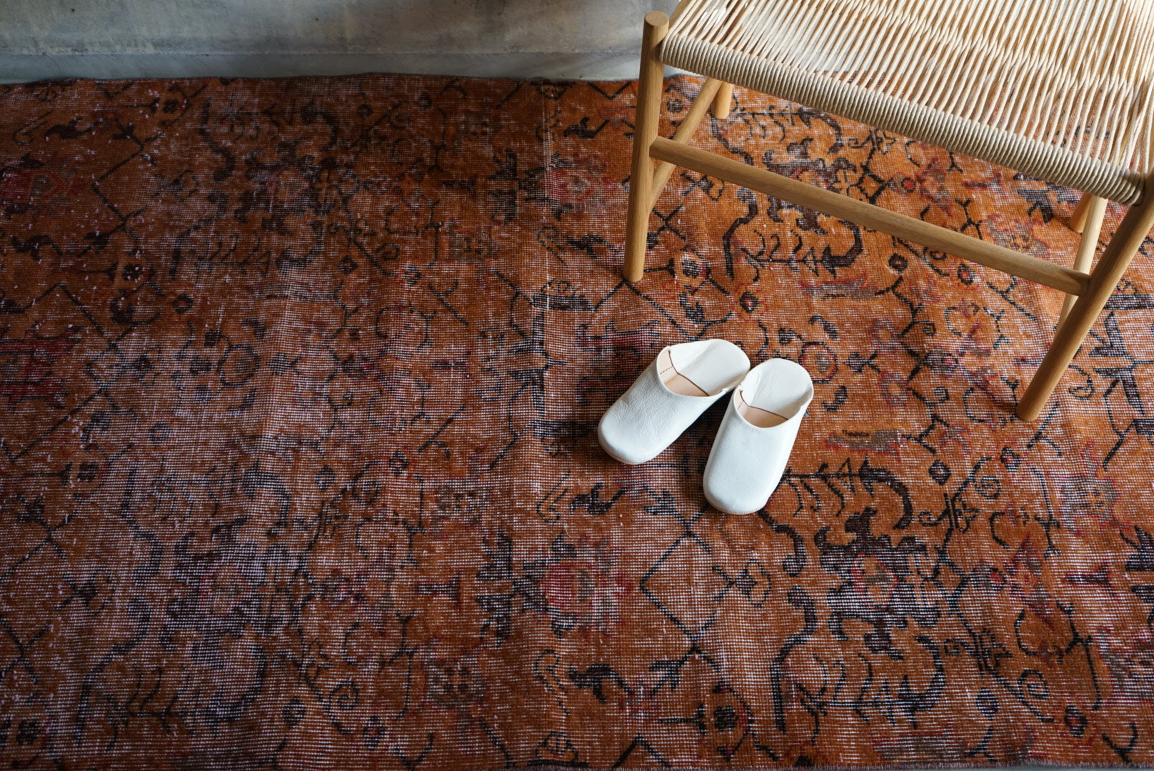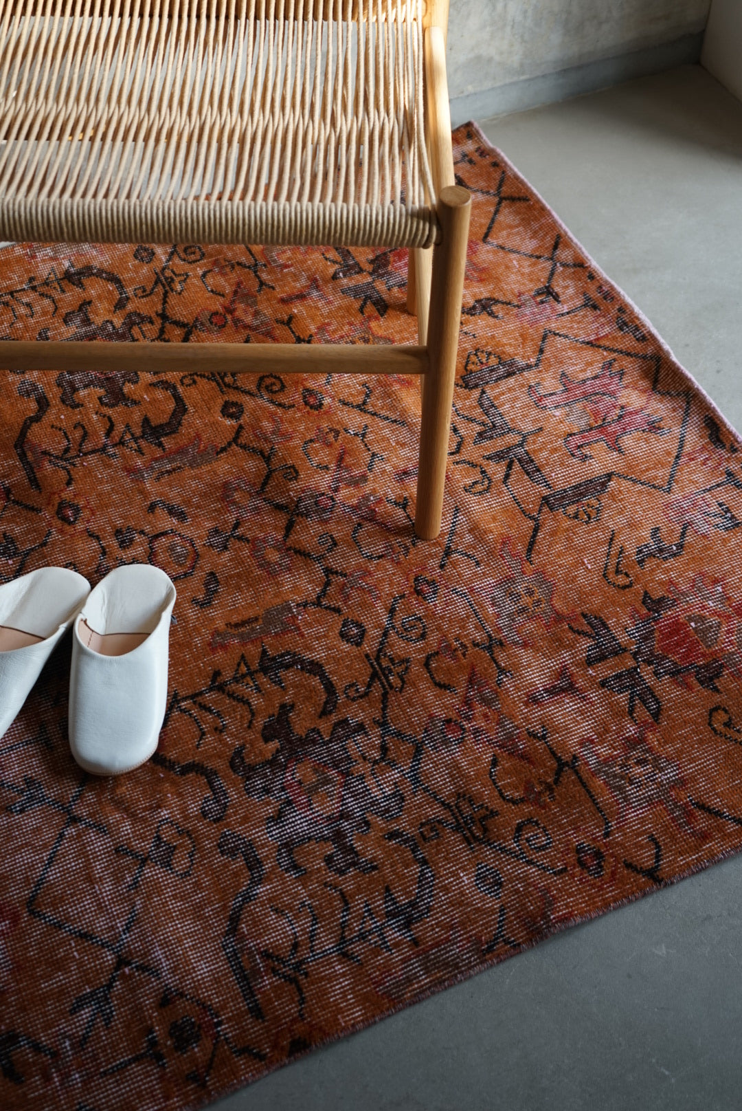深みのあるオレンジのオーバーダイラグです。お部屋に広がると大ぶりな草花模様が空間を大胆に彩ってくれます。