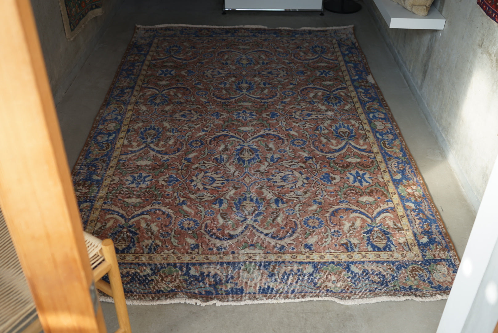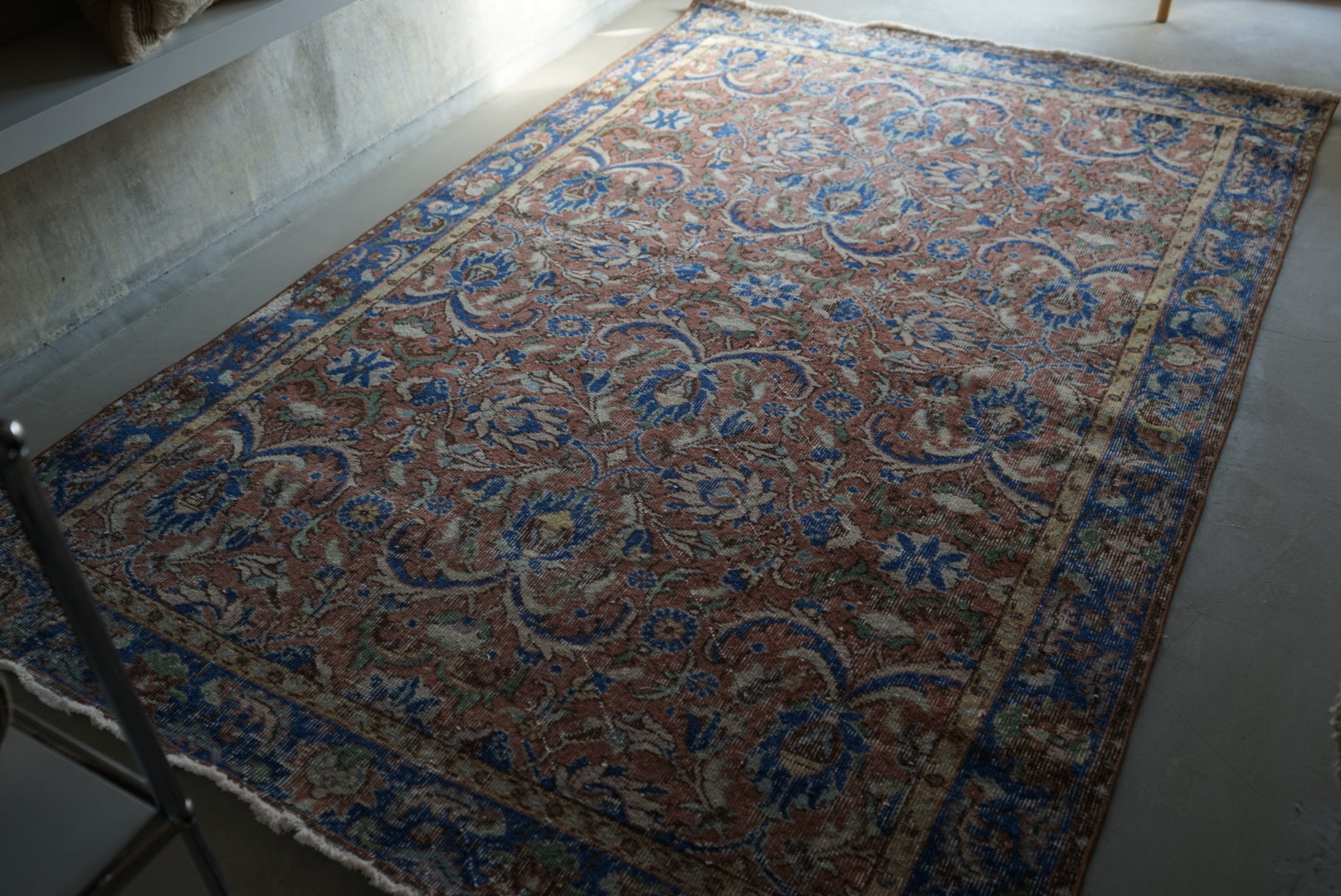 くすんだ緋色のイスパルタ絨毯です。お部屋に広げると大ぶりな草花模様が空間を大胆に彩ってくれます。