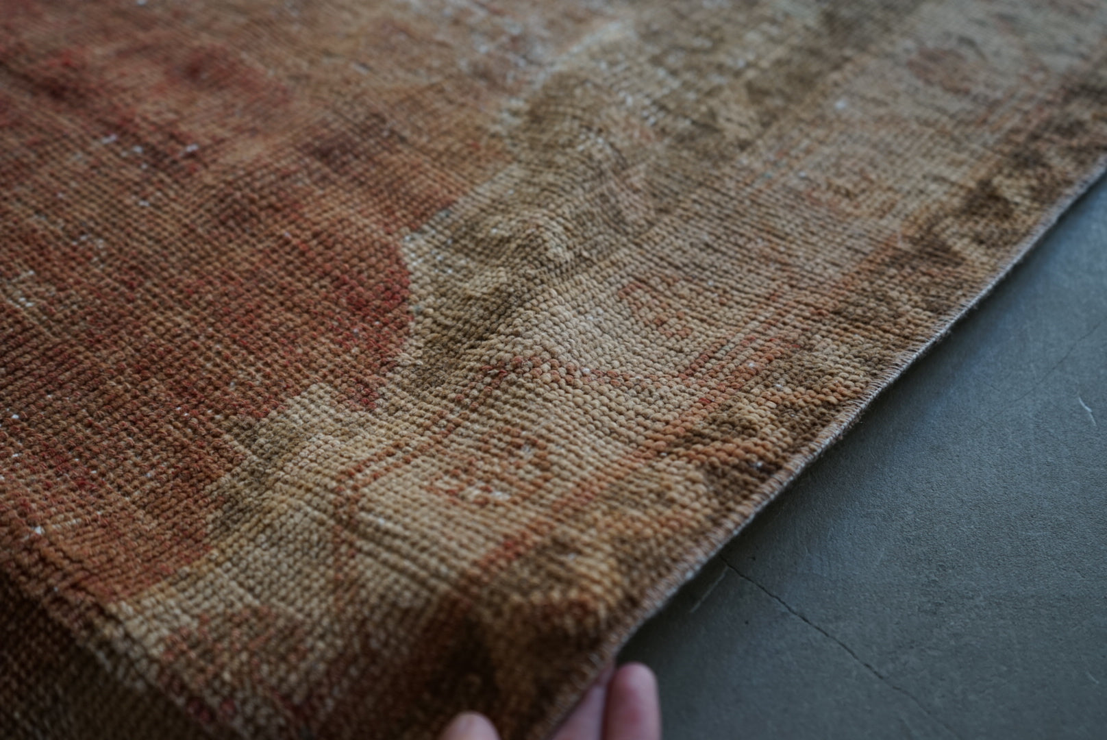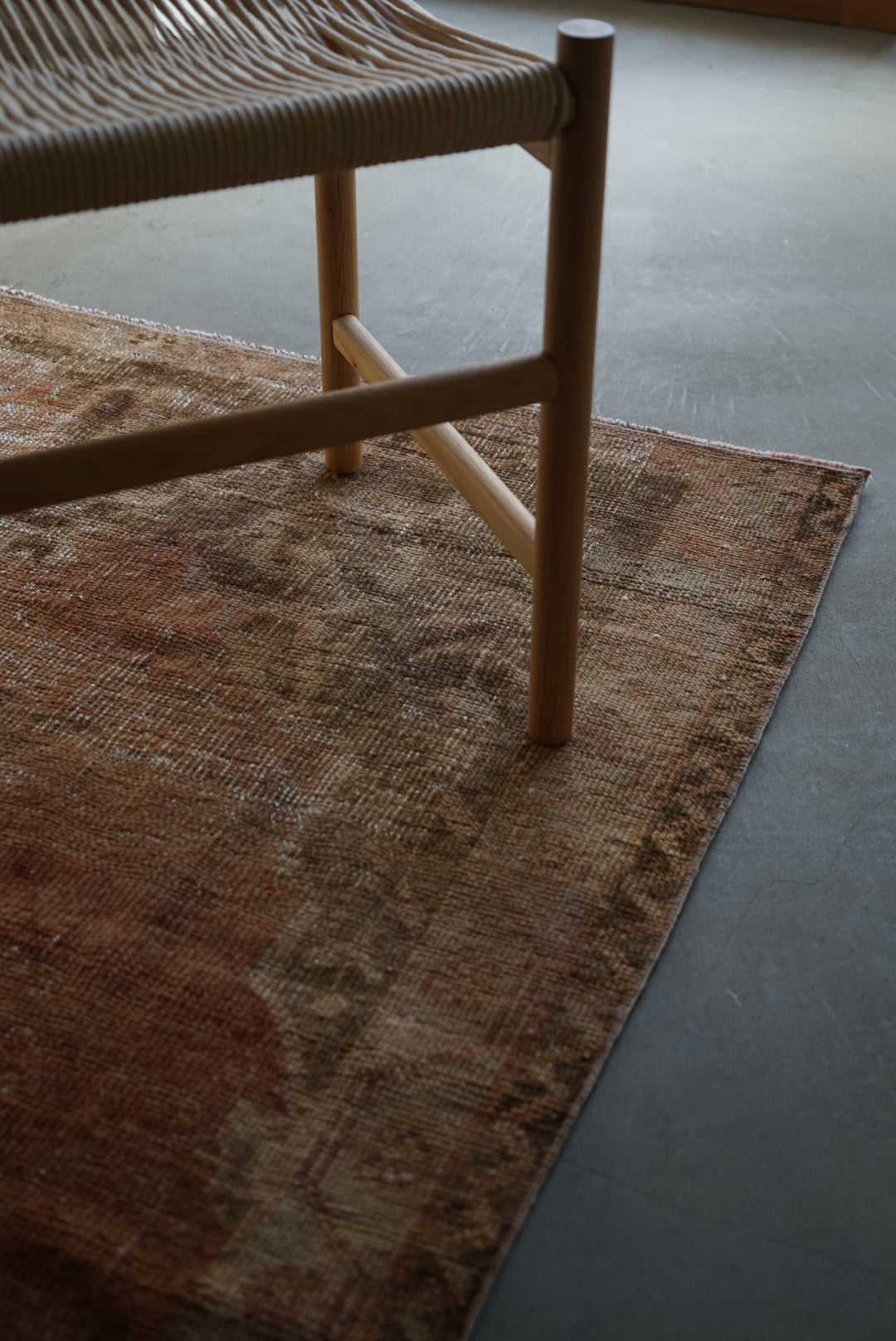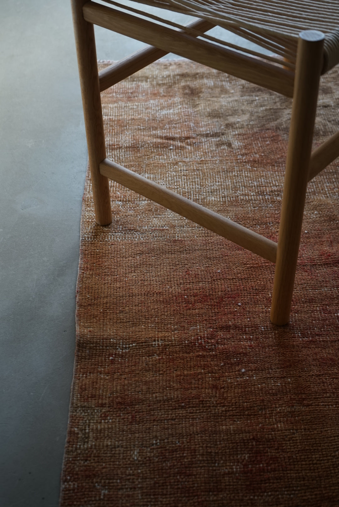 優しくて穏やかな表情のウシャク絨毯。まるで夕焼けのようなエネルギッシュなオレンジは掠れても尚魅力的です。