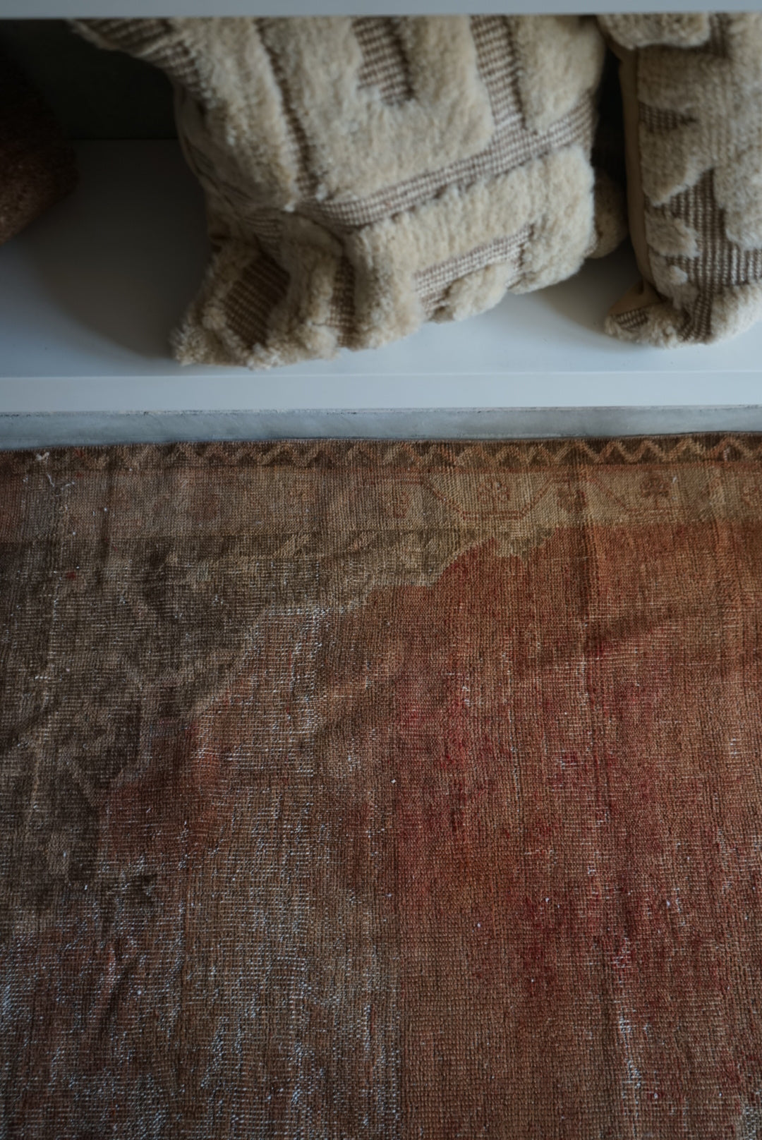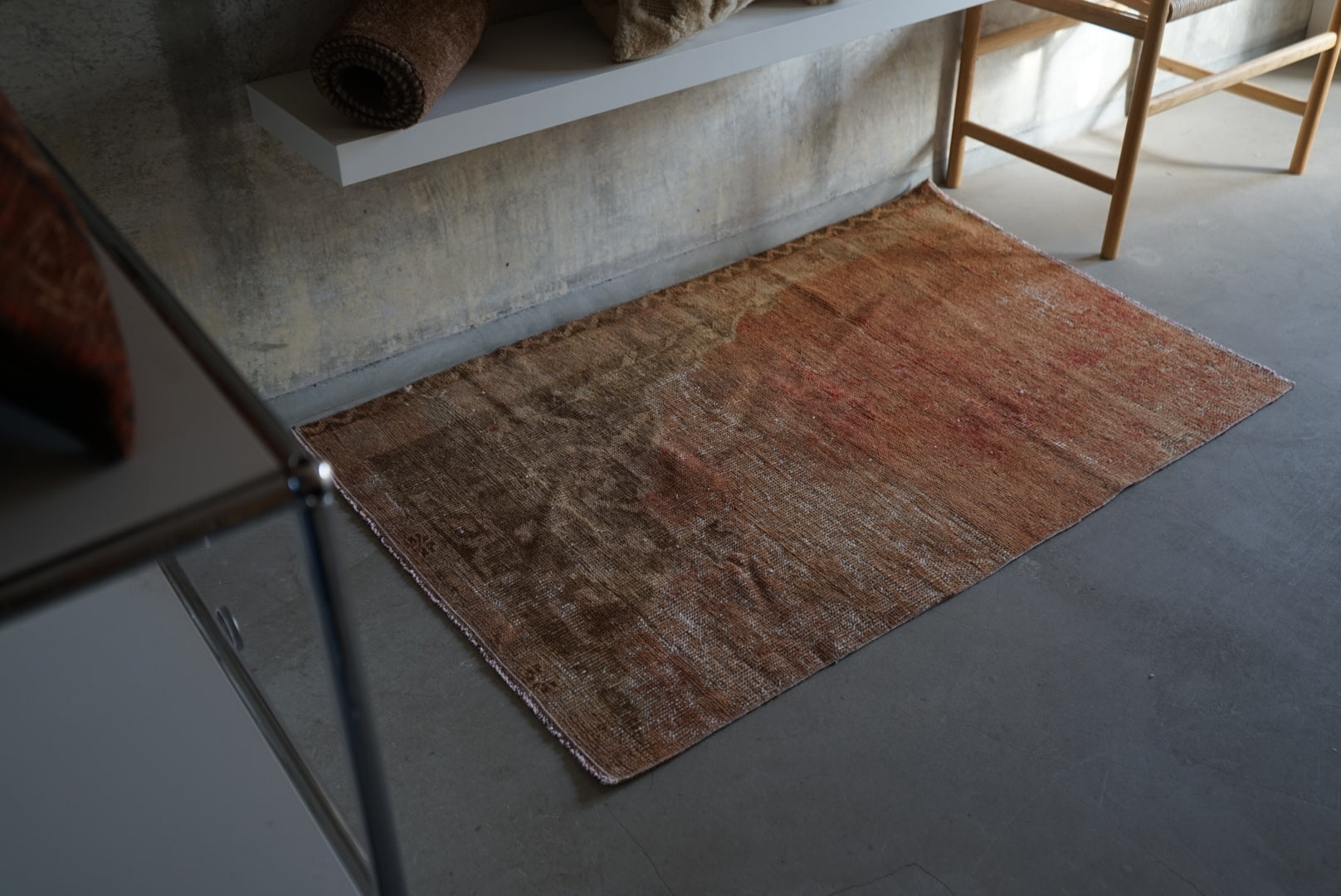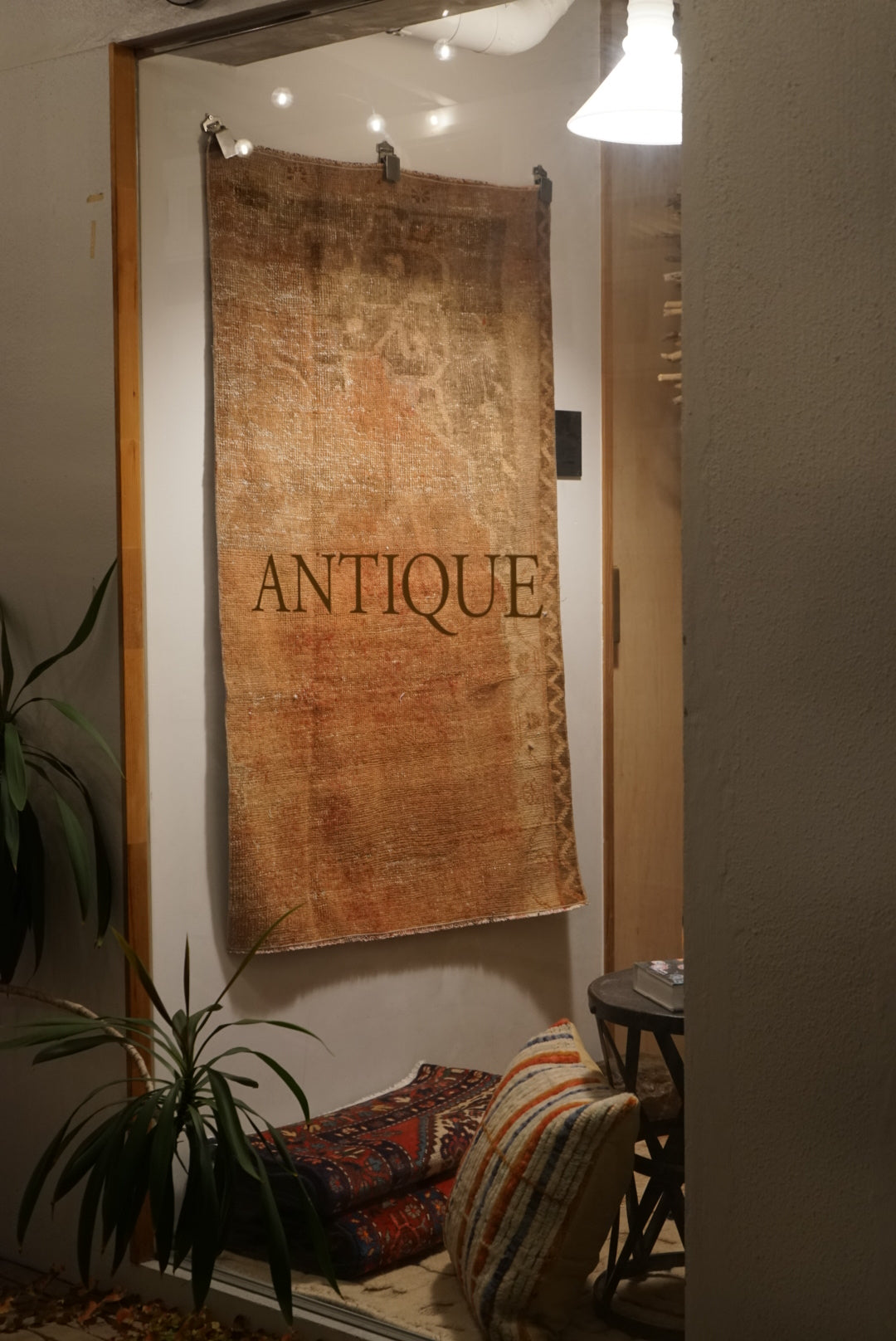 優しくて穏やかな表情のウシャク絨毯。まるで夕焼けのようなエネルギッシュなオレンジは掠れても尚魅力的です。